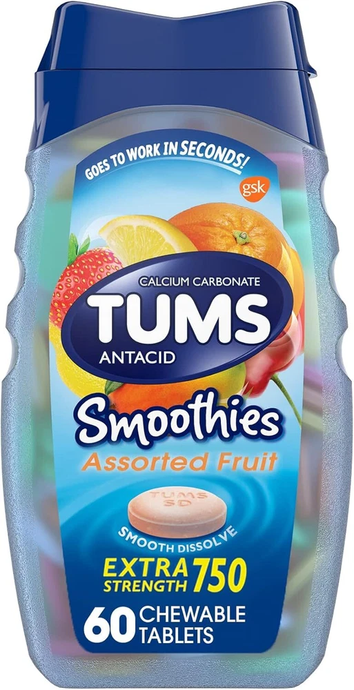 TUMS Smoothies Extra Strength Antacid Chewable Tablets for Heartburn Relief, Assorted Fruit - 60 Count (Pack of 1)