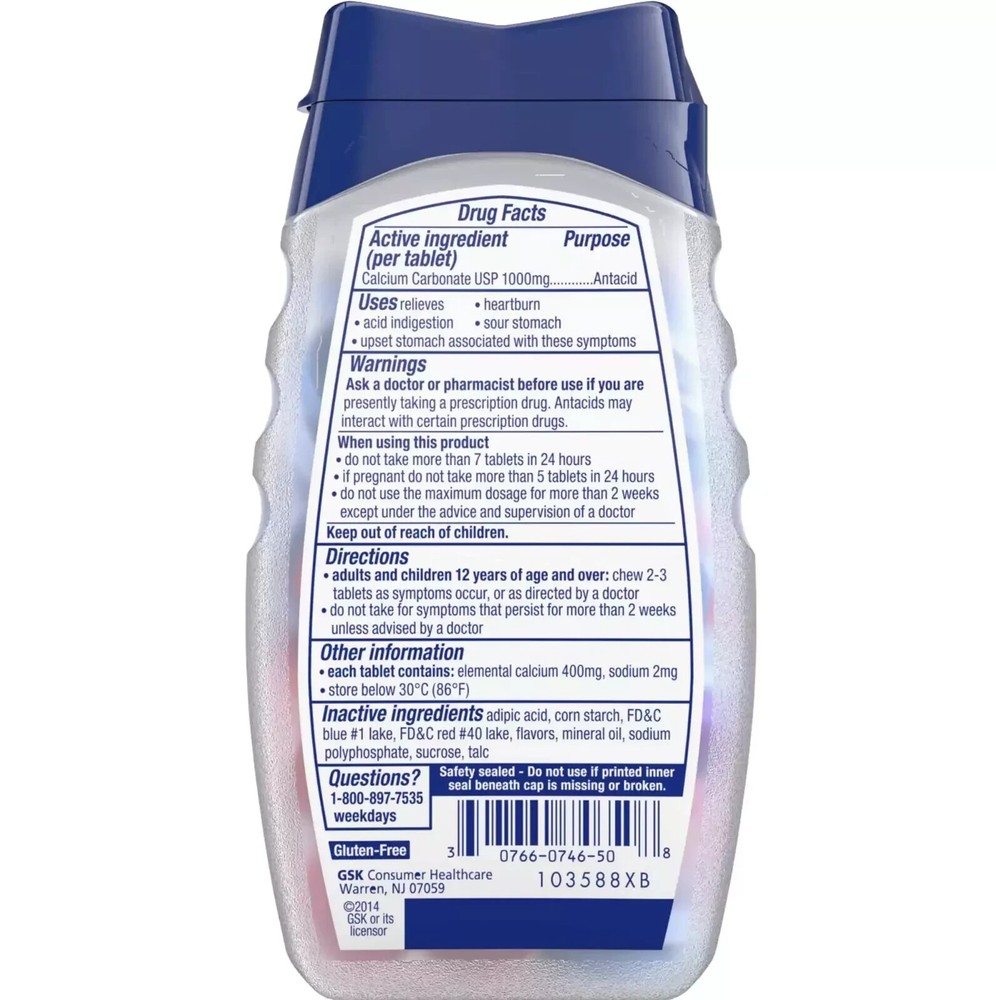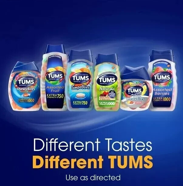 TUMS Ultra Strength 1000 Assorted Berries Chewable Tablets - 72 Count : TUMS Ultra Strength Chewable Antacid Tablets go to work in seconds by starting to neutralize acid on contact to bring fast and powerful ultra strength, chewable heartburn relief. When symptoms occur, chew and swallow two to three ultra strength tablets, depending on the severity of your acid indigestion. Featuring the active ingredient calcium carbonate, these antacids provide heartburn, acid indigestion and sour stomach relief, as well as upset stomach relief associated with these symptoms. TUMS antacid tablets are the number 1 recommended adult antacid brand by doctors, pharmacists and OB-GYNs. As America's number 1 antacid and trusted as a heartburn medicine for 90 years, TUMS is fully supported with a satisfaction guarantee. These calcium carbonate tablets are gluten free and kosher. Packaged in a resealable bottle, this heartburn and acid indigestion relief medicine is convenient to keep in your car or office for whenever heartburn strikes. Choose TUMS Ultra Strength 1000 mg antacid tablets for fast acting heartburn relief, at home or on the go.