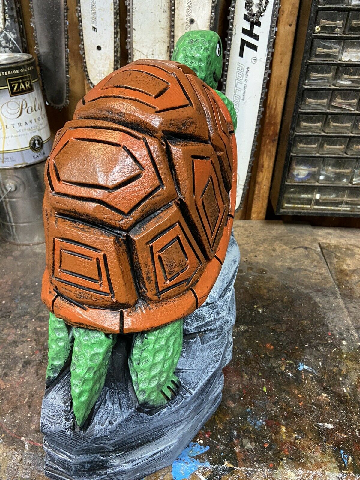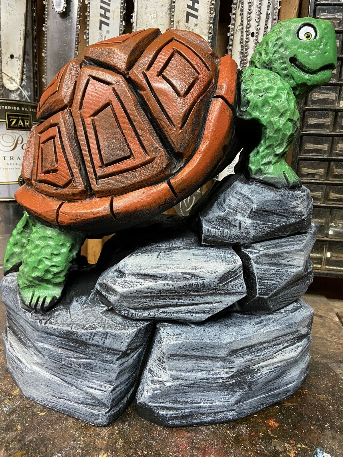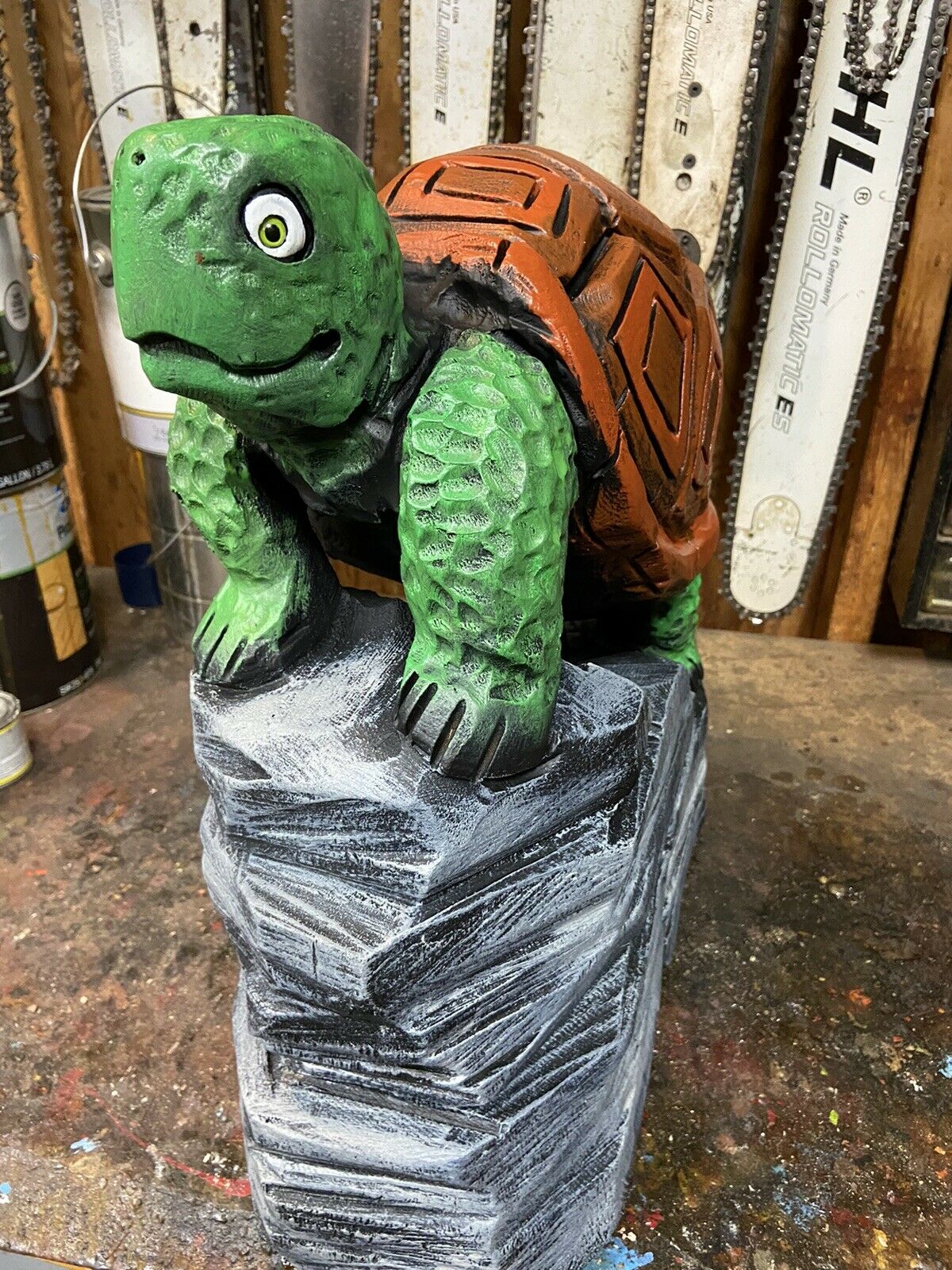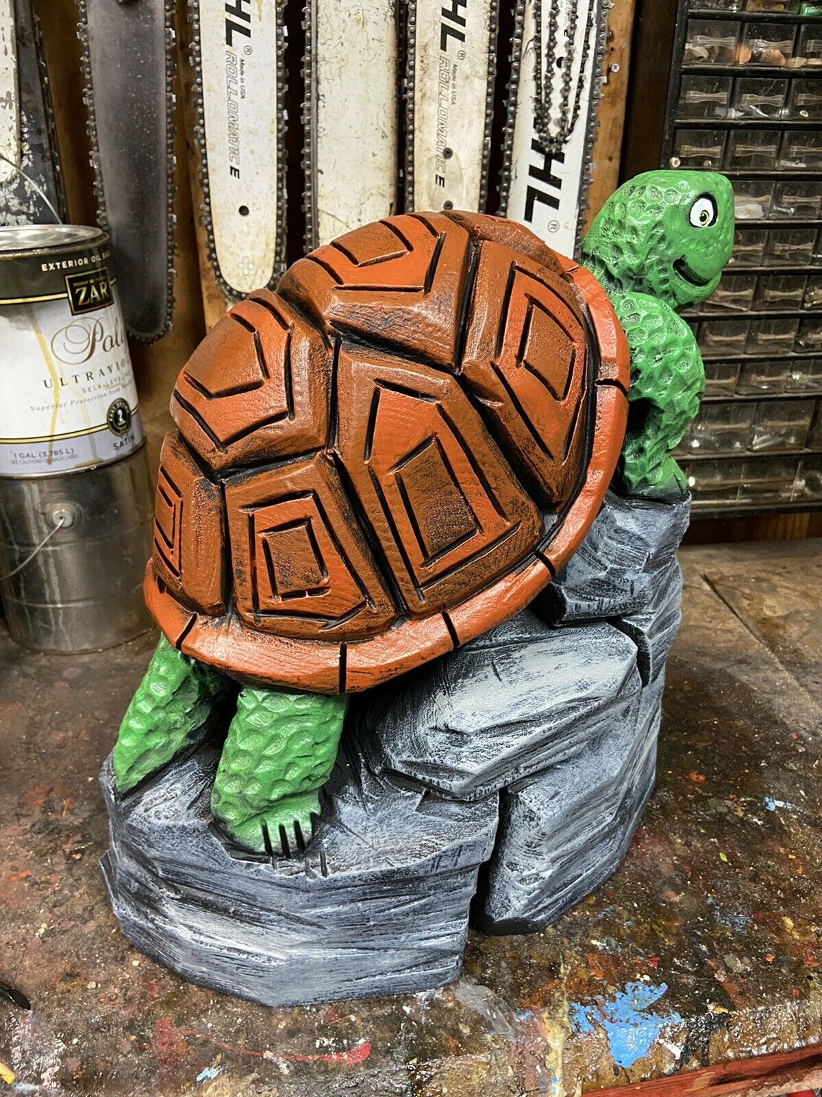 ~ YOU WILL RECEIVE THE EXACT ITEM PICTURED ~ MAKES A UNIQUE GIFT ~ ONE of a KIND! CHAINSAW CARVED TURTLE ON ROCKS, TORTOISE WOOD CARVINGS Statues UNIQUE ARTWORK, VERY DETAILED CHAINSAW CARVINGS, ANIMAL WOOD SCULPTURES, RUSTIC LOG CABIN, POND DECOR, GARDEN DECOR, OUTDOOR DECOR, HOME DECOR, BIRD & WILDLIFE WOOD CARVINGS. CARVED FROM WHITE PINE WOOD BURNED & SEALED\ STAINED WITH ZAR OIL BASED EXTERIOR POLYURETHANE & HAND PAINTED Appx: 18"(Tall=Base to top of Head), 18"Wide (across base), 24 LBS. OUR CARVINGS ARE MADE FROM RECYCLED TREE STUMPS & LOGS. A BIT OF CHECKING (CRACKING) IS THE NATURE OF LOG ART. TO KEEP CRACKS TO A MINIMUM PLACE YOUR CARVING AWAY FROM EXCESSIVE HEAT OR SUN. AN IDEAL PLACE FOR A WOOD CARVING IS OUTDOORS UNDER AN OVERHANG OR IN SHADE EACH PIECE IS UNIQUELY HANDCRAFTED BY ARTIST JAMES HAGGART; NO 2 ARE EXACTLY ALIKE; ANY QUESTIONS PLEASE MESSAGE US ***PLEASE NOTE; RETURNS ONLY ACCEPTED IF ITEM WAS GROSSLY MISREPRESENTED*** ***PLEASE BE SURE TO CHECK OUT OUR OTHER AUCTIONS***