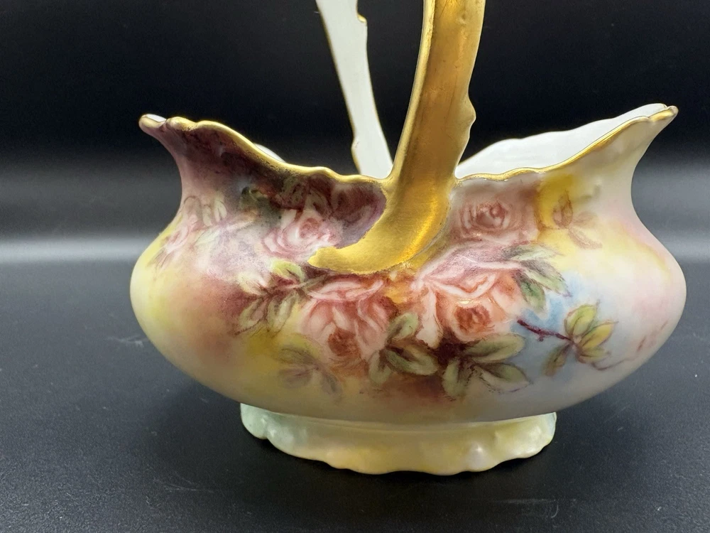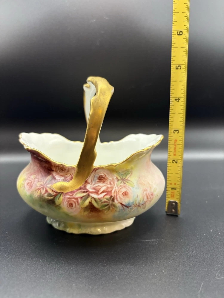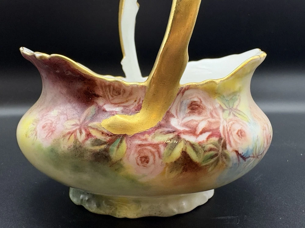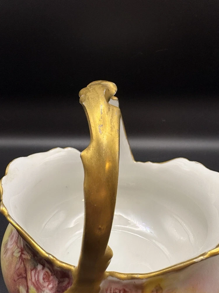 This product is a T&V Limoges Porcelain Hand Painted Basket, originating from France. The basket features intricate hand-painted details, with a gold accent and a beautiful rose flower design. Made from high-quality porcelain, this original piece showcases the craftsmanship and elegance of Limoges, making it a unique and exquisite addition to any collection or decorative display. There is some slight fading on the gold of the handle. The item is signed on the bottom by All items are sold as is. We do our best to photograph any imperfections and list marks, scratches, or any other damage in the description. If you have any questions regarding an items condition please feel free to send us a message.