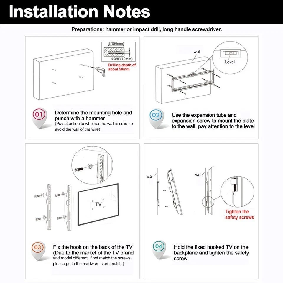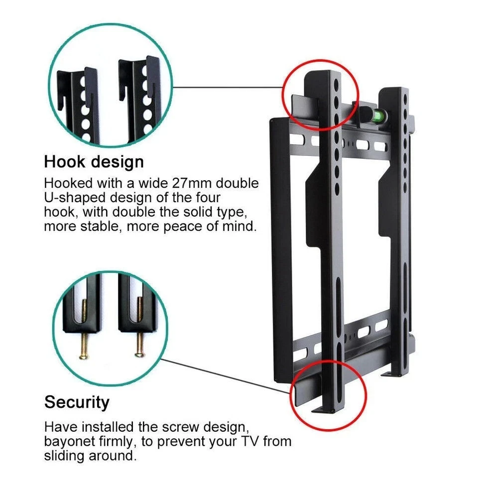 Description Features: Quick and easy to install - Bracket comes completely with full instructions and free fitting hardware kit. Spirit Level Bubble for ease of fitting and to be sure TV is level. Safety screw is used to avoid the movement of TVs after you hang it on the wall bracket. Compatible with 99% of brands including: Sony, Samsung, LG, Panasonic, Phillips, Toshiba, Sharp, Mitsubishi, Sanyo, JVC, Logik, Digihome, Technika etc. TV Size For 14 - 42" Wall Distance : 25mm Bubble Spirit Level : Yes Measured bearing : 30 KG ( 99LBS ) Spirit level & Safety screw : Included Vesa Size Fits : 200x200mm , 75x75mm TV Size For 26 - 63" Max load capacity: 50kg Suitable for VESA Size: Min : 200x200mm Max:400x400mm Bracket distance from the wall: 80-420mm TV Size For 32 - 80 " Suitable for VESA Size: Min : 100x100mm Max:600x400mm Max Load Capacity : 75Kg (170lb) Wall Profile: 22mm Material: Heavy duty reinforced steel Installation: Solid Wall Package Including : 1 x TV Wall Bracket Mount 1 x Standard Fitting Hardware Kit