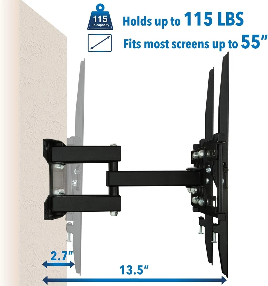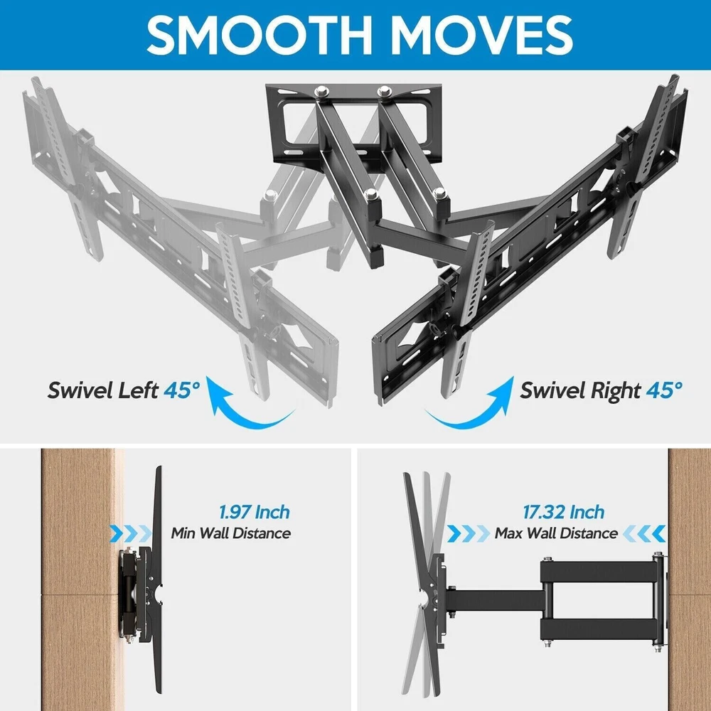 xiu Details Description Universal TV Mount - This TV wall bracket fits most 32 42 47 50 55 60 65 70 75 80 inch TVs with VESA patterns from 100x100mm to 600x400mm and holds up to 77 lbs. /35kg. Please CHECK TV weight, size, VESA, wood stud location, and input access before purchase. Optimised Viewing Experience - The full motion TV mount can swivel left or right 90°, tilts up 5°, tilts down 13°, and has +3°/-3° screen level adjustment capability. The swivel TV wall mount gives you the maximum flexibility to point your TV where you want. Perfect Center Design - Single stud TV mount is easy to center the TV or mount in the corner to save space. Articulating wall mount made of heavy duty steel ensures the strong arms to hold your TV stable. Automatic robot welding tech makes the whole TV mounting bracket sturdy and safe. Easy Installation - The wall TV mount comes with hardware mounting kit and step-by-step instructions for easy installation within 10 minutes. Concrete Anchors will be sent per request. All our wall mount TV brackets can not be installed on drywall alone. Shipping Payment Return About Us 1.The shipping rates listed are only for residential or commercial destinations in the continental 48 United States. All international sales will go through eBay Global Shipping Program.please ask us if there are any questions. 2.We only ship the item to the address that is sent to us at the time of checkout. Please verify the correct shipping address in your PayPal account before making your payment. If we ship your item to an old or invalid address and you are not able to locate the item, we are not responsible for shipping a replacement. 3.Currently, we do not ship to Hawaii, Alaska, Puerto Rico,APO/FPO/PO Boxes. 4.We use USPS, UPS & FedEx as shipping method. 5.Payments cleared before 12 PM PST, will be shipped on the same day. 1.We accept PayPal and all forms of credit card. 2.We will only ship to the confirmed Paypal shipping address given with the payment. 3.We do not offer local pick up service. 1.30 days Money Back Guarantee. 2.If any package that needs to be returned, please contact our customer service first to receive a RMA form. 3.All return items MUST be in brand new condition. 1.Specialized in aftermarket auto parts since 2018, we source and work directly with professional manufacturers to provide the highest quality parts at the most economical prices. 2.We also has over 5 years of shipping experience with FedEx and USPS . Our Packing Quality is Guaranteed , Item Ship-ping is timely! On Aug 12, 2024 at 08:24:45 PDT, seller added the following information: On Oct 22, 2024 at 05:18:48 PDT, seller added the following information: On Oct 28, 2024 at 21:08:19 PDT, seller added the following information: