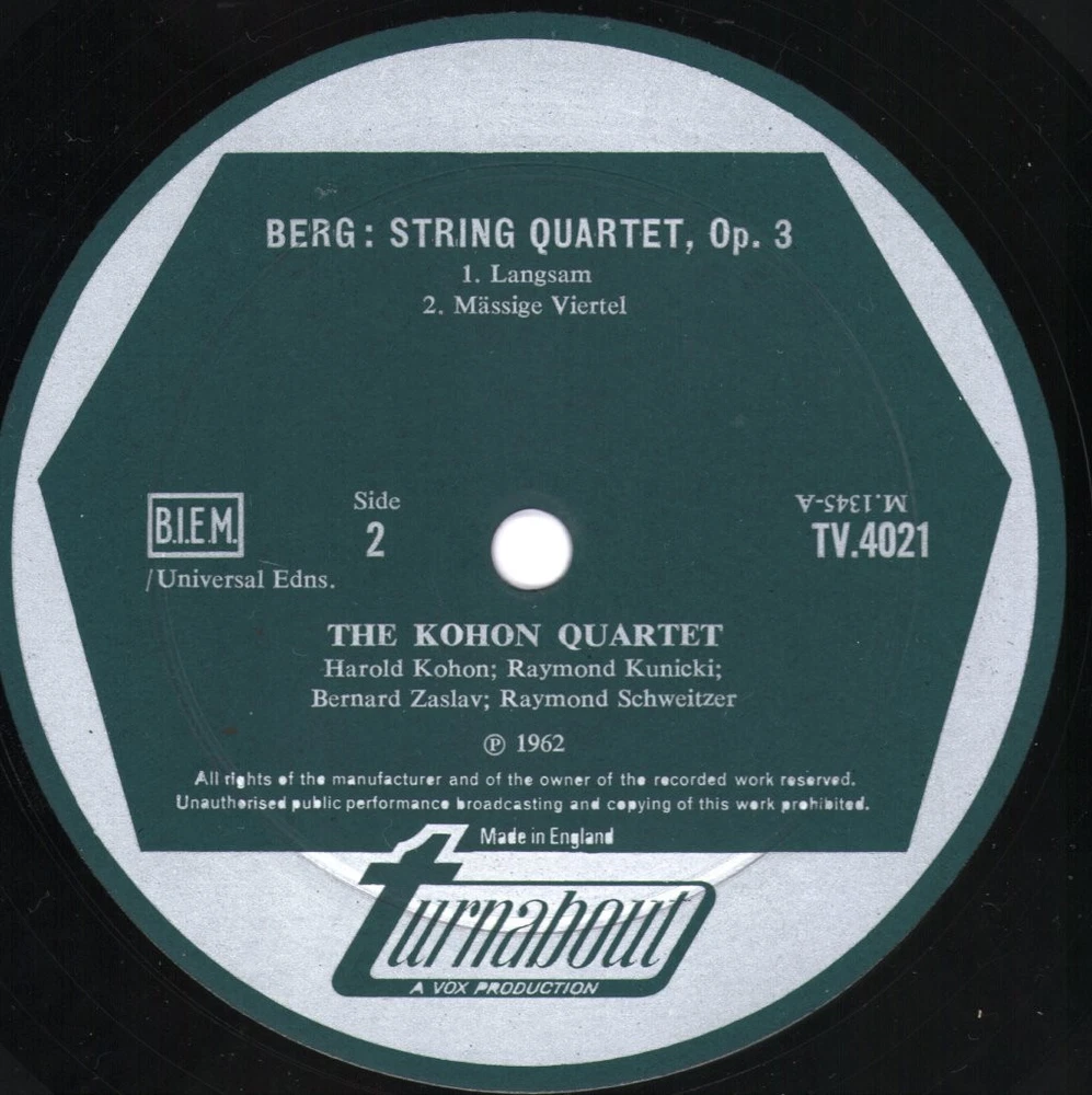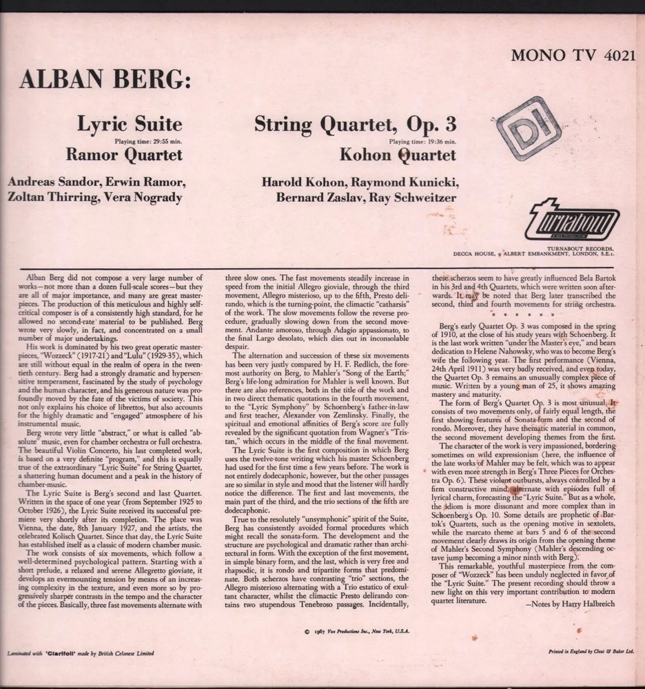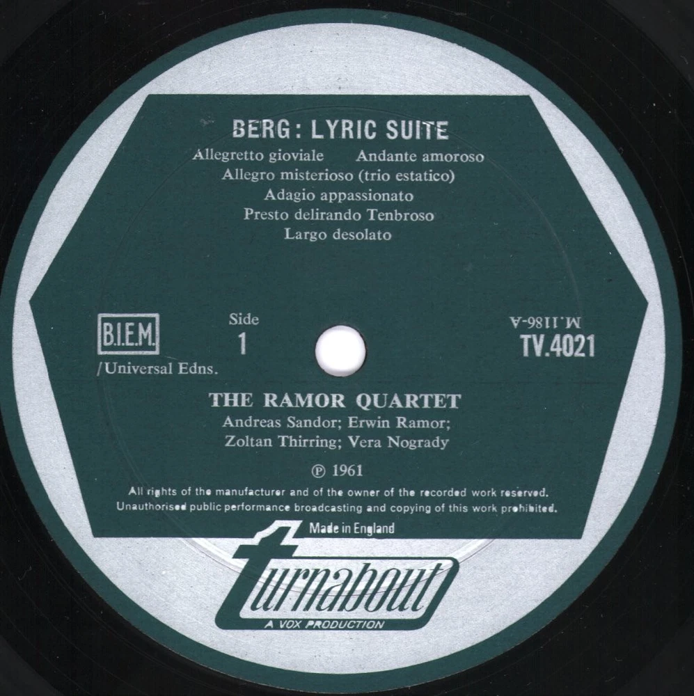 GRADING Our Grading System The table below is an overview of how our grading system works. The first grade is for the sleeve and second grade is for the media/disc, e.g. VG+/EX means that the item's sleeve is in Very Good Plus condition and the media/disc is in Excellent condition. If there is only one condition, e.g. /EX, it means that the item is not in a picture sleeve and that the media/disc is in excellent condition. Records that aren't in picture sleeves will either be in a company sleeve or a generic plain sleeve. If you have any questions, please get in touch. Condition Sleeve Media MINT (10/10) Mint, perfect Mint, perfect EX+ (9/10) Excellent plus, near mint Excellent plus, near perfect EX (8/10) Excellent, well looked after, clean, only slight signs of use Excellent, well looked after, clean, only slight signs of use EX- (7/10) Excellent minus, light wear and signs of use Excellent minus, light wear and signs of use VG+ (6/10) Very good plus, some moderate wear Very good plus, some scuffs, no deep marks VG (5/10) Very good, well used and worn Very good, well used and marked VG- (4/10) Very good minus, very worn Very good minus, very worn and marked GOOD (3/10) Good, some major wear Good, some major wear and scuffing FAIR (2/10) Fair, major wear Fair, major wear and scuffing POOR (1/10) Poor, severe wear Poor, severe wear and scuffing DELIVERY Combined Postage If you add all the items you wish to purchase from us to your shopping basket/cart, and then go to the checkout page from the shopping basket page, the shipping cost will be automatically combined. Packaging All of our items are parcelled using strong specially designed packaging, each vinyl in an order is placed in a clear plastic sleeve and plain paper white sleeve, and is separated from its cover (unless it is advertised as sealed), to prevent any damage during transit. If an item is sealed, and you would prefer the vinyl to be placed outside of its sleeve before dispatch, please let us know. Prices You can see all delivery options and prices for an item on the "Postage and payments" tab. Tracked delivery If you wish to have a tracking number with your order, please select the "Signed" or "Express" delivery option, "Standard" delivery does not include a tracking number. SHOP Click here to view our Ebay shop, with over 200,000 items in stock FAQ Does a used item include the original inner sleeve/insert/poster etc.? We will always include in the description if a used item includes any additional parts, e.g. "with inner" or "includes poster", if you know an item originally came with any additional parts, such as a printed inner sleeve, and it isn't mentioned in the description, then generally the used item won't include it, but please feel free to ask. New items will always be complete, unless otherwise specified. CATEGORIES Shop Home 10" Vinyl Records 12" Vinyl Records 7" Vinyl Records Cassettes (Tape) CDs (Compact Discs) LP Vinyl Records Music Memorabilia Other Artist Ramor Quartet / Kohon Quartet of New York University Title Berg - Lyric Suite For String Quartet / String Quartet, Op. 3 Format LP Vinyl Country UK Label Turnabout Catalogue Number TV4021 Year 1967 Description 3 track mono - sleeve has marks and D1 stamped on back Condition (Sleeve/Disc) VG+/VG+ Track List A. Allegretto Gioviale - Andante Amoroso - Allegro Misterioso (Trio Estatico) - Adagio Appassionata - Presto Delirando Tenbroso - Largo Desolato B1. Langsam (9:23) B2. Mässige Viertel (10:04) DELIVERY INFORMATION If you wish to have a tracking number with your order, please choose the Signed or Express delivery option, the Standard delivery option does not include a tracking number. Please note, the Express option for delivery outside of the UK includes a tracking number, but has the same delivery time as the Standard option. ABOUT US Vinyl Tap has been in the business of selling music for over 30 years, and in that period we have supplied many thousands of collectors and music fans around the globe with vinyl, CDs and music memorabilia. You can check out the over 200,000 items that we have in stock on our Ebay shop, here . Artist: Ramor Quartet / Kohon Quartet of New York University - Title: Berg - Lyric Suite For String Quartet / String Quartet, Op. 3 - Format: LP Vinyl - Country: UK - Label: Turnabout - Catalogue Number: TV4021 - Year: 1967 - Description: 3 track mono - sleeve has marks and D1 stamped on back