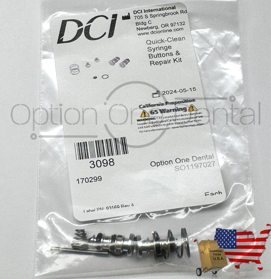 Quick-Clean Syringe Buttons & Repair Kit - DCI 3098 This package includes 2 Sets. Each sets includes : Syringe Button . 2 ea Syringe Button Spring 2 ea Tip O-Ring, 1 ea. Adapter O-Ring, 1 ea. Adapter Spring, 1 ea.