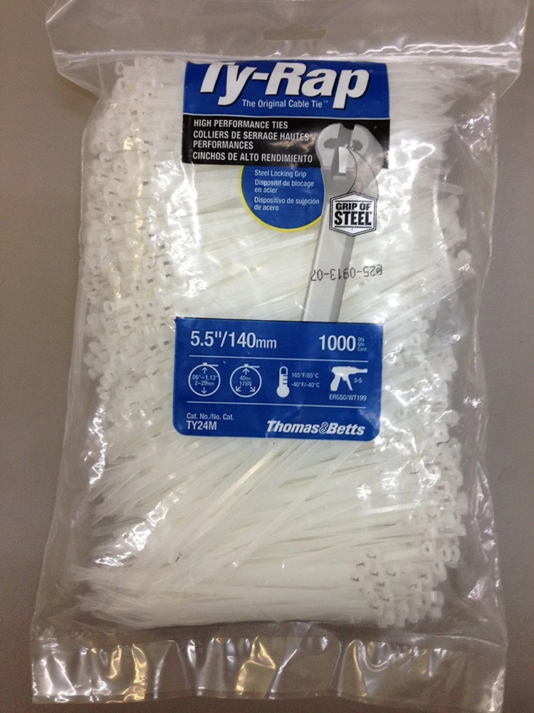5.5", 40 lb. white TY24M T&B Ty-Raps. Bundle diameter of 1.125". Made in the USA. The T&B Ty-Rap brand you know and love offers a stainless steel lock embedded in the 6/6 Nylon head for extra durability. Operating temperature -40 degrees F to 185 degrees F. UL Flame rating 94V-2. Our eBay Store TY24M Cable Tie 30lb 5.5" Natural Nylon with Stainless Steel Locking Device, 1000 Per Bag Product Details 5.5", 40 lb. white TY24M T&B Ty-Raps. Bundle diameter of 1.125". Made in the USA. The T&B Ty-Rap brand you know and love offers a stainless steel lock embedded in the 6/6 Nylon head for extra durability. Operating temperature -40 degrees F to 185 degrees F. UL Flame rating 94V-2. TY24M WARNING: This product can expose you to chemicals including lead, which is known to the State of California to cause cancer.