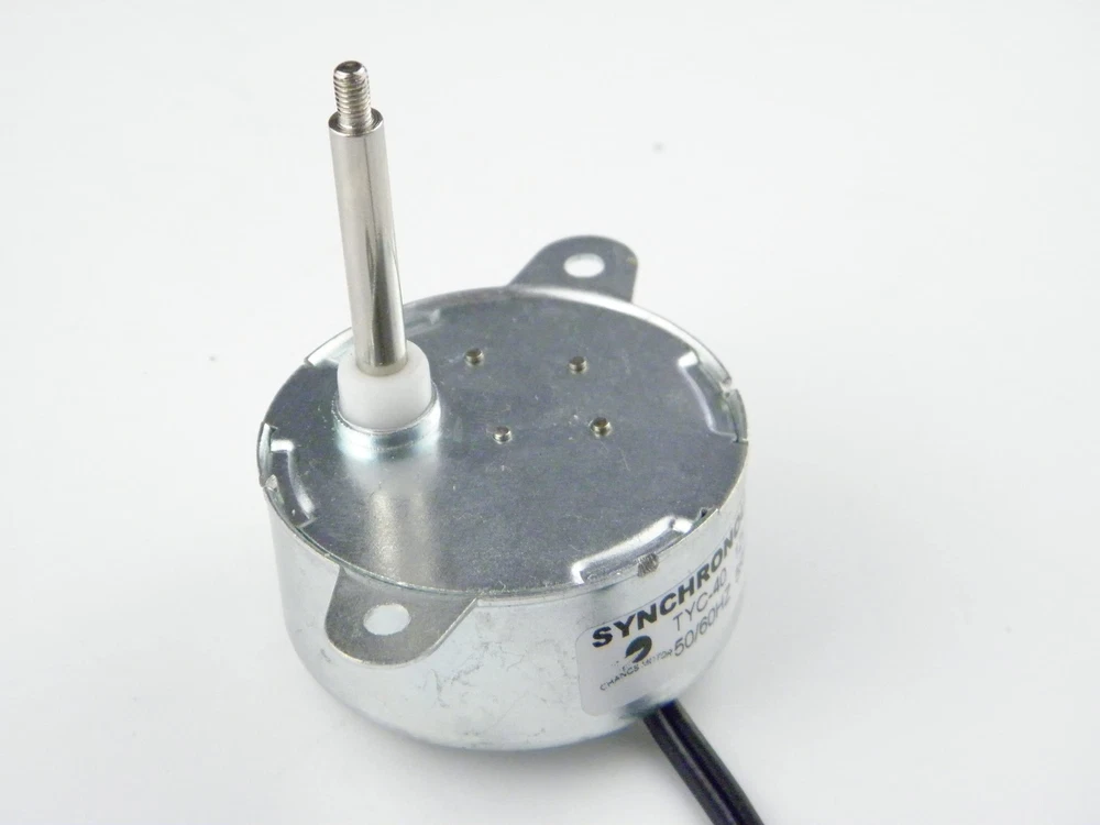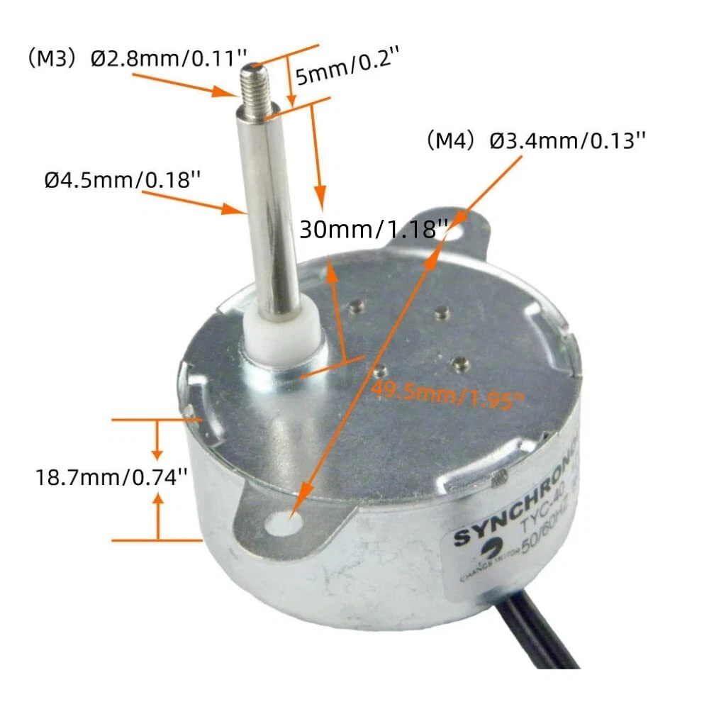 This is a TYC-40 AC 12V CW/CCW synchronous motor,small power consumption, low noise, small size, light weight, easy to use. The reduction gear is combination of metal/plastic to ensure the gear working continuously and quietly. We promise we will tested ever motor before shipment. 【Specification:】 Product Name : Synchronous Motor Model : TYC-40; Shaft Diameter: 4.5mm ; Shaft Length: 35mm; Shaft Screw Thread Inner Diameter: M3,(Φ2.8mm) Mounting Hole Diameter: (φ3.4mm); Direction : CW/CCW(UNCONTROLLAB); Torque:≤0.5kg*cm; Frequency : 50/ 60Hz; 【Application:】 Widely used in Christmas tree, hand-made, decorative colored lights, school project, fan shake heads, heaters, prayer cylinders, air conditioners, microwave ovens, glue machines, ovens, rotating lamps, tables, models, advertising, shelves, dishwashers, control appliances , curtain machines, etc. 【Attention:】 The applicable voltage of this motor is AC 12V, USING DC POWER SUPPLY, THE MOTOR DOES NOT WORK!! And too high voltage will burn the motor.If you can't judge whether your power supply is AC or DC, and you have any questions about the voltage, please ask the custcome service before buying the motor. Rotating the motor shaft with external force can easily cause gear slippage or tooth breakage, the internal directional plate trips or the gear breaks causing it to fail to work normally. 【Package Content:】 1PC x Synchronous Motor;1PC X Screw;1 PC X Wire Quick Connector This is a TYC-40 AC 12V CW/CCW synchronous motor,small power consumption, low noise, small size, light weight, easy to use. The reduction gear is combination of metal/plastic to ensure the gear working continuously and quietly. We promise we will tested ever motor before shipment. 【Specification:】 Product Name : Synchronous Motor; Model : TYC-40; Shaft Diameter: 4.5mm ; Shaft Length: 35mm; Shaft Screw Thread Inner Diameter: M3,(Φ2.8mm); Mounting Hole Diameter: (φ3.4mm); Direction : CW/CCW(UNCONTROLLAB); Torque:≤0.5kg*cm; Power: 1-2W ; Frequency : 50/ 60Hz; 【Application:】 Widely used in Christmas tree, decorative colored lights, hand-made, school project, fan shake heads, heaters, prayer cylinders, air conditioners, microwave ovens, glue machines, ovens, rotating lamps, tables, models, advertising, shelves, dishwashers, control appliances , curtain machines, etc. 【Attention:】 The applicable voltage of this motor is AC 12V. USING DC POWER SUPPLY, THE MOTOR DOES NOT WORK!! And too high voltage will burn the motor.If you can't judge whether your power supply is AC or DC, and you have any questions about the voltage, please ask the custcome service before buying the motor. 【Package Content:】1PC x Synchronous Motor;1PC X Screw ;1 PC X Wire Quick Connector