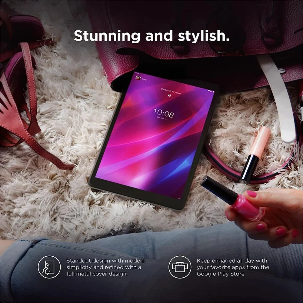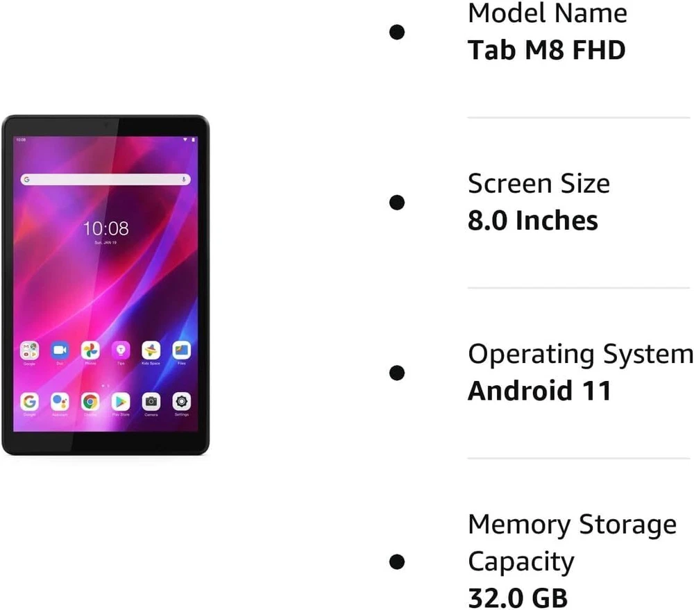 Description The Tab M8 (3rd Gen) pushes the boundaries of what's possible for tablet-based multimedia entertainment with a stunning 8" HD TDDI IPS display that features two-sided narrow borders, upgraded octa-core processors and all-day battery life housed in a full metal chassis. The built-in kids’ mode provides quality content to help kids discover, create and grow. Tech specs Microprocessor: MediaTek Helio P22T (8C, 4x A53 2.3GHz + 4x A53 1.8GHz) Graphics: Integrated IMG PowerVR GE8320 GPU Series: Tab M8 Chipset: MediaTek SoC Platform Model: ZA8 Memory: 3GB Soldered LPDDR4x Hard drive: 32GB eMMC (eMCP4x) Display: 8" HD (1280x800) IPS 350nits Glossy, Touch Ports: Google Play; Google Photos; Google Calendar; Phone by Google (cellular device only); Launcher; YouTube Music; Messages (cellular device only); Google Chrome; Tablet Manager; Netflix; Gmail; Google Duo; Bing Wallpaper; Kids Mode Wireless Technology: 11a/b/g/n/ac, 1x1 + BT5.0 Camera: Front 2.0MP / Rear 5.0MP Speakers: Single speaker, optimized with Dolby Atmos Standard Ports: 1x USB-C 2.0 (support data transfer, OTG and Power Delivery) 1x Headphone / microphone combo jack (3.5mm), 1x microSD card slot (WLAN models) Minimum dimensions (D x W x H): 7.80 x 4.83 x 0.32in Weight: 0.67lbs Color: Iron Grey Operating system: Android 11 Bundle: EAT cloth. Gratifying performance and stylish design combine in this quick, powerful Android tablet, powered by a 8 Core, MediaTek Helio P22T processor up to 2.3GHz. 3GB Soldered LPDDR3, 32GB eMMC. The stunning 8" HD (1280x800) IPS 350nits Glossy, Touch display brings your great convenience. Stay connected with 11a/b/g/n/ac, 1x1 + BT5.0, standard Ports include 1x USB-C 2.0 (support data transfer, OTG and Power Delivery), 1x Headphone / microphone combo jack (3.5mm), 1x microSD card slot (WLAN models). Android 11, there are many application in this tablet. Bundle with EAT cloth.