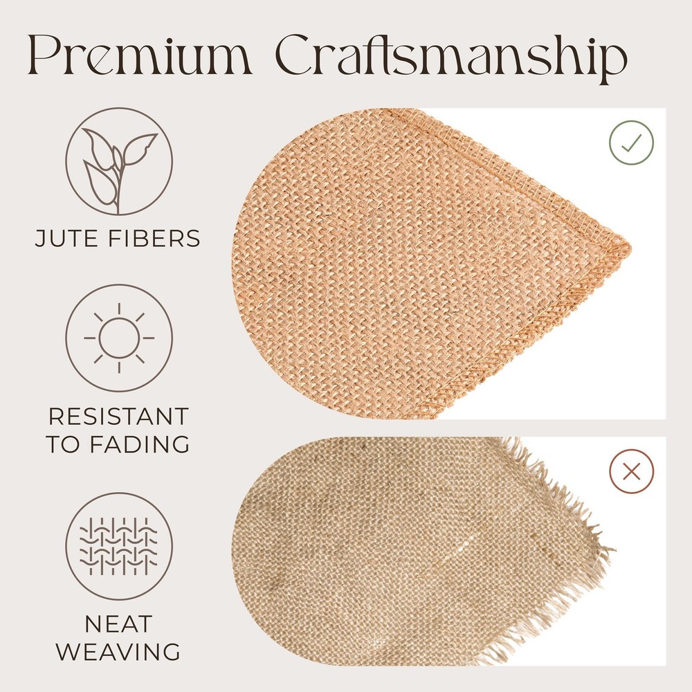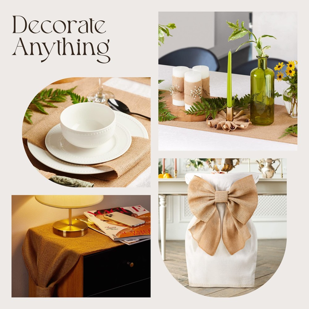 Table Runner EXTRA DENSITY FOR A RICHER LOOK. Unlike a simpler burlap table runner that has the density of 30 to 40 yarns per 10 cm, this burlap ribbon boasts a weave of 50 yarns per 10 cm that makes it look much more solid and presentable on the table. Table runners can add chic and comfort to the meal, but the trick is to get the density right: a flimsy burlap runner is shifty and often unnecessary, whereas dense jute like this is a robust and stately decoration. NEAT WEAVING AND THOROUGH STITCHWORK. The actual quality of craftsmanship is the key to a farmhouse table runner that will truly impress your guests. In this rustic table runner, EVENLY sized and carefully woven threads make the burlap material look orderly and pleasant—unlike poorer jute table runner alternatives where some threads are thicker than others, so the fabric overall appears disheveled. The burlap runner’s OVERLOCKED edges won’t snag or fray easily even if used repeatedly. RUSTIC WARMTH FOR FESTIVE MEALS. Putting a fall table runner down the center of your table (on top of a tablecloth or without it) is a simple way to create a pastoral idyll for a celebration or just for when some guests drop by. Farmhouse-inspired decorations, like a tan table runner made of burlap roll, somehow combine elegance with comfort as they are dignified but informal at the same time. ALL NATURAL! This burlap roll is made of jute fabric—the famous golden fiber that comes from a flowering plant grown mostly in Southeast Asia and that has been revered for millennia for its strength (as in the production of sackcloth) and for its esthetic appeal (like in burlap bow decorations). The kitchen table runner thus has the natural, noble golden-brown color, and it will stay that way for years as the material is highly lightfast, i.e. resistant to fading. EXPLORE YOUR CREATIVITY! Make maximum use of this long table runner: think of it as a raw material for numerous exciting things for your home and kitchen, like burlap placemats, burlap bows, a burlap garland, a burlap Christmas ribbon, burlap bows for Christmas tree, burlap gift bags, a ribbon for wreaths, wrappers for glasses and cups, flowers, lampshades, and utensil pockets. Find inspiration and experiment with other small things like these that will make your home a cozier place.