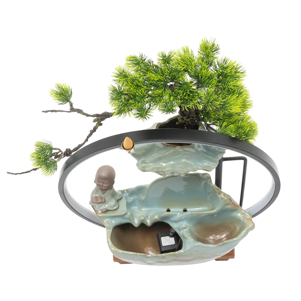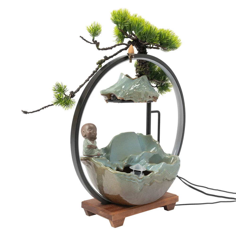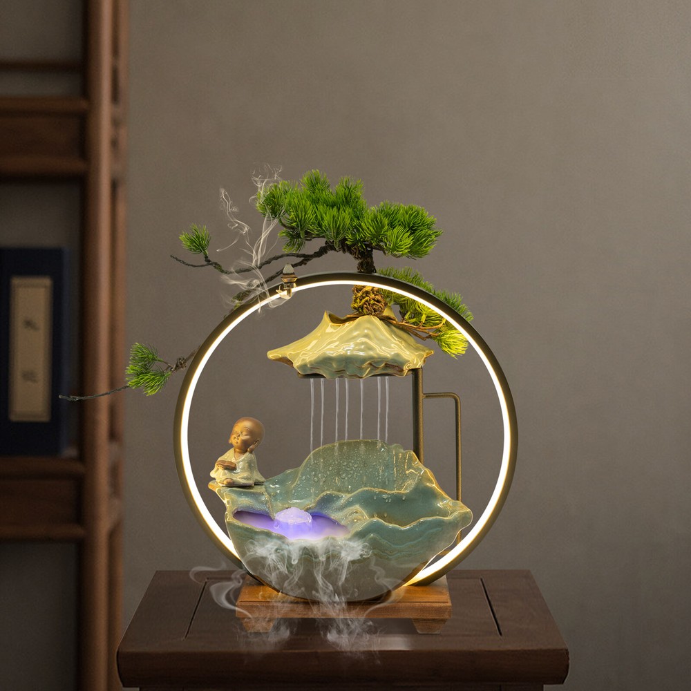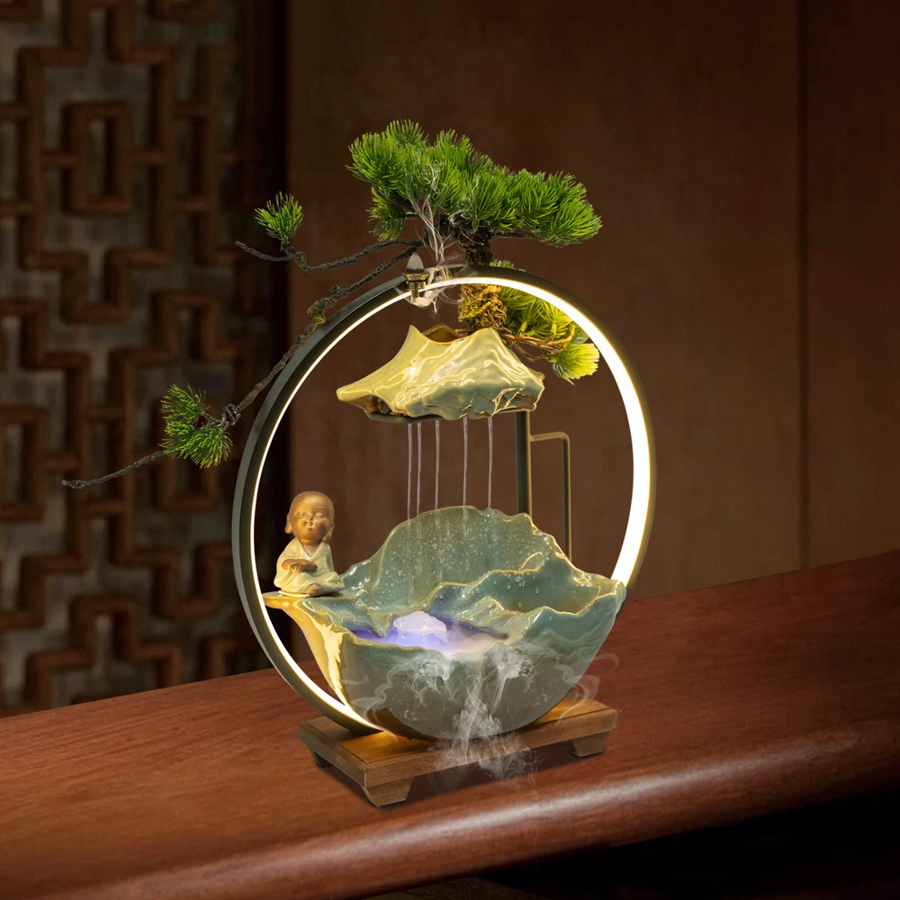 Tabletop Water Fountain Indoor Waterfall with LED Mist Desk Fountain Feng Shui Welcome Description A good ornament can soothe our mood and soul, and give us emotional sustenance. Made of exquisite ceramic and wood, and adopting an exquisite glaze firing process, this tabletop water fountain can be used for a long time. A beautiful appearance and lifelike images can add color to your room. It is not only a decoration but also a quiet and leisurely way of life. Key Features Build to Last: High-quality ceramic, wood, and glaze firing process make it strong, durable, and environmentally friendly , so it can keep beautiful and practical better. Excellent Light Source: The energy-saving and environmentally-friendly LED light source can not only protect your eyes but can also create a better atmosphere for you. Pressure Reliever: The crisp flowing water, the mellow light passing through the mysterious mist, the fresh mist, the lifelike plants, and the retro wooden base can take away your fatigue, release your negative emotions, and allow you to enjoy your tranquility and meditation time as much as possible, as if you are in a landscape painting scene. Great Decorator: The combination of Thuja, clear surface texture, character, and the water tank is lifelike, making the object look like a landscape painting, allowing you to feel the charm of nature more strongly. No matter where you put it, it is a beautiful scenery. Multi-functional: This product can improve your sleep, meditation, and attention, as well as freshen the air and humidify the air in dry weather. You can even treat it as a pet fountain for your dog and cat, with high-cost effectiveness. Simple Installation and Operation: The simple structure, adjustable water flow, complete accessories , rear wiring layout that does not affect the beauty, and convenient switch ensure that you can complete the installation and start using it in a short time. You can also feed goldfish(not included) at the bottom. Auspicious Symbolism: The waterfall and monk symbolize good luck, wealth, and harmony, and the Thuja represents life, indomitable quality, and courage, so their combination can escort your career and family life, and you can give it to your family, friends, and customers, and they will be surprised and like it. Compact and Lightweight: Due to the small size of 15.7*4.7*16.3inch and the net weight of 7.05lbs, this product can be easily moved and placed. Effortless Cleaning: The smooth surface lets you easily clean it with water and a wet towel after a period of use. Protective Packaging: The foam can better protect the product during transportation so that it can be delivered to you completely to the greatest degree. Details Solid Base: The large base( 15.7*4.7inch ) increases the stress area, so it can well maintain the stability of the product. It also raises the bottom to avoid moisture and facilitate cleaning. Long Cord: The 3.94ft cords allow you to have enough disposable length at your disposal for easy placement and further protect your safety. Convenient Hole: The hole at the top of the lamp loop can also allow you to place the backflow fragrance, which can not only clean the air but also help you sleep better. Practical Pump: The pump can achieve a sustainable circulating water supply, making the water safer, cleaner, and algae-free . Application This item can be widely used in the living room, bedroom, entrance, hallway, TV cabinet, study, office, meditation room, yoga room, hotel, cubicle, cashier, club, nursery, club, bank, and library to improve dry air, create beautiful scenery, and a relaxed peaceful atmosphere. How to Install 1. Embed the LED light loop into the groove of the wood base, and press to make sure it is tightly fixed in the base. 2. Place the reservoir stably on the base and make it stable, and put the water hose into the hole in the reservoir. 3. Place the switching device of the pump in the reservoir. Connect the water pump to the water hose, and put the mist maker in the ceramic bowl. 4. Pull the plug of the pump out of the reservoir. 5. Place the water flow fixture steadily above the reservoir. 6. Fix the Thuja slot on the shelf and fix it to the shape you like. 7. Place the monk in a stable position on the fountain. Specification Color: Green Material: Ceramic, Wood Surface Treatment: Glaze Firing Assembly Required: Yes Mounting Type: Tabletop Plug Type: US Standard Light Source: LED Power Source: Corded Electric Indoor/Outdoor Use: Indoor Power: 3W Input: AC 100-240V 50/60Hz Output: DC 24V 1A Length of Cord: About 1.2m/3.94ft Number of Items: 1 Net Weight: 3.2kg/7.05lbs Gross Weight: 3.5kg/7.72lbs Overall Size: 40*12*41.5cm/15.7*4.7*16.3inch Package Size: 42*20*40cm/16.54*7.87*15.75inch Package Included 1* Tabletop Water Fountains 1* LED Light Loop 1* Pump 1* Atomizer 1* Power Cord 1* Thuja 1* Monk Other Accessories for Installation Notes The product does not have incense and incense holder. Since the water pump, atomizer , and LED light all require a power supply, this product requires 3 outlets to fully operate, and please make sure you have enough outlets. The three plugs do not need to be opened at the same time, and you can choose according to your own needs. Please note that other plants cannot be grown on this product, and stones and real plants are not included. Please allow the slight color differ ence caused by the shooting light and 1-3 cm error due to manual measurement, and make sure you do not mind before ordering. Payment Delivery details Terms of sales About us Contact us Payment We accept ebay payment 。 Fees such as import duties, taxes are not included in the item price or shipping costs. These charges are the buyer's responsibility. Delivery details Shipping: 2-9 working days to: USA Terms of sales We maintain high standards of excellence and strive for hundred percent customer satisfaction. Feedback is very important to us. We hope that you contact us immediately before you give neutral