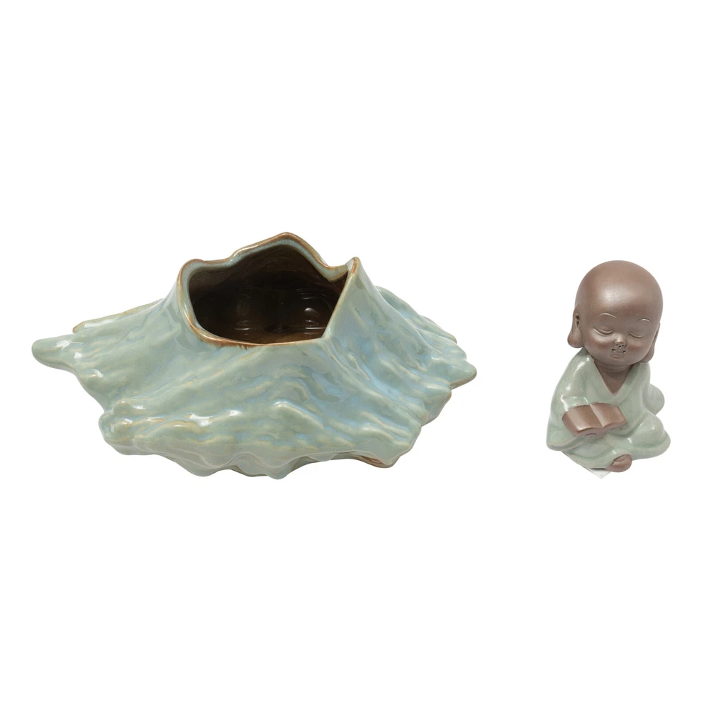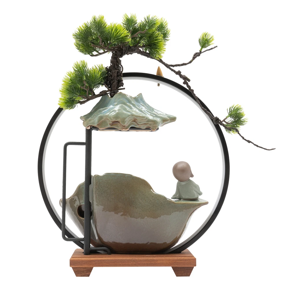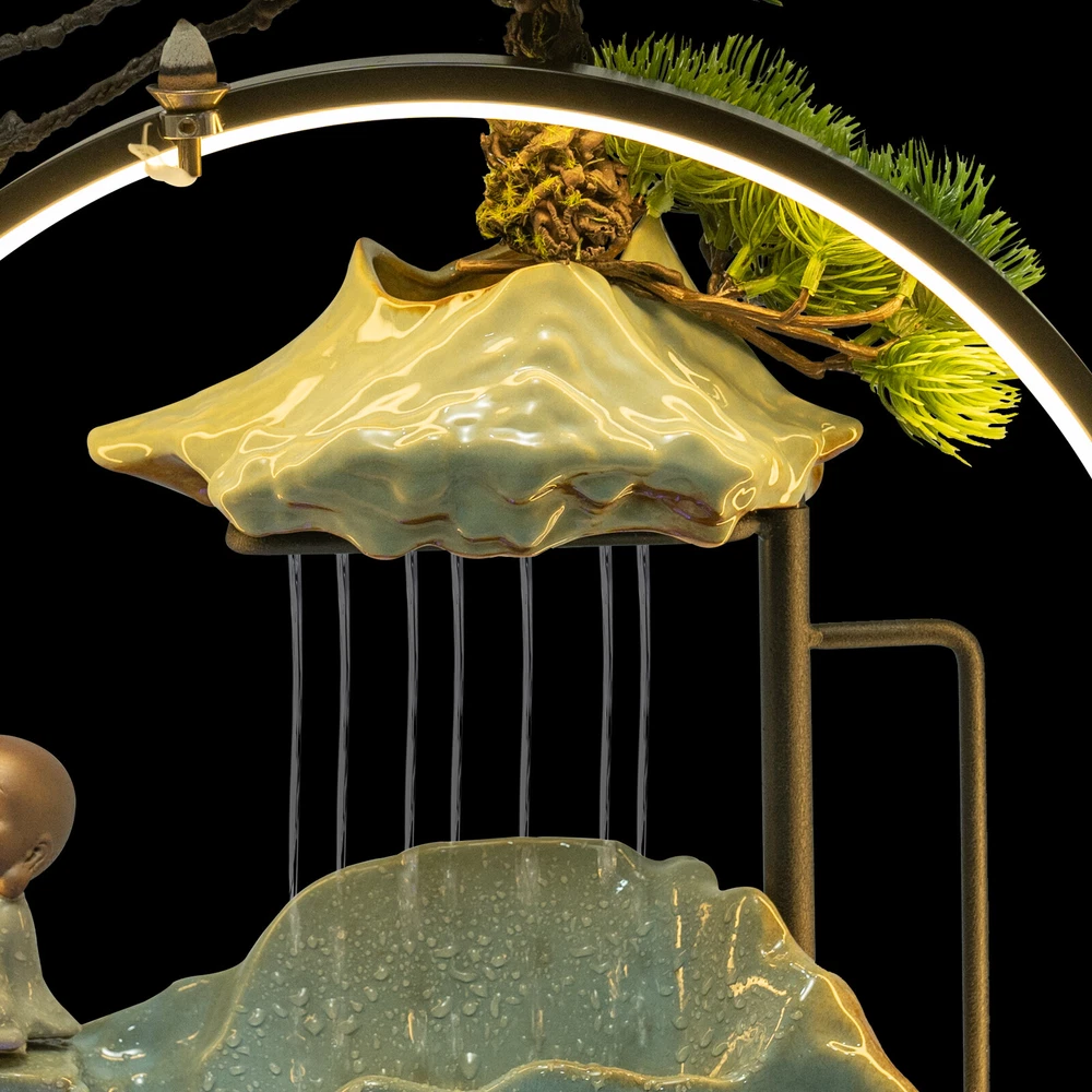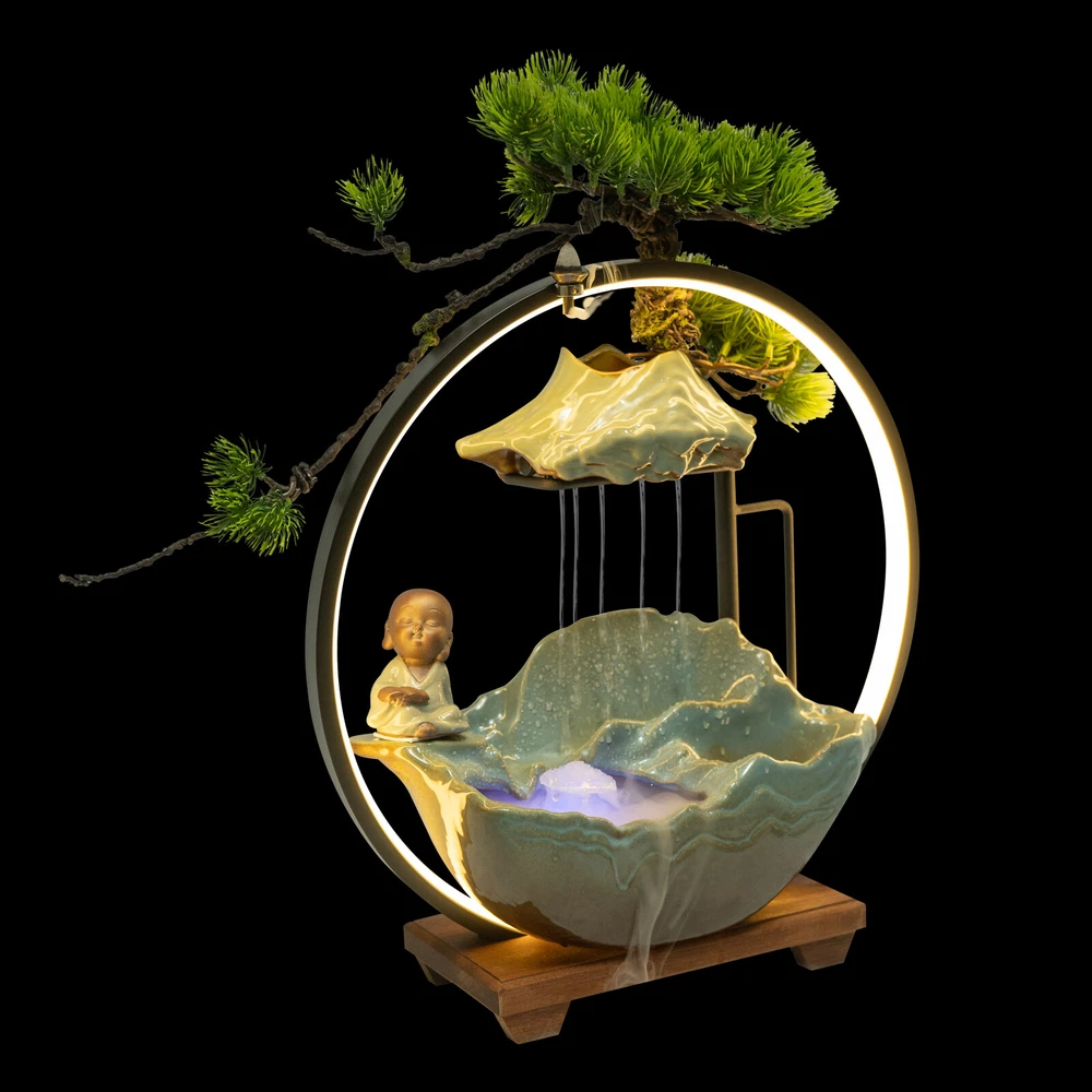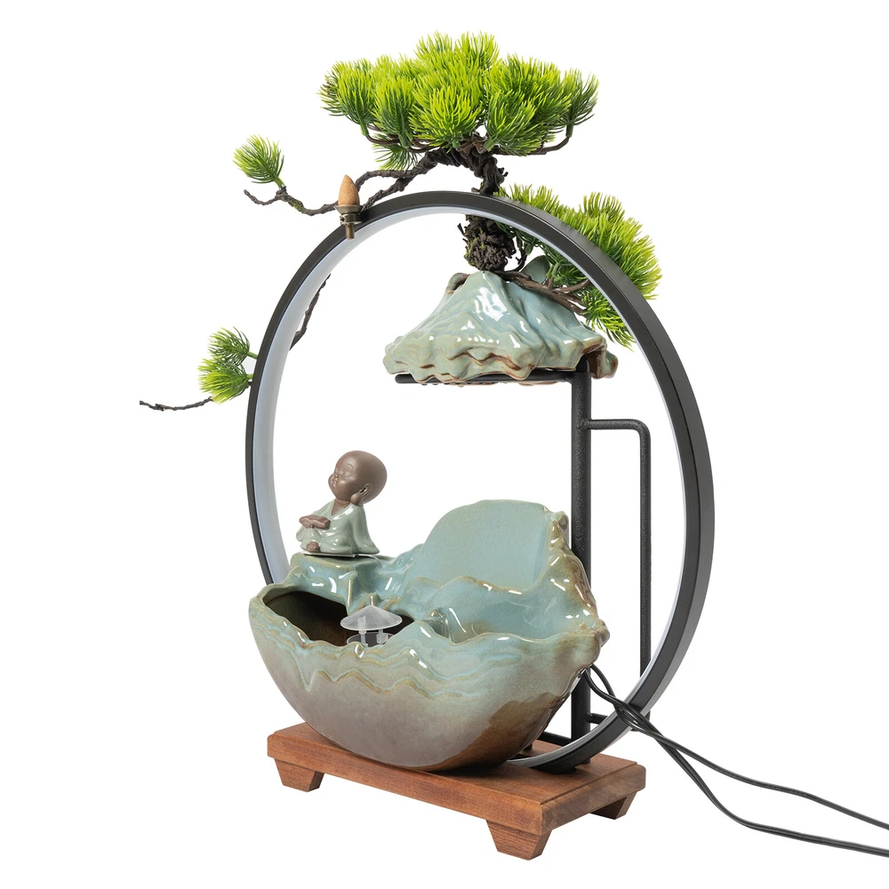 Tabletop Water Fountain Indoor Waterfall with LED Mist Desk Fountain Feng Shui Welcome Description A good ornament can soothe our mood and soul, and give us emotional sustenance. Made of exquisite ceramic and wood, and adopting an exquisite glaze firing process, this tabletop water fountain can be used for a long time. A beautiful appearance and lifelike images can add color to your room. It is not only a decoration but also a quiet and leisurely way of life. Key Features Build to Last: High-quality ceramic, wood, and glaze firing process make it strong, durable, and environmentally friendly , so it can keep beautiful and practical better. Excellent Light Source: The energy-saving and environmentally-friendly LED light source can not only protect your eyes but can also create a better atmosphere for you. Pressure Reliever: The crisp flowing water, the mellow light passing through the mysterious mist, the fresh mist, the lifelike plants, and the retro wooden base can take away your fatigue, release your negative emotions, and allow you to enjoy your tranquility and meditation time as much as possible, as if you are in a landscape painting scene. Great Decorator: The combination of Thuja, clear surface texture, character, and the water tank is lifelike, making the object look like a landscape painting, allowing you to feel the charm of nature more strongly. No matter where you put it, it is a beautiful scenery. Multi-functional: This product can improve your sleep, meditation, and attention, as well as freshen the air and humidify the air in dry weather. You can even treat it as a pet fountain for your dog and cat, with high-cost effectiveness. Simple Installation and Operation: The simple structure, adjustable water flow, complete accessories , rear wiring layout that does not affect the beauty, and convenient switch ensure that you can complete the installation and start using it in a short time. You can also feed goldfish(not included) at the bottom. Auspicious Symbolism: The waterfall and monk symbolize good luck, wealth, and harmony, and the Thuja represents life, indomitable quality, and courage, so their combination can escort your career and family life, and you can give it to your family, friends, and customers, and they will be surprised and like it. Compact and Lightweight: Due to the small size of 15.7*4.7*16.3inch and the net weight of 7.05lbs, this product can be easily moved and placed. Effortless Cleaning: The smooth surface lets you easily clean it with water and a wet towel after a period of use. Protective Packaging: The foam can better protect the product during transportation so that it can be delivered to you completely to the greatest degree. Details Solid Base: The large base( 15.7*4.7inch ) increases the stress area, so it can well maintain the stability of the product. It also raises the bottom to avoid moisture and facilitate cleaning. Long Cord: The 3.94ft cords allow you to have enough disposable length at your disposal for easy placement and further protect your safety. Convenient Hole: The hole at the top of the lamp loop can also allow you to place the backflow fragrance, which can not only clean the air but also help you sleep better. Practical Pump: The pump can achieve a sustainable circulating water supply, making the water safer, cleaner, and algae-free . Application This item can be widely used in the living room, bedroom, entrance, hallway, TV cabinet, study, office, meditation room, yoga room, hotel, cubicle, cashier, club, nursery, club, bank, and library to improve dry air, create beautiful scenery, and a relaxed peaceful atmosphere. How to Install 1. Embed the LED light loop into the groove of the wood base, and press to make sure it is tightly fixed in the base. 2. Place the reservoir stably on the base and make it stable, and put the water hose into the hole in the reservoir. 3. Place the switching device of the pump in the reservoir. Connect the water pump to the water hose, and put the mist maker in the ceramic bowl. 4. Pull the plug of the pump out of the reservoir. 5. Place the water flow fixture steadily above the reservoir. 6. Fix the Thuja slot on the shelf and fix it to the shape you like. 7. Place the monk in a stable position on the fountain. Specification Color: Green Material: Ceramic, Wood Surface Treatment: Glaze Firing Assembly Required: Yes Mounting Type: Tabletop Plug Type: US Standard Light Source: LED Power Source: Corded Electric Indoor/Outdoor Use: Indoor Power: 3W Input: AC 100-240V 50/60Hz Output: DC 24V 1A Length of Cord: About 1.2m/3.94ft Number of Items: 1 Net Weight: 3.2kg/7.05lbs Gross Weight: 3.5kg/7.72lbs Overall Size: 40*12*41.5cm/15.7*4.7*16.3inch Package Size: 42*20*40cm/16.54*7.87*15.75inch Package Included 1* Tabletop Water Fountains 1* LED Light Loop 1* Pump 1* Atomizer 1* Power Cord 1* Thuja 1* Monk Other Accessories for Installation Notes The product does not have incense and incense holder. Since the water pump, atomizer , and LED light all require a power supply, this product requires 3 outlets to fully operate, and please make sure you have enough outlets. The three plugs do not need to be opened at the same time, and you can choose according to your own needs. Please note that other plants cannot be grown on this product, and stones and real plants are not included. Please allow the slight color differ ence caused by the shooting light and 1-3 cm error due to manual measurement, and make sure you do not mind before ordering. Payment Delivery details Terms of sales About us Contact us Payment We accept ebay payment 。 Fees such as import duties, taxes are not included in the item price or shipping costs. These charges are the buyer's responsibility. Delivery details Shipping: 2-9 working days to: USA Terms of sales We maintain high standards of excellence and strive for hundred percent customer satisfaction. Feedback is very important to us. We hope that you contact us immediately before you give neutral