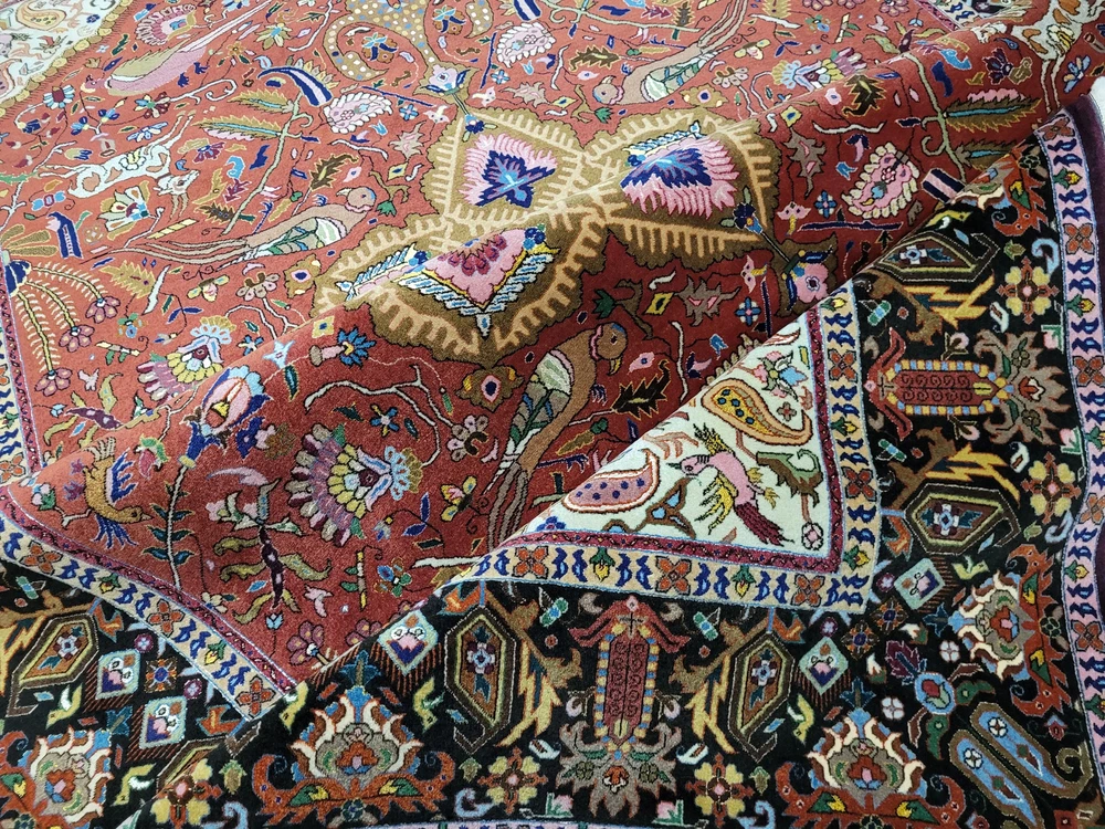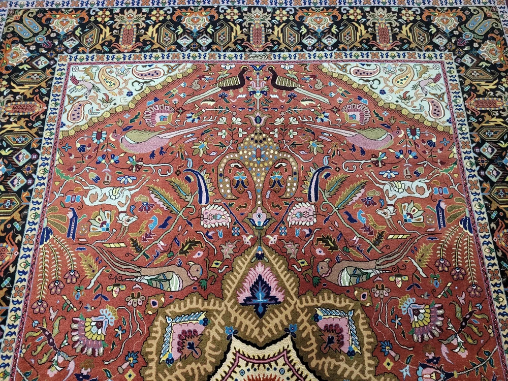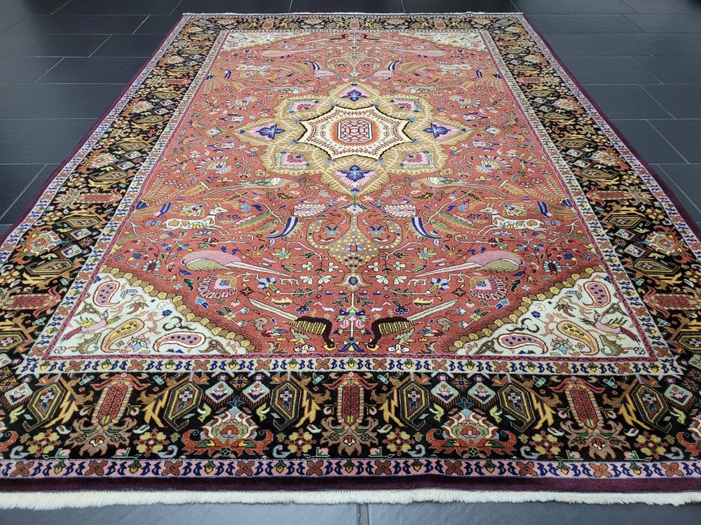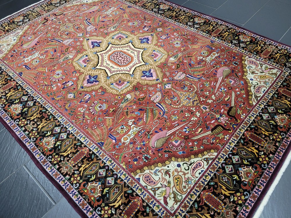 Herzlich willkommen, angeboten wird ein prachtvoller Täbriz Teppich, handgeknüpft aus feiner Korkwolle mit Seide. Das eindrucksvolle Zentralmedaillon in sternförmiger Komposition ist eingebettet in ein reich geschmücktes Feld mit Tier- und Vogelmotiven, floralen Ornamenten und kunstvollen Ranken. Die kontrastreiche Bordüre mit detailreichen Mustern in dunklen Tönen rahmt das Gesamtbild harmonisch ein. Artikelnummer: GJH25/186 Maße: ca. 260 × 175 cm Gewicht: ca. 13 kg Details: Material: Korkwolle mit Seide, handgeknüpft Knüpfung: fein gearbeitet, detailreich ausgeführt Farben: Rot, Gold, Beige, Schwarz, Grün, Blau und zarte Akzente Design: Großes sternförmiges Zentralmedaillon Tier- und Vogelmotive im Feld, kombiniert mit Blüten und Ranken Dunkle Bordüre mit ornamentalen Mustern und farbigen Details Verarbeitung: hohe Knüpfkunst, elegante Wirkung durch seidigen Glanz Zustand: Sehr guter, gepflegter Zustand. Die Bilder sind Teil der Zustandsbeschreibung. Versand: Wir versenden per GLS, UPS und DHL versichert weltweit.