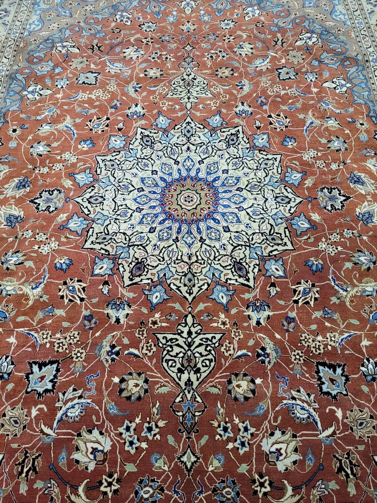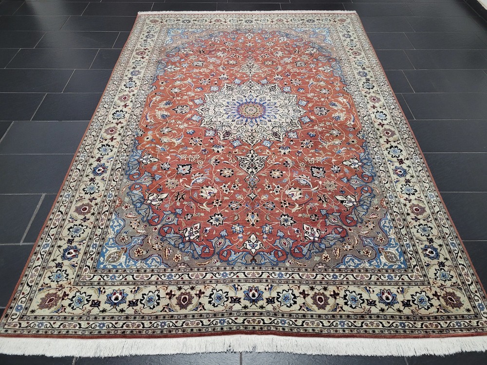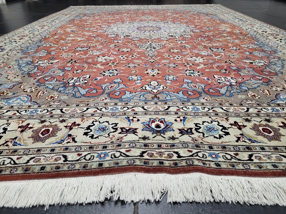 Herzlich willkommen, angeboten wird ein prachtvoller Täbriz Teppich aus feinster Korkwolle mit Seidenanteil, handgeknüpft in meisterlicher Qualität. Das elegante Medaillon-Design mit filigranen Blütenranken auf warmem Terrakotta-Grund strahlt zeitlose Eleganz aus. Die fein abgestimmten Farben in Creme, Hellblau und Gold unterstreichen die exquisite Handwerkskunst dieses klassischen Meisterstücks. Artikelnummer: GJH25/220 Maße: 298 × 203 cm Details: Material: Korkwolle mit Seidenanteil, handgeknüpft Knüpfung: sehr fein, gleichmäßige Struktur Farben: Terrakotta, Creme, Hellblau, Beige, Schwarz, Gold Design: Zentralmedaillon mit feinen floralen Motiven Elegante Bordüre mit Blüten- und Rankenornamenten Harmonisches Farbspiel mit seidig schimmernden Akzenten Verarbeitung: Hochwertige Handarbeit mit dichter Knüpfung und glatter Oberfläche Gewicht: ca. 13 kg Verwendung: Repräsentativer Wohnteppich oder dekoratives Sammlerstück Zustand: Sehr guter, gepflegter Zustand. Die Fotos sind Bestandteil der Zustandsbeschreibung. Versand: Versicherter Versand weltweit mit GLS, UPS oder DHL.