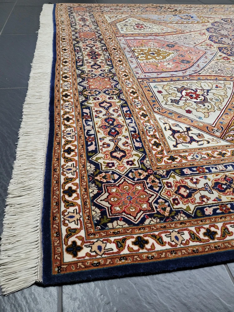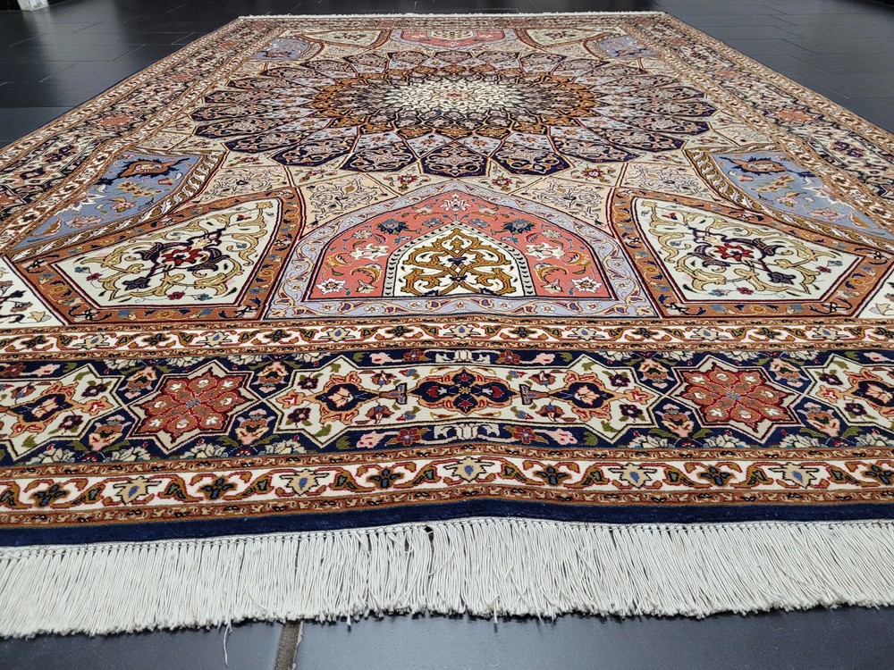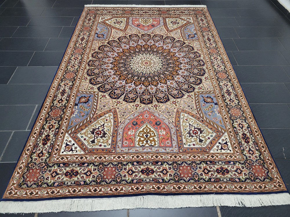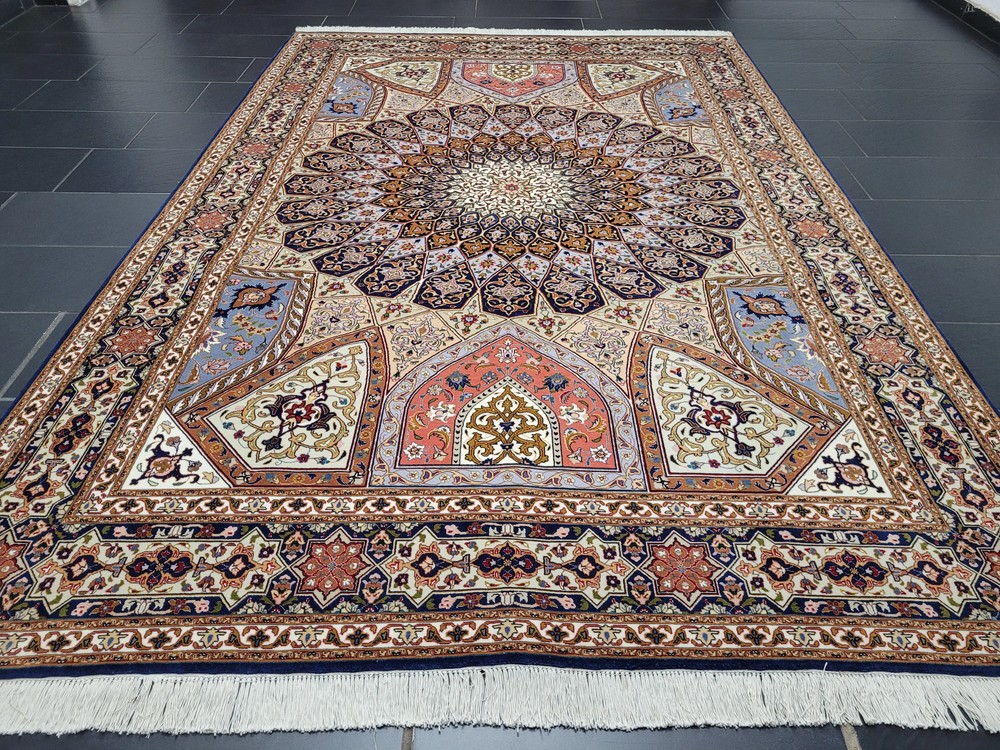 Herzlich willkommen, angeboten wird ein außergewöhnlich schöner Täbriz Teppich in der begehrten Ghombad -Ausführung. Dieses prachtvolle Exemplar ist handgeknüpft aus feiner Korkwolle mit Seidenanteil und zeigt das charakteristische Kuppel- oder Sternenmotiv, das an die architektonischen Kuppeln orientalischer Baukunst erinnert. Die meisterhafte Farbabstimmung und die präzise Knüpfung verleihen diesem Teppich eine beeindruckende Tiefenwirkung und strahlende Harmonie. Artikelnummer: GJH25/212 Maße: 310 × 205 cm Details: Material: Korkwolle mit Seidenanteil, handgeknüpft Knüpfung: sehr fein, hohe Knotendichte (feine Ausführung Ghombad) Farben: Nachtblau, Gold, Hellblau, Rosé, Beige, Kupfer, Creme Design: Zentraler Stern-/Kuppelaufbau mit strahlenförmigem Muster Architektonisch inspiriertes Design mit floralem Dekor Mehrfachbordüre mit geometrisch-floralen Ornamenten Verarbeitung: Exquisite Handarbeit mit seidigem Glanz und perfekter Symmetrie Gewicht: ca. 20 kg Verwendung: Exklusiver Wohnteppich oder Sammlerstück mit künstlerischem Anspruch Zustand: Sehr guter, gepflegter Zustand. Die Fotos sind Bestandteil der Zustandsbeschreibung. Versand: Versicherter Versand weltweit mit GLS, UPS oder DHL.