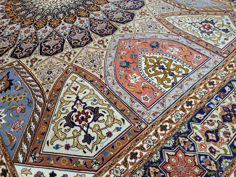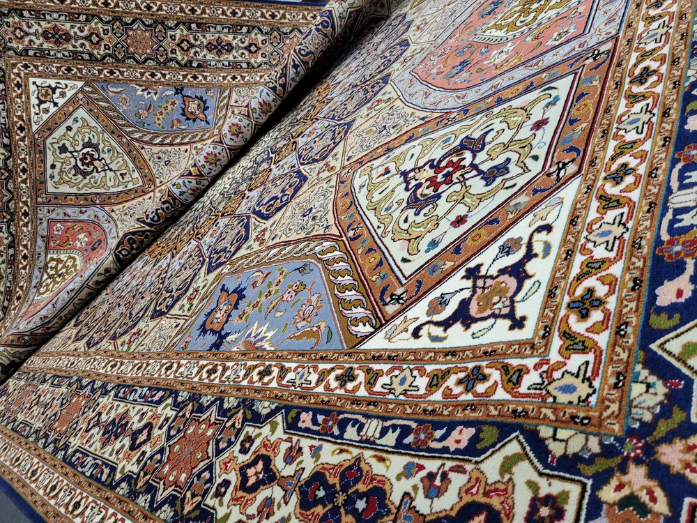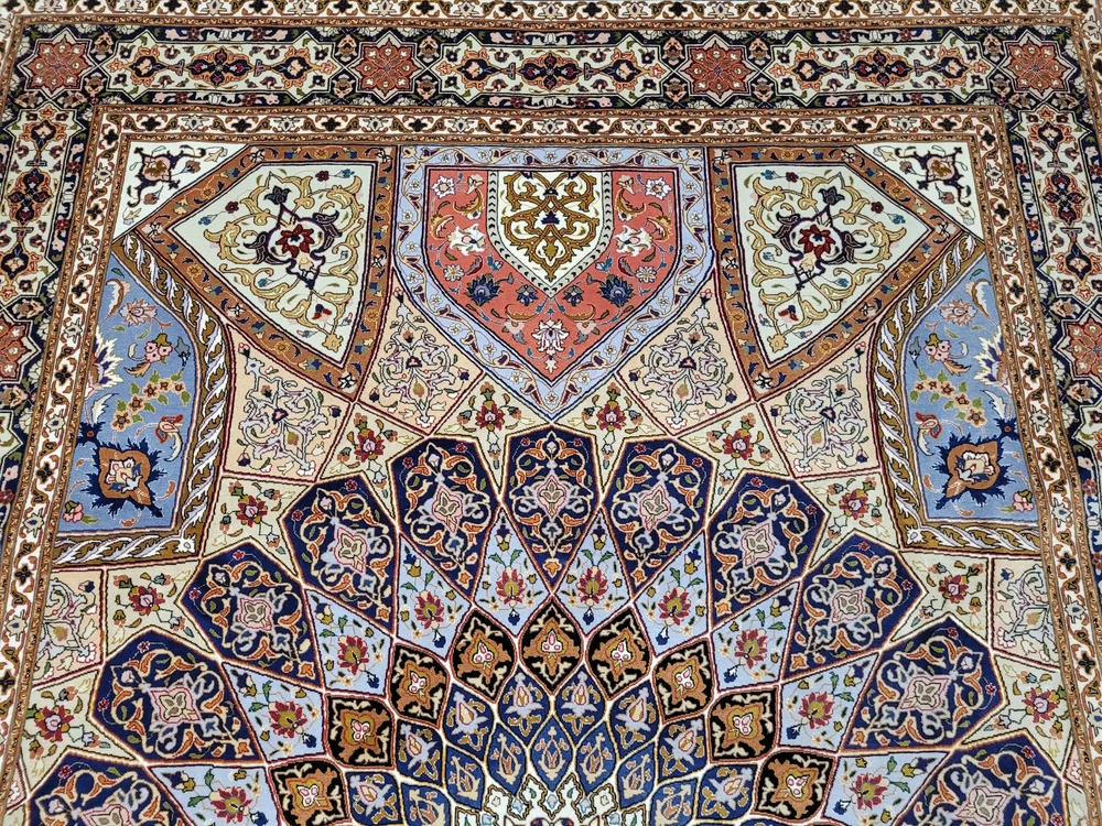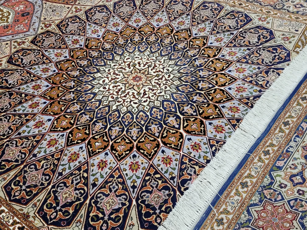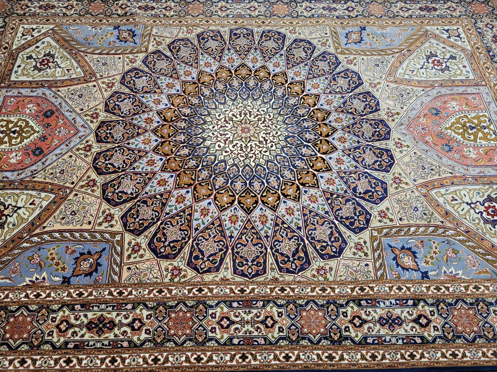 Herzlich willkommen, angeboten wird ein außergewöhnlich schöner Täbriz Teppich in der begehrten Ghombad -Ausführung. Dieses prachtvolle Exemplar ist handgeknüpft aus feiner Korkwolle mit Seidenanteil und zeigt das charakteristische Kuppel- oder Sternenmotiv, das an die architektonischen Kuppeln orientalischer Baukunst erinnert. Die meisterhafte Farbabstimmung und die präzise Knüpfung verleihen diesem Teppich eine beeindruckende Tiefenwirkung und strahlende Harmonie. Artikelnummer: GJH25/212 Maße: 310 × 205 cm Details: Material: Korkwolle mit Seidenanteil, handgeknüpft Knüpfung: sehr fein, hohe Knotendichte (feine Ausführung Ghombad) Farben: Nachtblau, Gold, Hellblau, Rosé, Beige, Kupfer, Creme Design: Zentraler Stern-/Kuppelaufbau mit strahlenförmigem Muster Architektonisch inspiriertes Design mit floralem Dekor Mehrfachbordüre mit geometrisch-floralen Ornamenten Verarbeitung: Exquisite Handarbeit mit seidigem Glanz und perfekter Symmetrie Gewicht: ca. 20 kg Verwendung: Exklusiver Wohnteppich oder Sammlerstück mit künstlerischem Anspruch Zustand: Sehr guter, gepflegter Zustand. Die Fotos sind Bestandteil der Zustandsbeschreibung. Versand: Versicherter Versand weltweit mit GLS, UPS oder DHL.
