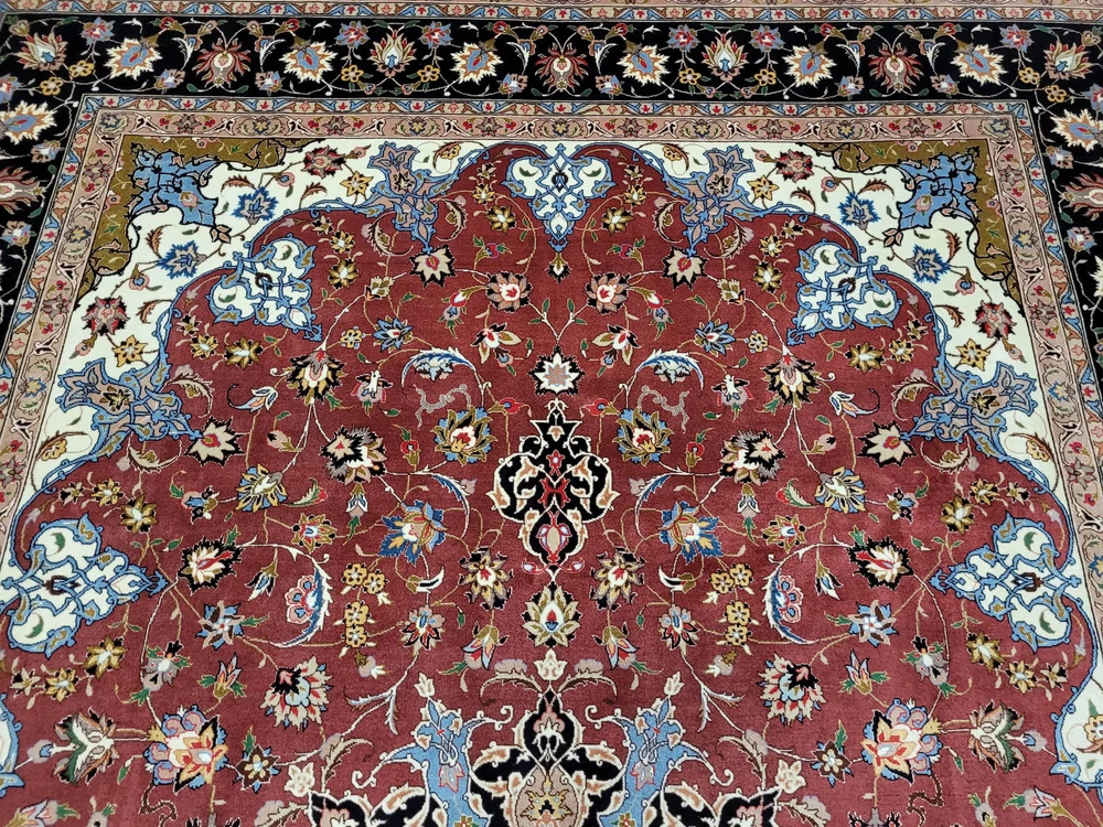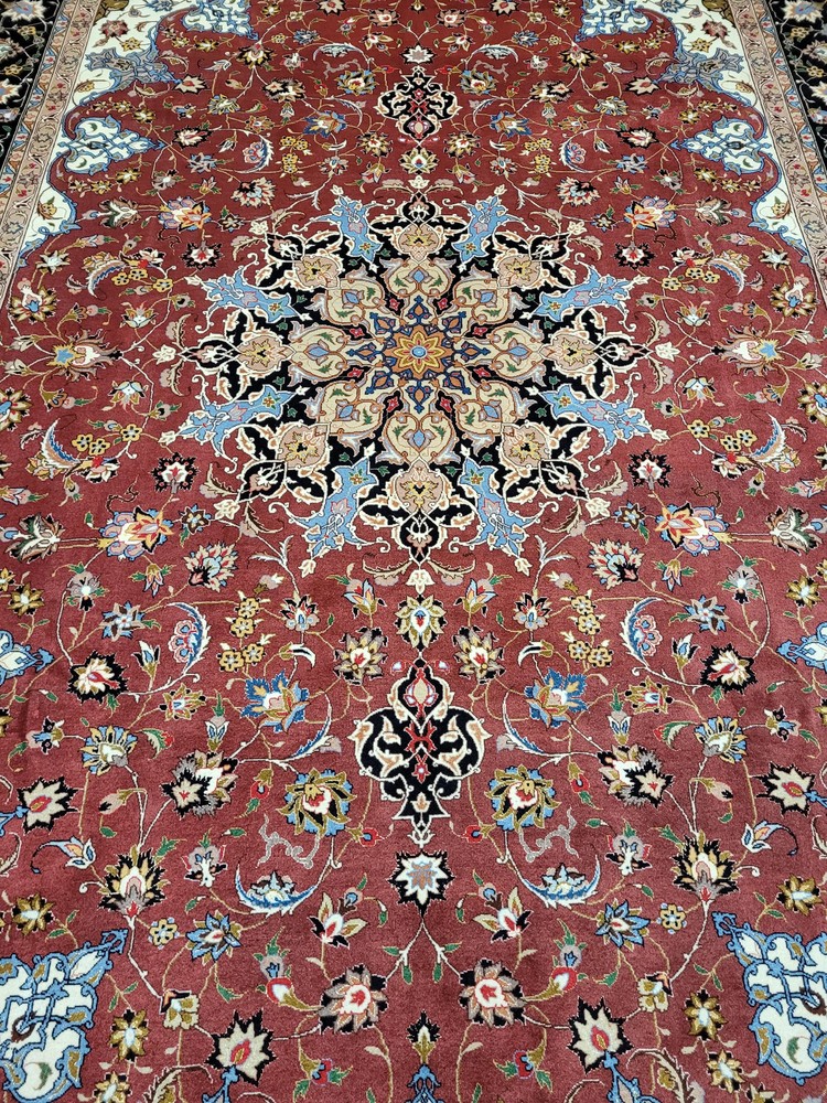 Herzlich willkommen, angeboten wird ein prachtvoller Täbriz Teppich in klassischer Ausführung, handgeknüpft aus feiner Korkwolle mit Seidenanteil. Das detailreiche Medaillon-Design auf weinrotem Grund zeigt eine harmonische Komposition aus floralen Ranken, Palmetten und Arabesken – meisterhaft ausgeführt in feinster Knüpfkunst. Artikelnummer: GJH25/210 Maße: 305 × 205 cm Details: Material: Korkwolle mit Seidenanteil, handgeknüpft Knüpfung: besonders fein, gleichmäßige Struktur (ca. 50 Raj) Farben: Bordeauxrot, Schwarz, Creme, Hellblau, Beige, Gold Design: Zentralmedaillon mit feinen Blütenornamenten Florale Eckzwickel mit eleganten Arabesken Mehrfachbordüre mit filigranem Blumenmuster Verarbeitung: Hochwertige Knüpfarbeit mit glatter Oberfläche und weichem Flor Gewicht: ca. 20 kg Verwendung: Repräsentativer Wohnteppich oder exklusives Sammlerstück Zustand: Sehr guter, gepflegter Zustand. Die Fotos sind Bestandteil der Zustandsbeschreibung. Versand: Wir versenden per GLS, UPS oder DHL – versichert und weltweit.