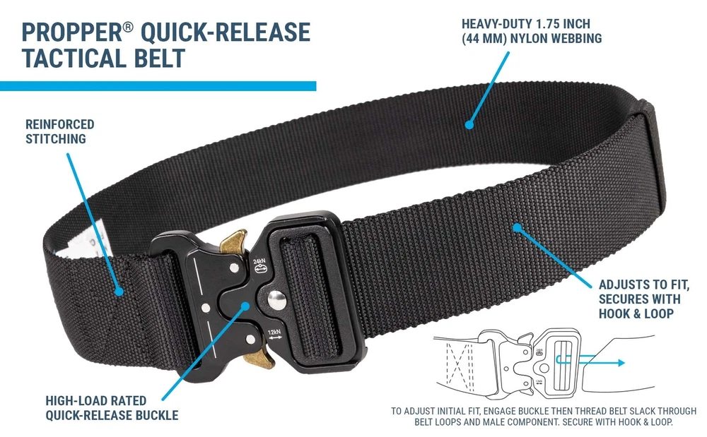 Description The QR Buckle Tactical belt is extra-wide at 44MM and can be set up to the perfect fit with a locking buckle that opens upon command with a firm squeeze to its release mechanism. DURABLE WEB BELT: 1 3/4” wide (44 MM) 100% Nylon webbing that is very durable. Provides a secure mounting platform for items, is colorfast and will not fade or fray. QUICK RELEASE BUCKLE: The design of the belt allows it to be nearly infinitely adjustable with a simple slide through the buckle mechanism. A male and female piece at each end of the buckle locks together securely and can be released by spring loaded tabs at the top and bottom. GREAT FOR OUTDOORS: The design and durability of the QR Buckle Belt makes it a great option for men or women in its 1 3/4" width for all outdoor activities including hiking, fishing, range training, climbing, or just working around the yard. SIZING FOR EVERYONE: With alpha sizes S-3X, the Ratchet Buckle Belt can fit waists from 28" or smaller if snugged up, all the way to size 50" with webbing to spare. PREMIUM AT A GREAT PRICE: Quality & value in the QR Buckle Belt. No upcharges for big and tall sizes. A heritage of 50+ years, over 250M garments made for some of the world's toughest customers.