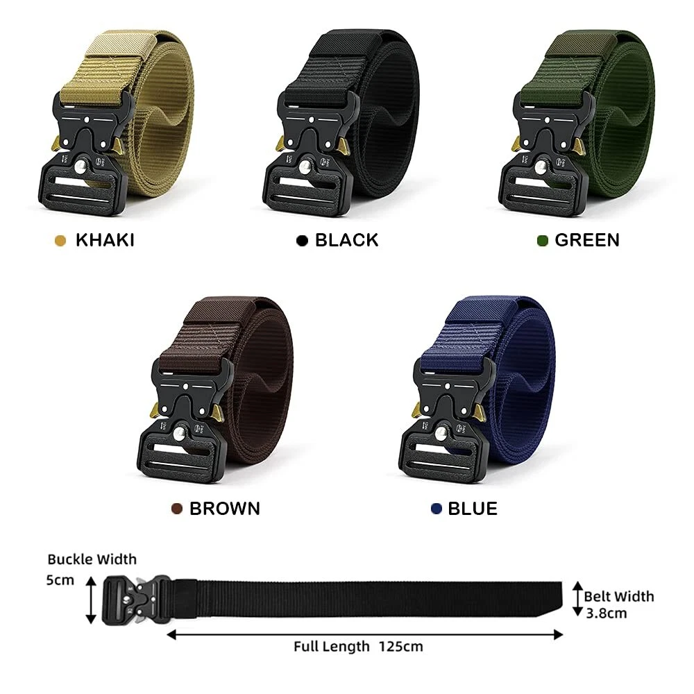 Product Name: Tactical Belt / Tactical Belt Military Belt Length: 125cm / 135cm (49.21 inch) Belt Width: 3.8cm (1.49 inch) Buckle Material: Metal Buckle Belt Material: Nylon Weight: about 0.25-0.5kg Color: Black, Brown, Blue, Green, Khaki Department Name: Adult Belt Material: Canvas Belt Material: Metal Gender: MEN Belt Width: 3.8cm Style: Casual Pattern Type: Solid Buckle Length: 6.8cm Model Number: Tactical BeltItem Type: Belt < br> Buckle Width: 5.2cm Buckle Material: Metal Alloy Military Tactical Belt: Police Belt Tactical Belt: Military Belt Army Belt: Nylon Belt Color: Black, Brown, Blue, Green, Khaki < br> Belt length: 125 cm / 135 cm Quick Release: It fits a waist size of 28-42 inches and is arbitrarily adjustable. tactical belt features a quick release buckle made of aluminum alloy, offering heavy-duty design and strong load-bearing capacity. Simply press the button on the buckle to quickly open, making it ideal for military, outdoor activities, or any scenario that requires rapid adjustment High-Quality Nylon: tactical belt is made of high-quality nylon, which is both durable and lightweight. It provides reliable support during work, outdoor adventures, and tactical operations. The nylon material is both soft and sturdy, ensuring comfort and stability during extensive movements Versatile Use: tactical belt is suitable for a wide range of applications, from military to everyday wear. It is ideal for work, outdoor adventures, hiking, climbing, and other activities. Its strong load-bearing capacity makes it perfect for carrying gear or tools Gift Packaging: tactical belt comes with an elegant gift box, making it perfect for gifting to family, friends, or colleagues. Whether it's for a birthday, holiday, or any other special occasion, this is a thoughtful gift. It's also a great choice for treating yourself Shopping : We provide you with a quality so that you can with confidence. Provide product quality . Comes with a gift box and is beautifully packaged. Trust the brand for your tactical belt needs
