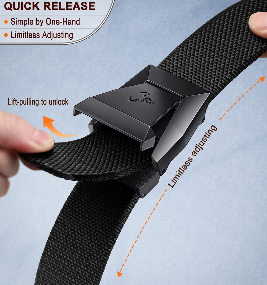 QUICK RELEASE--Creative buckle-lock and release with flips up, simple for you to make the adjustment just by one-hand operation and evertime lock into place; HEAVY DUTY--Solid nylon strap,holding your waist well,easy to carry work tools,fully support the movements in exercises or heavy works; STRETCHY FIT--The nylon strap is stretchable to adapt the waist variation in different occassions,E.G. before and after lunch,sitting or climbing,no need to adjust time to time.and it is a cut-to-fit strcuture,by just simply taking off the buckle to cut the strap,so you can just buy a little longer,no need to worry about a wrong size; BUILT TO LAST--Pure metal buckle with simple mechanism on nylon strap,it is an easy belt for you to go through all the rough occassions; LIGHT-WEIGHT--Due to the upgraded design,it gets the refined structure on buckle for a better performance but less weight,keeping the pants on but more comfortable.