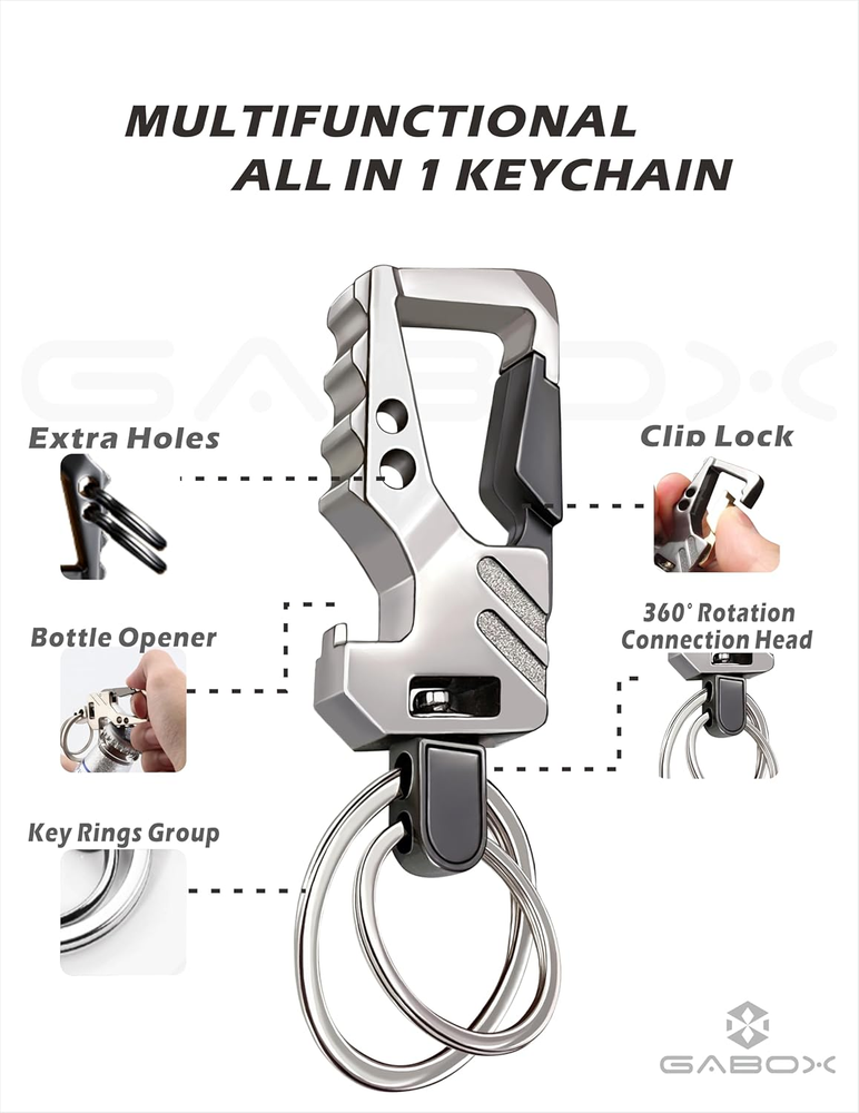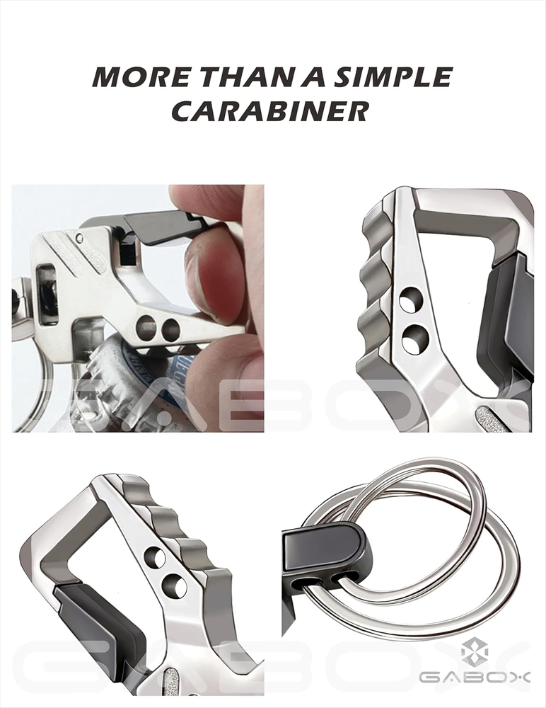 Product Description Classic Design Meets Business Occasions The unique design of heavy duty carabiner fit for men, women, friends and parents . Large hook for quick and easy access on any loops, jeans and backpack Bottle Opener Keychain for Beer & Coke Designed carabiner with versatility make the keychains can be used to quickly open the bottle cap if you want to drinking beer anywhere and anytime Premium Car Keys Keychains The color of the metal is perfectly coordinated with the car key . With complete functions GABOX keychains make all your keys organized and pockets free from clusters