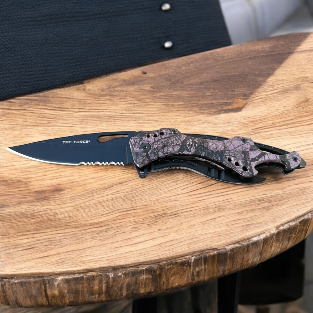 Make a bold statement with this Tac-Force folding knife, featuring a sleek black blade and eye-catching purple camouflage handle. Whether you're collecting, gifting, or carrying for utility, this knife combines function and flair in one durable tool. πΉ Key Features: π§ Stainless steel drop point blade with partial serration π£ Unique purple camo handle with ergonomic grip π© Integrated belt/pocket clip for convenient everyday carry πͺ Built-in glass breaker and seatbelt cutter for emergency use π One-handed thumb stud opening for quick deployment π οΈ Liner lock design for secure blade use Buyer must be 18+ and comply with all local, state, and federal laws.