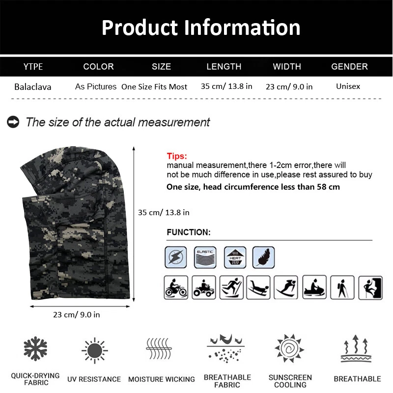 Features: Our balaclava face scarf is made of polyester fiber, play wind, cold, warmth and good permeability characteristics of the material, easy to wash and dry fast, ideal fabric for winter face protection. One size fits most adults and teens, head circumference less than 58 cm, the windproof balaclava can be worn on its own, or worn it on your helmet, double protection for the head; Sweat absorption and flash drying for maximum comfort. Exquisite stitching, the face covers are sewing beautifully and securely, with well balanced left and right seams and uniform tightness of forward and backward stitches, hard to ripe off and they will not scratch you skin, comfortable to wear. This hood can use on its own and also in conjunction with sunglasses, goggles, helmet, hat, shemagh, headset, paintball covers . Wide applications, our balaclava applies to cold or sunny weather, provides cover and comfort with lightweight and thin material, suitable for all outdoor activities, including motorcycle, cycling, skiing, snowboarding, running, trekking, tactical training, hunting, shooting, airsoft, paintball, cs, camping, hiking, climbing and so on. Details: Made of polyester, breathable, feels soft comfortable cooling Skin-tight design, keeps the face scarf from flapping in the wind and loosening up Full head coverage, extending neckline coverage (not whole neck); Being able to pull the mouth piece down to unmask your face Constructed by quick-drying fabric, sweat-wicking and breathable. Fit under helmet, offer full face protection. Easily to folds up for carrying. Designed for outdoor activity use Size: 35 x 23 cm/ 13.8 x 9.0 in One size, head circumference less than 58 cm. Material: Polyester Color: Blue Digital, Gray Digital, ACU Digital, Jungle Digital, White Gray Camouflage, Red Gray Camouflage, Yellow Brown Camouflage, Jungle Camouflage, Desert Streak, Jungle Streak, Ruins Streak, All-terrain Streak, Blue Streak, Navy Streak, Maple Woods, Jungle Woods, Field Woods, Tibet Woods, Jungle Forest, All-terrain Forest, Field Forest, Black Forest Weight: 55 g/ 1.94 oz Suitable for airsoft game, paintball, hunting, shooting, cs, motorcycle, cycling, riding sports; work with your hats, shemagh, helmets, headset, goggles, paintball covers. Notice: 1. Manual measurement, please allow 1-2 cm error. 2. The real color of the item may be slightly different from the pictures shown on website caused by many factors such as brightness of your monitor and light brightness. Package Includes: 1 x Balaclava Contact US: Please contact us for any reason before opening any case! We are willing to work out any problem or issue with you, thank you! Serious Buyer Only! Please place order only if you agree with all the terms. We accept the payments managed by ebay. All items will be shipped within 1 working days after payment received and cleared (excluding Sat, Sun, and holiday). We offer refund or resend if item is defective or you are not satisfied with it upon receiving. Please contact us before leaving any negative or neutral feedback so we can help resolve any issues that may occur before or after the transaction. Your feedback means a lot to us and we aim to satisfy and help customers as best as we can.