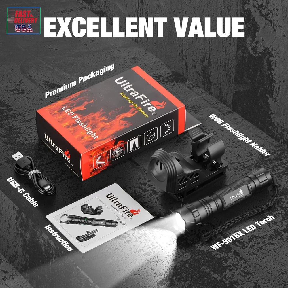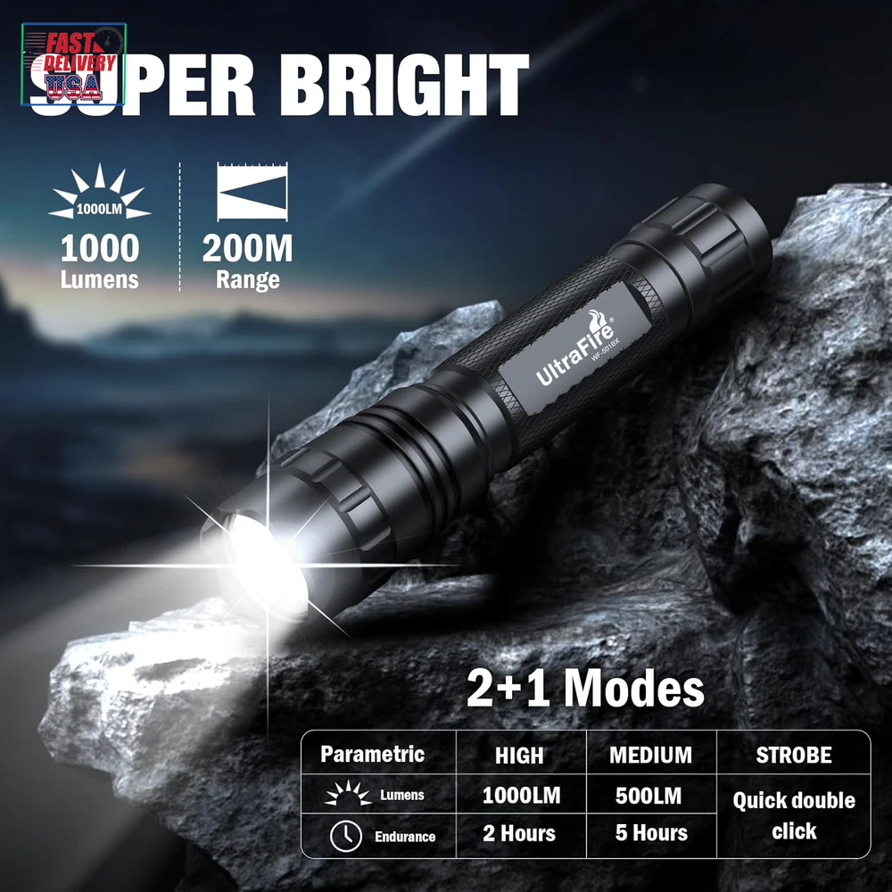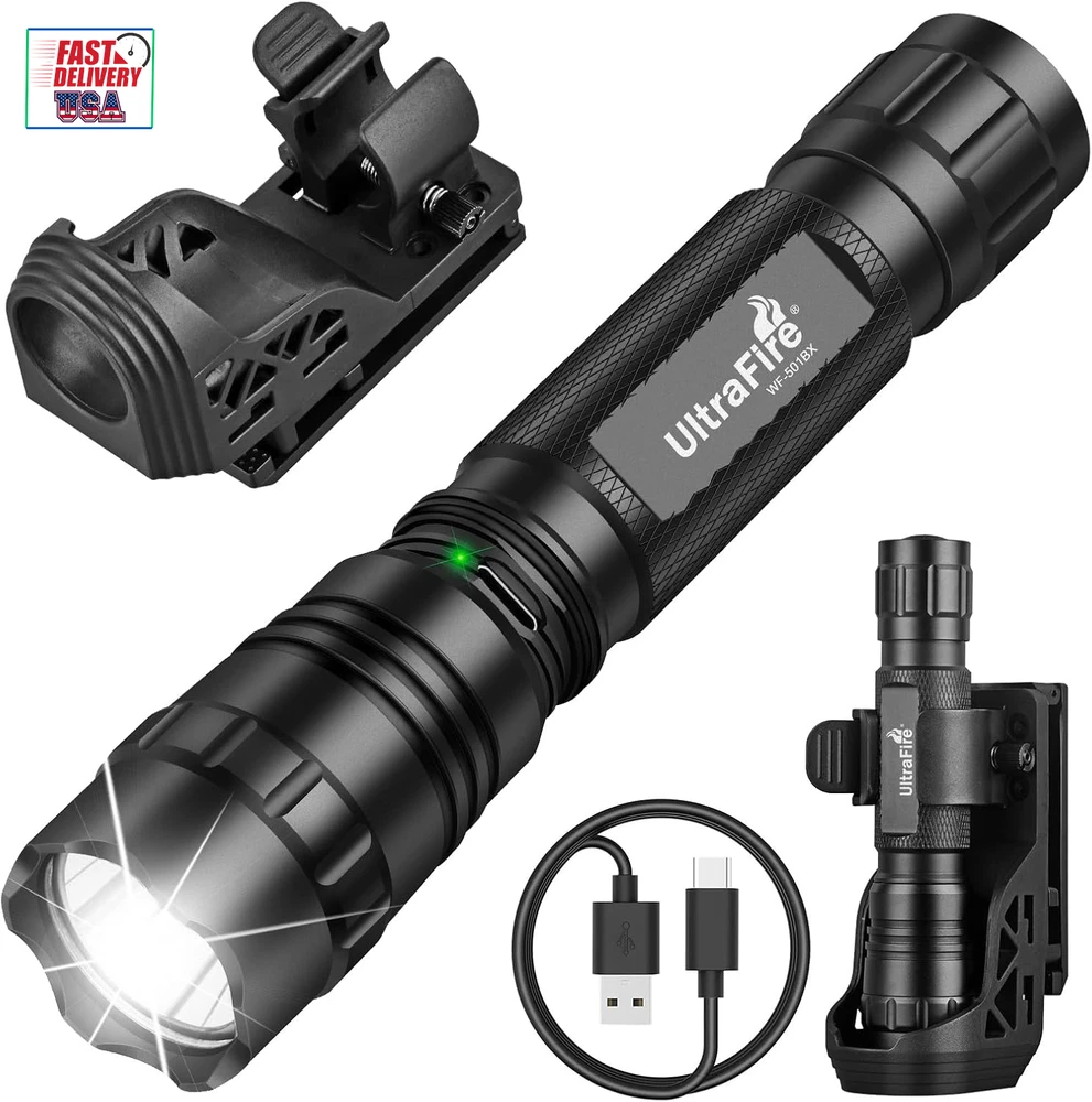 Store New Arrivals Add to Favorite View Feedback Contact Tactical Flashlight with Duty Belt Holster, 1000 Lumen Rechargeable Police Flashlight for Law Enforcement, 3-Mode Security LED Flashlight with Belt Holder WF-501BX Description Item model number WF-501B X Light Source Type LED Power Source Battery Powered Battery Cell Composition Lithium Ion Country of Origin China Warranty Type Lifetime Batteries Included? Yes Special Features High Power Batteries Required? Yes Product Dimensions 1.1"D x 0.9"W x 5.6"H Material Aluminum Number of Batteries 1 Lithium Ion batteries required. (included) Included Components Light kit inlcuded Item Package Quantity 1 White Brightness 1000 Lumens Brightness 1000 Lumen Water Resistance Level Water Resistant Item Weight 9.8 ounces Battery Description Lithium-Ion Runtime 100000 hours Special Feature High Power Part Number -WF-501B X Color Temperature 6500 Kelvin Color Matte Black Batteries 1 Lithium Ion batteries required. (included) Voltage 3.7 Volts SUPER BRIGHT: The UltraFire WF-501BX Tactical Flashlight delivers up to 1000 lumens of powerful brightness, reaching distances of nearly 820 feet (250 meters). Perfect for outdoor activities like hiking, camping, fishing, and running, as well as for power outages and emergency situations. 3 PRACTICAL LIGHT MODES: Say goodbye to endless mode cycling! This flashlight offers only the three most useful modes: High, Low, and Hidden Strobe(quickly double-click the switch button), minimizing the hassle of switching through unnecessary options. HIDDEN CHARGING DESIGN: The ULTRAFIRE WF-501BX comes with a built-in Type-C charging port (rotating flashlight head) and features an anti-reverse installation circuit for safe and reliable use. It also displays charging status: red while charging, and green when fully charged. STURDY PERFORMANCE: Crafted from aerospace-grade aluminum alloy, this flashlight is pressure-resistant, shockproof, and features wear-resistant anodizing. Its IP65 waterproof rating ensures reliable performance in extreme weather, including storms and heavy rain. MULTI-FUNCTION BELT HOLDER: UltraFire W66 flashlight holster is made of engineering plastics. Lightweight and convenient to carry. The holster can be rotated 360° and the flashlight can be fixed on belts, truly freeing your hands. Product Description ABOUT US We offer the best prices around on high quality products. Our E-store includes media such as books, movies, music and games while offering electronics, toys, sporting apparel, clothing, tools, general home, garden items and more. SHIPPING We are always working hard to ensure your package arrives as soon as possible. Please understand that some factors like weather, high postal traffic, and the performance of shipping companies are outside of our control. We offer free shipping to the lower 48 states and ship within 2 business days of payment, usually sooner. We do not accept P.O. Boxes. Please provide a physical address. For shipping outside of the continental USA, we only use eBay's Global Shipping Program.The item is shipped to KY and then sent to the rest of the world. International customers are responsible for all duties and taxes. Continue to check out in order to calculate costs for shipping the item to your country. Messages regarding eBay's Global Shipping Program MUST be directed at eBay EXCLUSIVELY. RETURNS We offer a 30-Day Return Policy on items which you are not completely satisfied with. You have the option for a full-refund or an exchange of the item. No returns are available on items shipped outside of the USA. PAYMENT We accept PayPal. CONTACT US This page content is yet to come Please ad us to your favorite seller and visit again later Thank You CUSTOMER SATISFACTION We try our very best to make sure every customer is completely satisfied. If there's a problem, message us! We're happy to help. WE ACCEPT Copyright © 2021 AutoDS. | All Rights Reserved