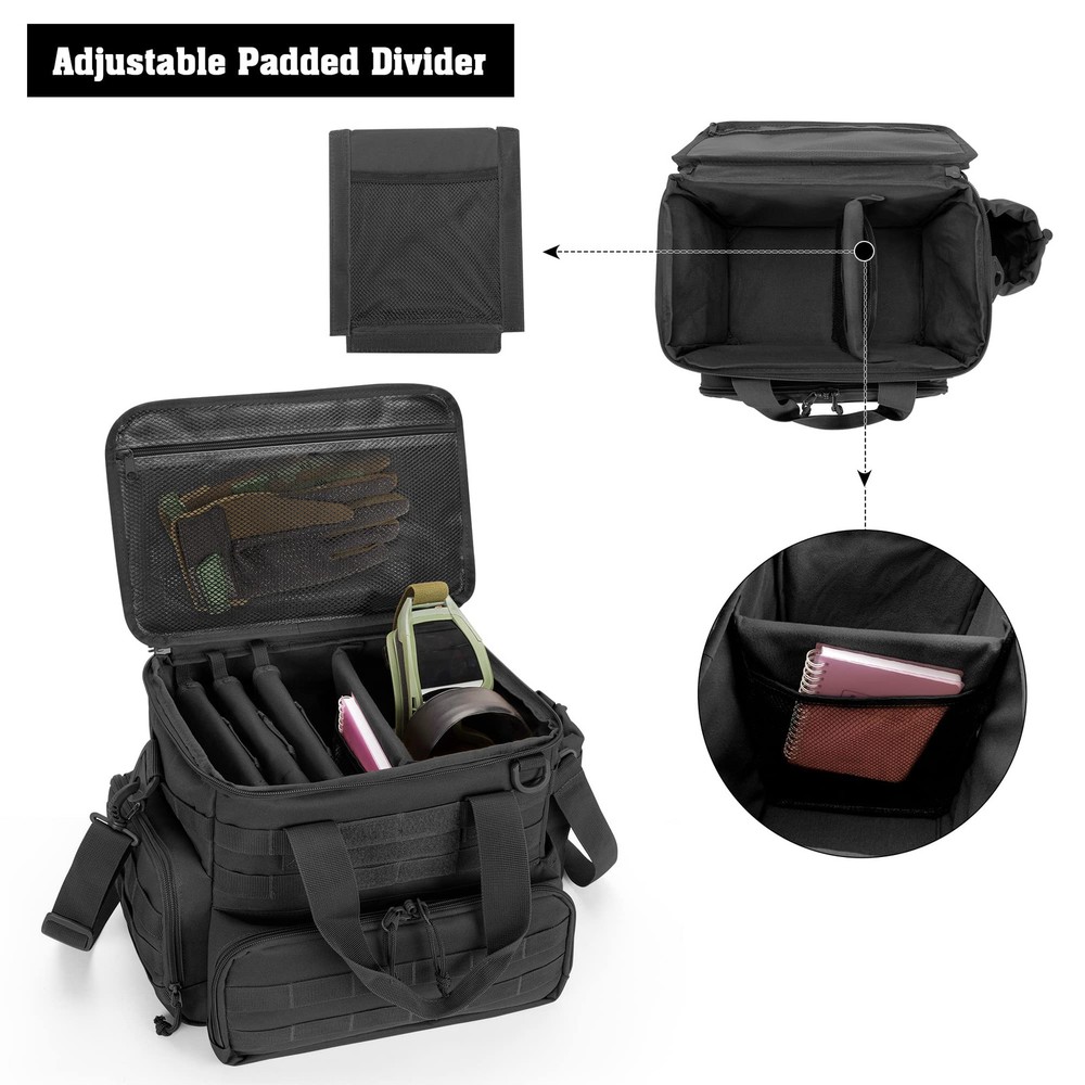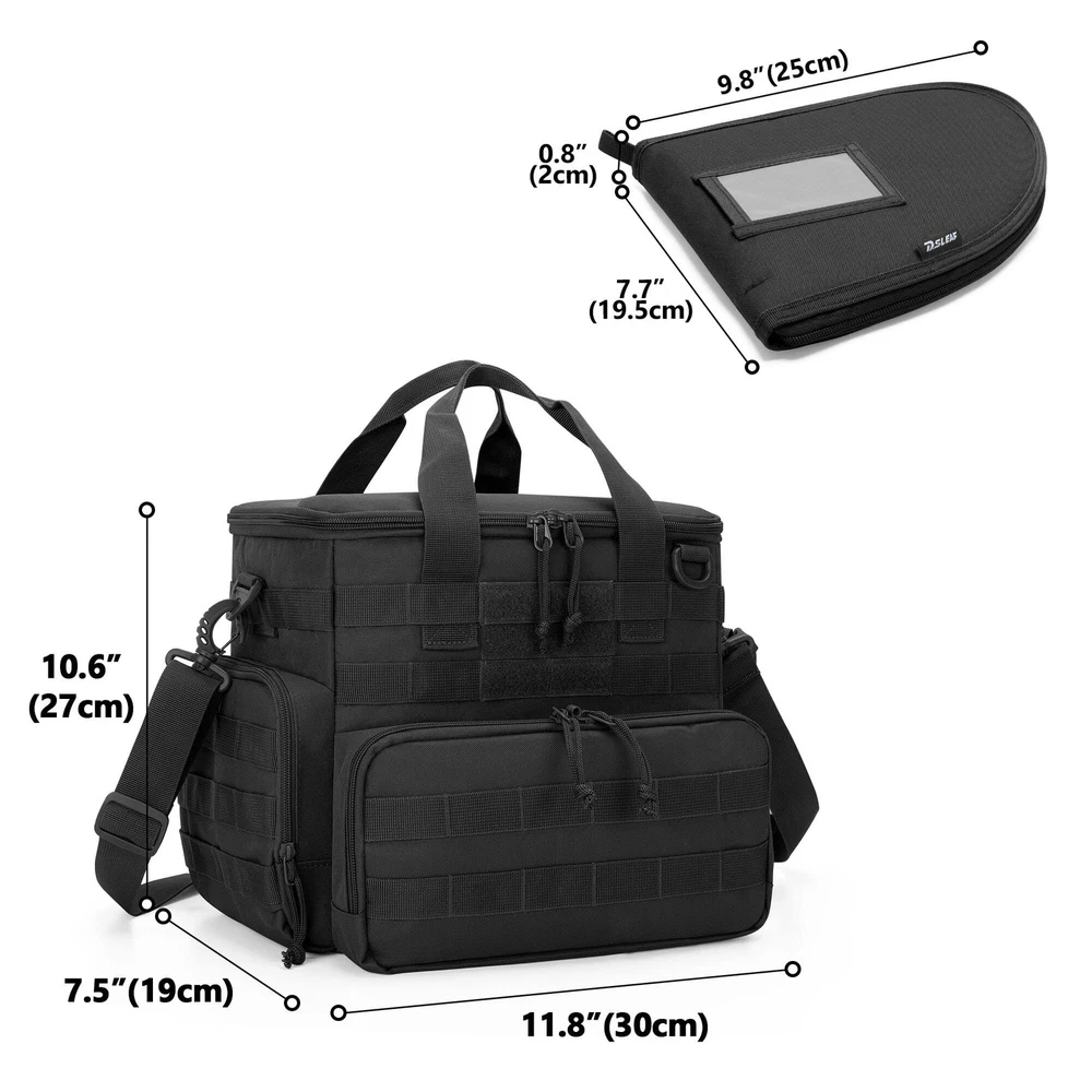 Well Design: The inner removable divider can be adjusted to meet your customized need; the main compartment can hold 3 pistols, earmuffs, glasses, gloves and other necessities; 3 pistol cases can store your pistol separately and the velvet lining secure your gear from wear and damage Large Capacity: The front zippered pocket can carry 12 magazines.; the side zippered pocket and 2 side elastic pockets can carry your phone, wallet, ammo, bottle and so on; the top pocket also provides space to store your shooting accessories Nylon Material: The gun range bag is made of strong and heavy nylon material to secure your gear from the wear; the nylon material and reinforced stitched offer strength, durability and make your range bag last for long time usage Molle System: The front and side molle webbing of range duffle bag expand its storage capacity further and give the bag sleek look; you can attach your molle pouches and equipment to carry more range gear and other essentials User Friendly: The adjustable padded shoulder straps and handle provide comfort shooting and hunting experience; 2-ways lockable zippers, ID card window and flag patch area ( flag patch not include) are ideal for shooting enthusiast; dimension: 11.8 x 8.7 x 10.6 inches