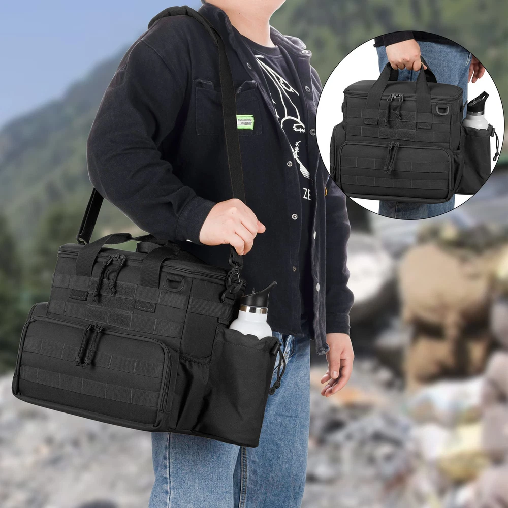 This tactical range bag is a game-changer! The adjustable dividers and spacious main compartment fit everything—three pistols, mags, ear protection, and more. The velvet-lined pistol cases keep guns secure, while multiple pockets organize ammo, phones, and essentials. Durable, well-designed, and perfect for range days—no more juggling gear! Love the extra storage and smart layout. Highly recommend for shooters who want convenience and protection.