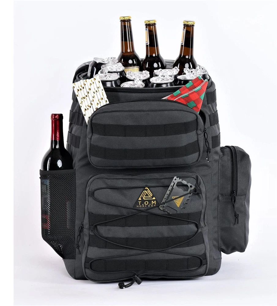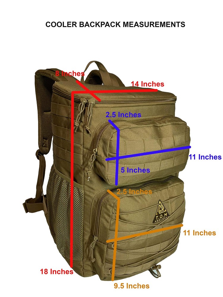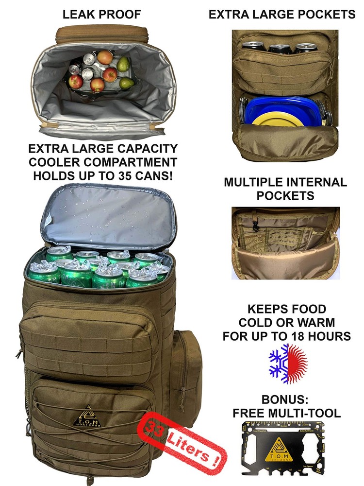 **UPDATED 6/2020 - REINFORCED STITCHING** Why get this cooler backpack? If you are looking for a heavy duty, extra-large, tactical cooler backpack, which will keep food cold or warm for up to 18 hours , hold enough food and drinks to feed a group for a whole day, and be comfortable to carry for a long time, look no further! Designed by a veteran army officer with functionality, durability, and comfort in mind Features and specifications Main compartment is fully insulated, infused by heat to stay watertight (melting ice will not leak). Holds food containers, drinks, ice packs, sandwiches and more in an extra large insulated compartment. The compartment is large enough to hold up to 35 soda cans including ice! 3 large additional closed pockets to hold plates, cups, silverware, condiments and anything you need to serve a full meal on the go and beyond. Mesh pocket which fits 2 full size wine bottles 2 straps below the backpack can hold such items as a rolled blanket, mat, tripod etc. Heavy duty, wide padded straps with abdominal and chest cross straps for extra comfort and fit while walking long distances. Heavy Padding on straps and back is made out of breathable material with air channels to reduce sweating Zipper extenders to easily handle with gloves during cold temperatures Front and side Molle PALS (pouch attachment ladder system), allow connection of attachments you already own such as pouches, knives, first aid kits, buckles, utilities etc. Bonus: credit card multi tool with up to 46 different uses. Will assist with tasks during your hike and meal prep (open, bottles, cans, boxes). Also great to keep in your wallet whenever you need a sleek multi tool and don't want to carry a full size tool Satisfaction guaranteed. One year buyback warranty. Love it or we will buy it back from you! HEAVY DUTY EXTRA LARGE COOLER BACKPACK: Keep food and drinks cold or warm for up to 18 hours in the main insulated compartment. Includes additional 4 large compartments for all other necessities. Main compartment’s volume is 33 Liter and can hold up to 35 soda cans including ice. Backpack can comfortably hold up to 40 lbs of items LEAKPROOF: Insulated and fused main compartment with a watertight seal that will not leak. Additional compartments and exterior are made of a waterproof, heavy duty material. Backpack is easy to clean ERGONOMIC, TACTICAL, TOUGH and LIGHTWEIGHT: Specifically made for long hikes and outings. Includes breathable, heavily padded mesh back pads, reinforced padded straps with chest and abdomen securing straps. This design keeps the cooler backpack comfortably in place even after many hours of walking. A molle system is included for any supported attachments. A pair of straps under the backpack allow for attaching blankets, mats, extra shoes, etc. SIZE: Main cooler compartment is 18x8x14inches. Other compartments sizes are 11x9.5x2.5 11x5x2.5 and 10x5x2.5 inches. Mesh pocket can hold 2 full size wine bottles BONUS CREDIT CARD MULTI TOOL: included with each cooler backpack. Up to 46 tools in one including screwdrivers, wrenches, knife, bottle opener, can opener, box opener and more