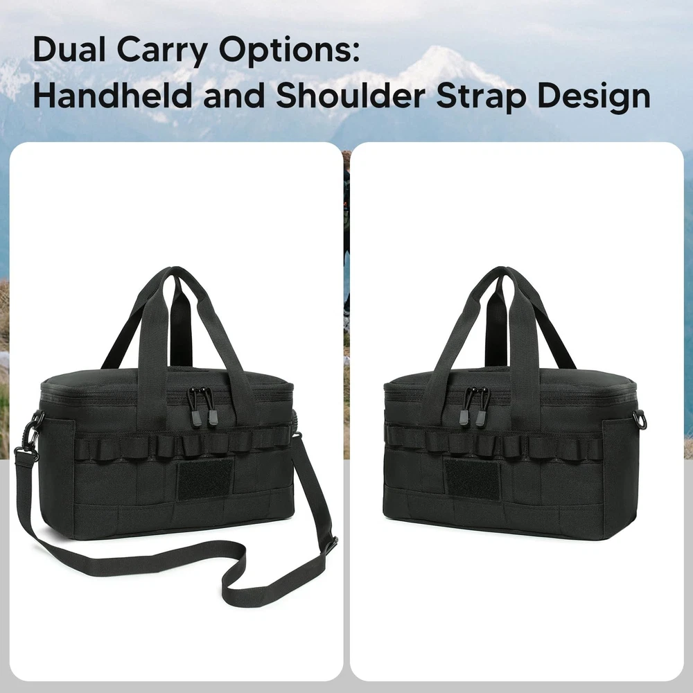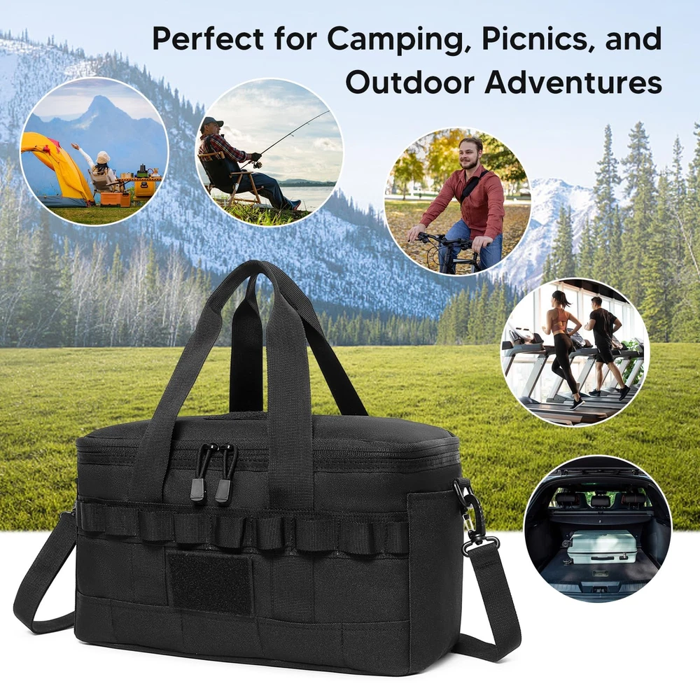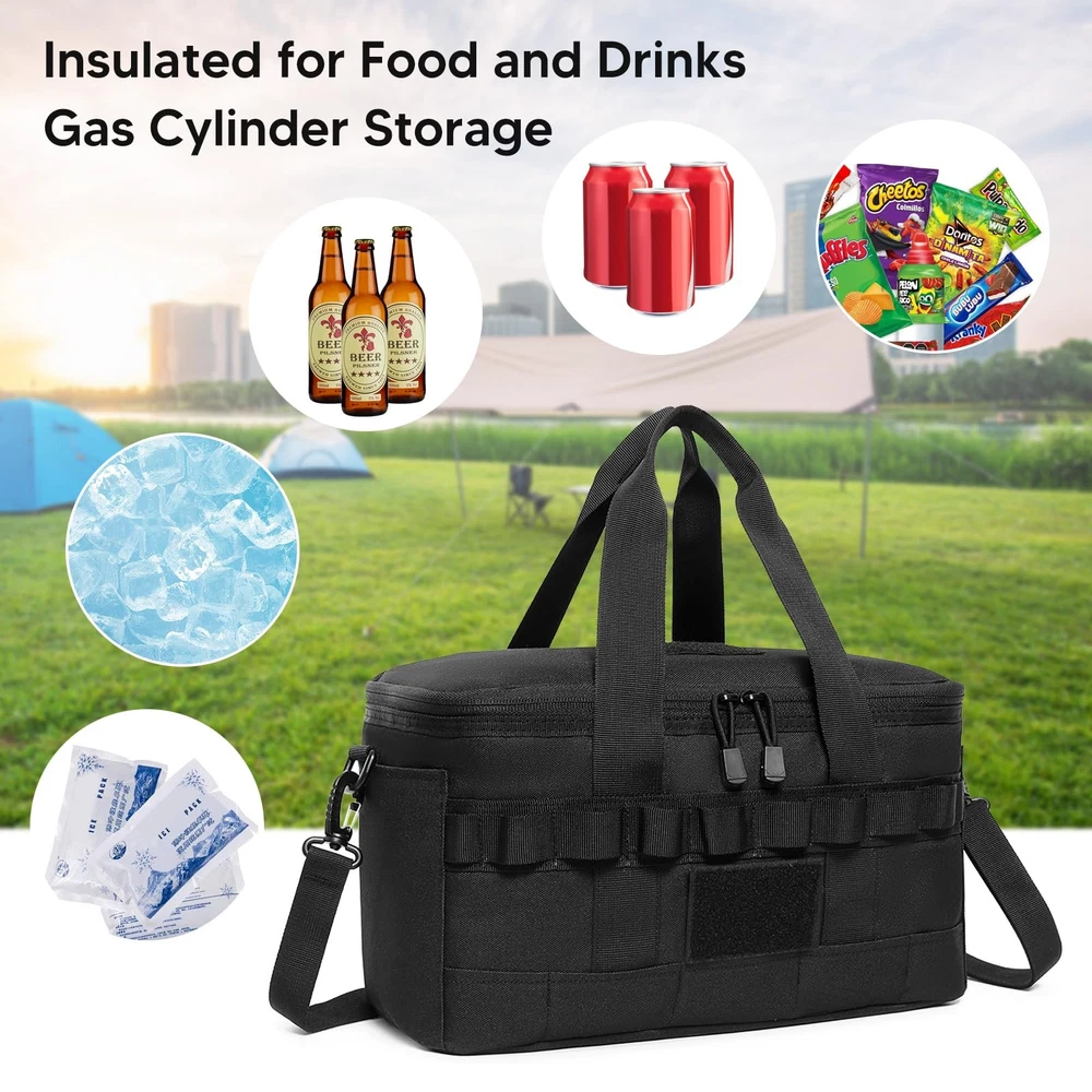 Specification:Origin: Mainland ChinaMaterial: 600D Oxford Cloth, Pearl Cotton, Aluminum FilmSize: 35cm/13.77in * 20cm/7.87in * 17cm/6.69inUse: Camping Bag, Picnic Bag, Insulation Bag, Cooler BagNote:Due to the different monitor and light effect, the actual color of the item might be slightly different from the color showed on the pictures. Thank you!Please allow 1-2cm measuring deviation due to manual measurement. 【LARGE CAPACITY & ORGANIZED STORAGE】This tactical lunch bag holds up to 14L (fits 18 cola cans) and measures 13.8" x 7.9" x 6.7". It features 2 front zippered pockets, 1 side mesh pocket for bottles, and 1 zippered MOLLE pocket. The front patch area lets you add your favorite patches. With 5 compartments, it’s perfect for work lunches, camping snacks, or outdoor adventures. 【KEEP IT COOL OR WARM ALL DAY】With 3 layers of 8mm PE foam insulation, this bag keeps your food and drinks cool or warm for up to 8 hours. The waterproof, oil-proof lining makes cleanup a breeze—just wipe and go. Fresh meals, no hassle. 【MOLLE SYSTEM FOR THE WIN】Equipped with MOLLE webbing on the sides and back, you can attach pouches, keys, or tools. Clip it to your tactical backpack or customize it your way—it’s built for more than just lunch. 【BUILT TOUGH WITH 900D FABRIC】Made from rugged 900D Oxford fabric, this bag resists water, dirt, and wear. Smooth zippers and reinforced stitching mean it’ll handle your toughest days without tearing—it’s as tough as your to-do list. 【MULTIPLE WAYS TO CARRY】Comes with a 66-inch adjustable shoulder strap and grab handle for easy carry. Whether it’s work, camping, or a picnic, this bag is ready for the ride. Pro tip: It holds more than just sandwiches.
