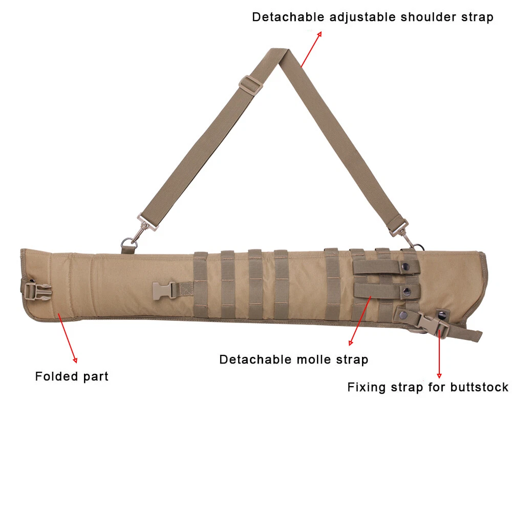 Products Photo Product Description Product Description Product name: Tactical Rifle Scabbard Specification: 34inchx5.9inch Material:600D high strength Oxford cloth Weight:0.4kg The tactical Rifle Scabbard is designed for shoulder carry or modular mounting. Webbing on both side with four detachable PALS straps for ambidextrous usage. Six D-ring locations for attaching the padded shoulder sling to for multiple carry options or preferences. Removable retention strap with quick-release buckle. Padding around the whole scabbard to protect your rifle. Webbing on both side with four detachable PALS straps for ambidextrous usage Six D-ring locations for attaching the padded shoulder sling to for multiple carry options or preferences Removable retention strap with quick-release buckle. Padding around the whole scabbard to protect your rifle Perfect for outdoor war game activities. Product Details Return Policy About Feadback Return Policy 1. Customer satisfaction is our top goal. We believe our items are so outstanding. All products are quality checked. They are new and in good condition when shipped to our customers. We are convinced you will be happy with your Purchase. 2. If product is defective or damage upon arrival, or wrong product shipped, please contact us immediately. Returns accepted within 14 days of delivery date and item must be in original new condition, not worn or altered in any way with attached tags & wrap. Otherwise deal is final. Return shipping must be paid by buyer. 3. Please contact us first if you have any problems/questions/concerns. We will be happy to resolve any issues you may have in a cordial and friendly manner. 4. We appreciate your Postive Feedback, and will do the same in return. DO NOT leave negative feedback without first communication with us. Please allow max 2 business days for us to response. About Feadback When you satisfied with our product and services please leave us positive feedback. If a problem occurs, contact us immediately with any email request. Just contact us using the " Ask the seller a question" link on eBay.