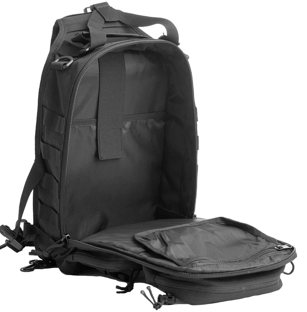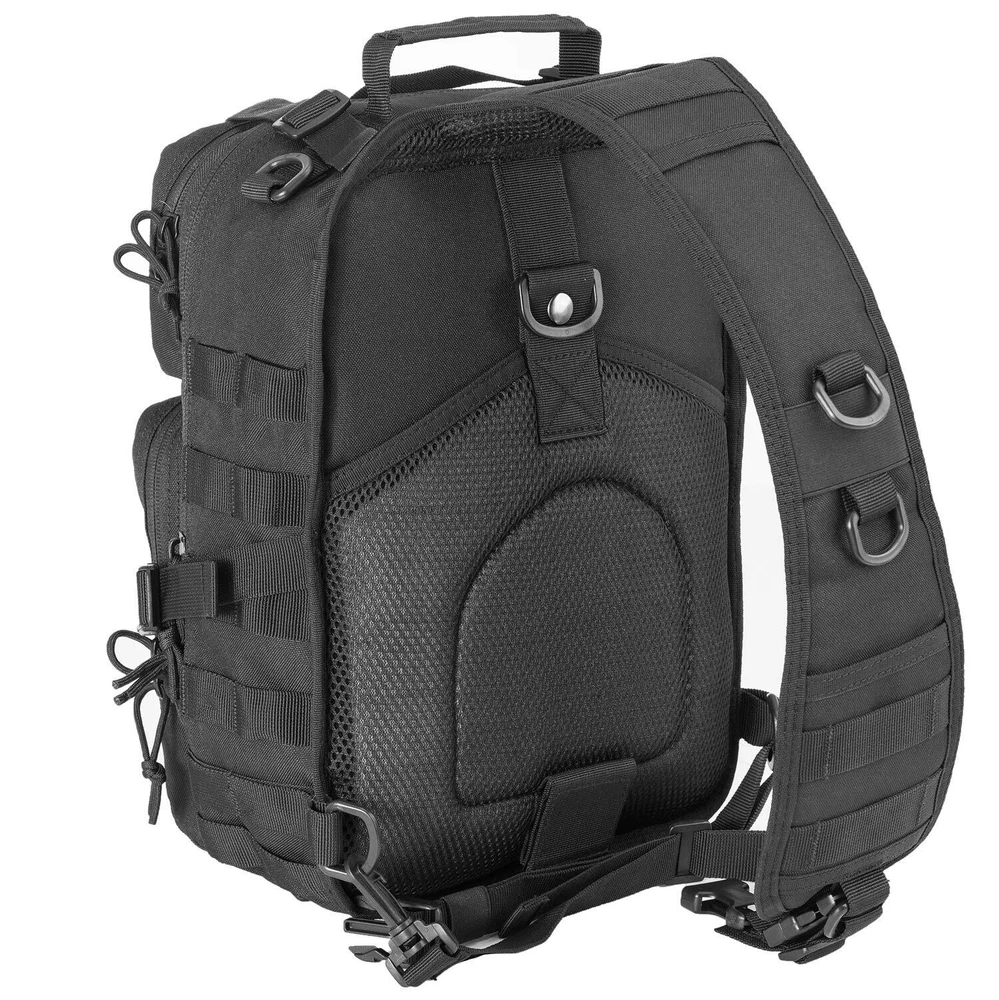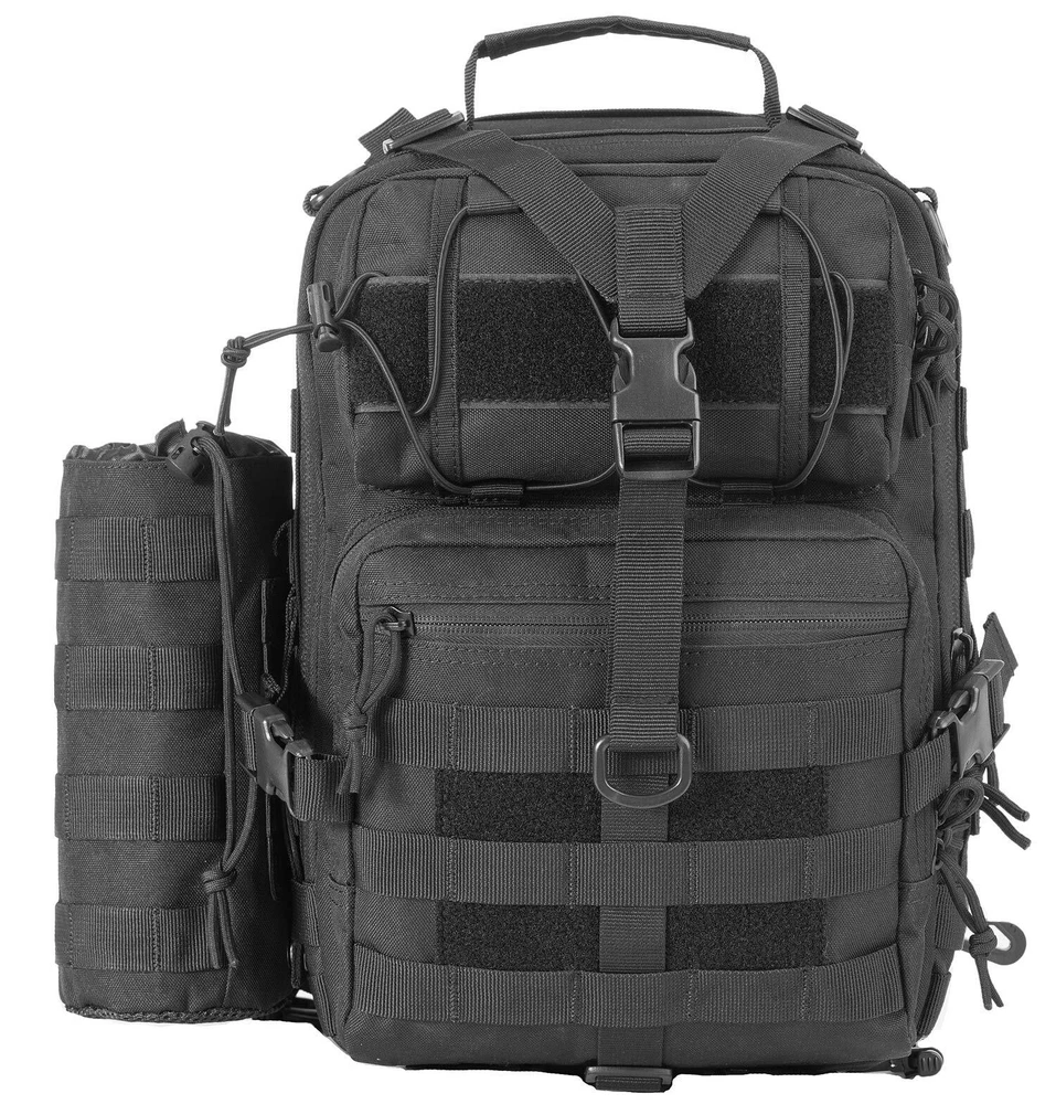 Please note that the waterproof rain cover is hidden inside the zipper pocket at the bottom of the sling bag. Open the zipper pocket on the bottom, you can find the waterproof rain cover. Come with 9 Pcs Accessories -- 1 x Water Bottle Pouch, 1 x USA Flag Patch, 6 x D-Rings Grimlock Locking, 1 x Waterproof Rain Cover. Please pay attention to the waterproof rain cover is hidden inside zipper pocket at the bottom of the backpack.Tactical sling pack with velcro in the concealed back compartment. Awesome as a pistol sling range bag for 1-2 handguns and lots of ammo or as tactical assault pack. Sling pack's size: 14 * 11.5 * 6.5 inch (H*W*D), enough for carrying 13"laptop,iPad, notepad, goggles, book, keys, wallet, cell phone, flashlight, gloves, water bottle, chargers etc on a daily basis. Tactical sling backpack has adjustable and comfortable single shoulder strap, and also has two smaller straps to help reduce the sway of the bag while moving as small military rover shoulder sling backpack.Heavy duty zippers and utility-style cord pulls, front load compression system-Y strap. Comfortable breathable padding back area, molle straps as molle tactical sling pack or edc bag. It's made of durable 600D polyster,water-resistant and durable.
