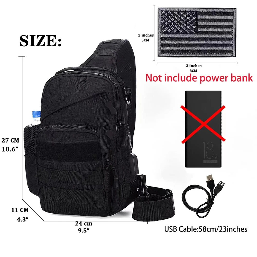 Description This tactical sling chest bag is suitable for all kinds of people. It has 1 main inter bag and 4 auxiliary pockets. The size is 6.69 * 2.75 * 9.84 inch (L * W * H). The external USB port charging design, free your hands Because of the large capacity, so you can put your iPad mini , cell phone and some daily necessities stuffs. MOLLE system bag can use it flexibly. It is a good choice for your travel or outdoor activities or daily use bag. Package: 1 x Tactical Chest Sling Bag If you have any problems, please contact us, we will try our best to help you. Tip: This item is a small bag, please pay attention to the size before purchase The tactical sling backpack is constructed by the high quality 600D oxford nylon material and SBS zipper, which is wear-resistant .Main bag size: 6.69 * 2.75 * 9.84 inch (L * w * h), weight: 380g, light and small, easy to carry The external USB port charging design, free your hands, can charge your mobile phone at anytime and anywhere. The tactical small sling bag includes 1 main inter bag and 4 auxiliary pockets. The main inter pocket can hold your iPad mini, Kindle and other large items. The extra front pocket can hold cell phones, napkins, headphones, keys, charging cables and other small things. The remaining two hidden pockets can be put into valuables, which are not easy to lose. The side mesh can be used for flashlight, water bottle, paper, etc. The tactical sling bag is equipped with an external MOLLE system, you can easily load other devices according to your requirements. Suitable for hiking, running, cycling, walking, camping, mountaineering, fishing, hiking, tourism, horse riding, cycling and other sports activities.