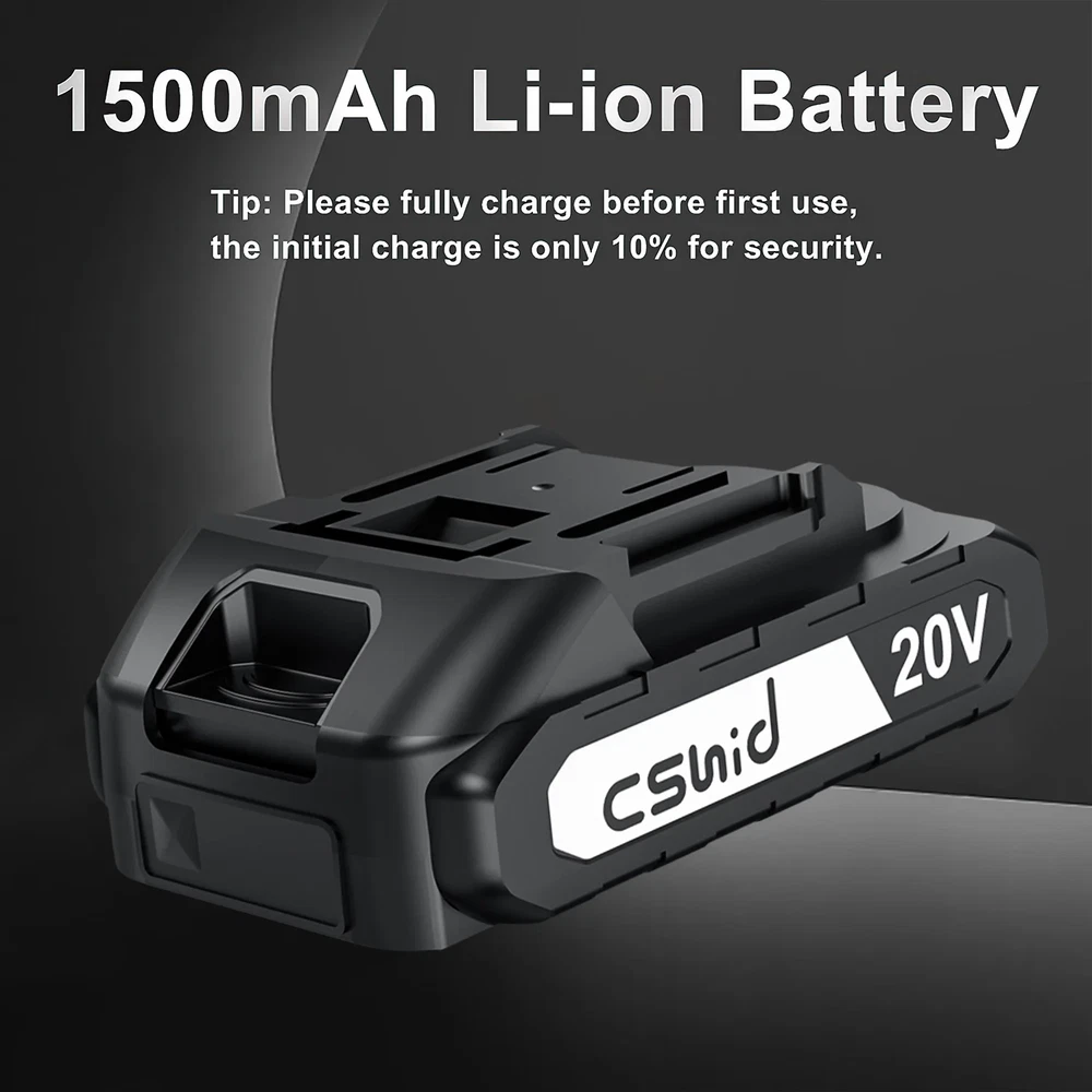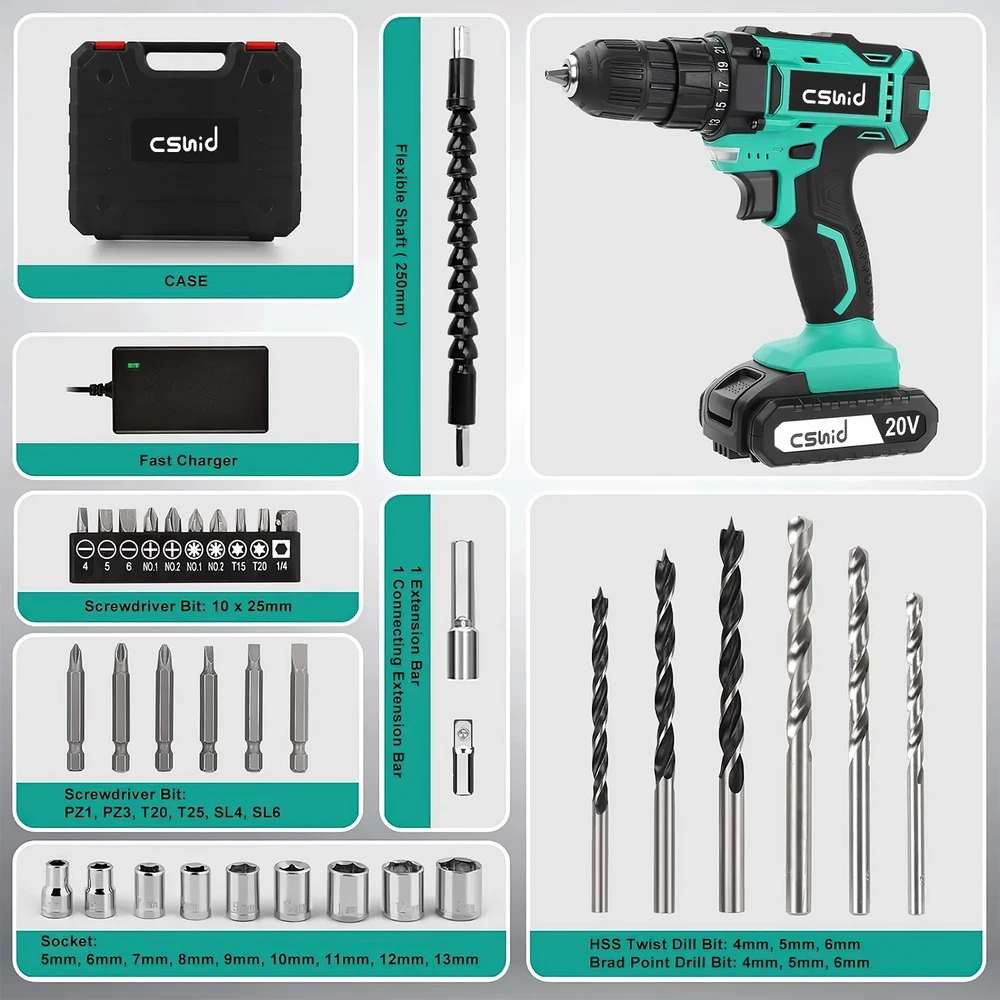 3/8” AUTO CHUCK, 25+1 CLUTCH & VARIABLE SPEED 25+1 Position Clutch: 25+1 torque (266In-lbs) settings provide precise control for driving in/out screws to prevent stripping, and drilling into wood, ceramics, drywall, plastics and even metal with ease. A 3/8” eyeless chuck serves you with an automatic spindle lock that enables your pair of hands to quickly change with great accessory compatibility. MULTI-PURPOSE with LED LIGHT LED light illuminates dark working areas. The F/R button can be adjusted for clockwise and counterclockwise rotation. A flexible shaft could be used in some places where driver bits are hard to reach. 2 Variable speed(0-350RPM and 0-1,500RPM)with electric brake function provides precise operation. 1500mAh BATTERY & ERGONOMIC DESIGN This electric drill set comes with a 20V 1500mAh Lithium-Ion batteries and 1pc 1-hour fast charger, helping you finish your job smoothly with long lasting performance. Compact and lightweight design with superior motors can increase efficiency and provide safety. Rubber-covered handle provides a comfortable grip and less vibration for you during heavy work. MORE POWER & RUNTIME The brushless drill adopts efficient brushless motor which delivers outstanding runtime and longer motor life than ordinary copper motor. The brushless motor does not need to change carbon brush and no sparks are generated during use. It's safer and more comfortable to use. Efficient Working A flexible shaft could be used in some places where driver bits are hard to reach; LED light illuminates dark working areas; Variable speed(0-1300RPM)with electric brake function provides precise operation. Specfication: Brand: CshidWorld Power Source: Battery Powered Maximum Rotational Speed: 1300 RPM Voltage: 20 Volts Amperage: 1.5 Amps Maximum Chuck Size: 10 Millimeters Special Feature: 2 Variable Speed Product Dimensions: 11.2"L x 9.8"W x 3.15"H Maximum Torque: 266 Inch Pounds Speed: 1300 RPM Battery Capacity: 1500 Milliamp Hours Item Weight: 5.19 pounds Package Included: 1 x 20V Cordless drill 1 x Battery 1 x Fast charger 3 x HSS Twist drill bits 3 x Brad Point drill bits 3 x Masonry drill bits 11 x Screwdriver bits 2 x Double-headed bits 1 x Flexible Hex Shaft 1 x Storage case 【20 Voltage & 2 Variable Speeds】 Higher voltage means more torque-spinning strength to overcome resistance. This 2 variable-speed ( 0-350 & 0-1300 RPM ) cordless drill with an adjustable clutch gives you the versatility for drilling different materials and using a variety of bits. The low speed is for driving screws, the high speed is for drilling holes. 【25+1 Position Clutch & 266 In-lbs Max Torque】 This cordless drill's clutch provides precise control for drilling, which helps to prevent sinking a screw too deep, stripping out the head of a screw or even breaking a screw shaft. 17-Torque allows for various applications and additional 1-torque for drilling. 【1500mAh Batteries & 60min Fast Charger】 20V 1500mAh Lithium-Ion battery packed with higher capacity indicator lets you finish your job smoothly with long lasting performance. 1.5A 1-hour fast charger keeps your drill constantly running. 【3/8” Keyless Metal Chuck & LED Work Light】 A 3/8-inch cordless drill accepts a wide range of bits, making it versatile for common tasks around the house. Drill has keyless chuck that you can tighten or loosen by hand. The Forward/Reverse switch allows you to either screw or replace/remove bits for your purposes. LED Light for increased visibility in enclosed workspaces and dark environment. 【23 Pcs Drill Bits Accessories & Compact Storage Case】 Our electric cordless drill/ driver kit with 23 Pcs accessories: 3 x HSS Twist drill bits, 3 x Brad Point drill bits, 16 x Screwdriver bits, 9 x Sleeves, 1 x Extension Bar, 1 x Flexible Hex Shaft. A storage case is suitable for home Improvement & DIY Project.