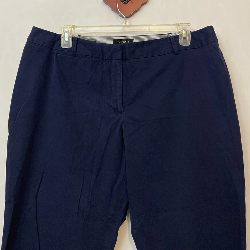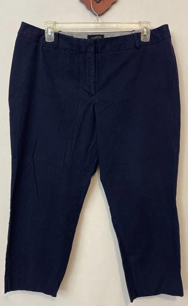 Elevate your casual wardrobe with these stylish Talbots Heritage capri pants. The blue pants feature a solid pattern, zip, button, and hook & eye closure, and belt loops for added detail. The flat front and straight leg style provide a classic and timeless look, while the spandex and cotton material blend ensures comfort and stretch for all-day wear. These plus-size pants are perfect for any casual occasion, and the elastic and adjustable waist provide a flattering fit. The pants also feature pockets and are made with breathable fabric, making them a practical addition to any wardrobe. Add these classic capri pants to your collection today! One back button needs replaced. Inseam: 25 inches. Waistband: 20 inches across laying flat.