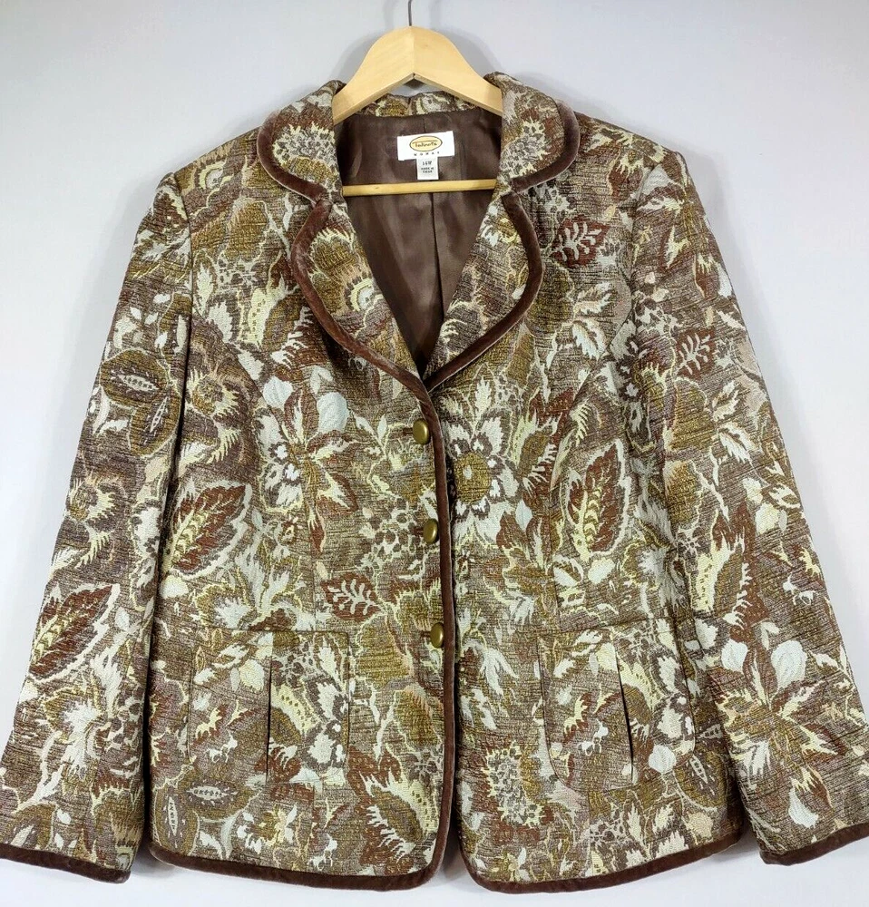 Talbots Jacket Women 14 Brown Jaquard Tapestry Velvet Trim Lined Short Button Up Long Sleeve Collar Looks great with jeans 28" Length back of neck to hem 23" Underarm to underarm 24" Sleeve length shoulder to cuff. CONDITION: Excellent pre-owned condition. Never worn. View gallery to see item and condition. RETURNS accepted; item must be returned within 30 days in original condition to receive a full refund. SHIPPING & HANDLING: We ship all packages within five business days from Monday through Friday except Holidays. Consolidated shipping is available upon request. Thank you for helping our planet and buying previously owned and loved items. I am grateful for your business. Enjoy! Check out our store and follow us on eBay. There are new listings daily! 10BB-4452 Disclaimer: While we make every effort to capture the most accurate depiction of every item when photographing, colors may vary from screen display to in person therefore we cannot guarantee "exact shade" on any item. Message us if you have questions.