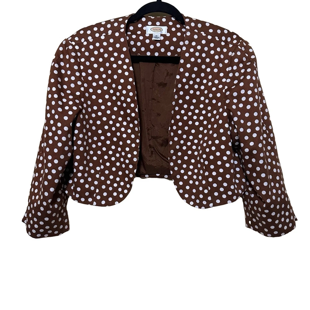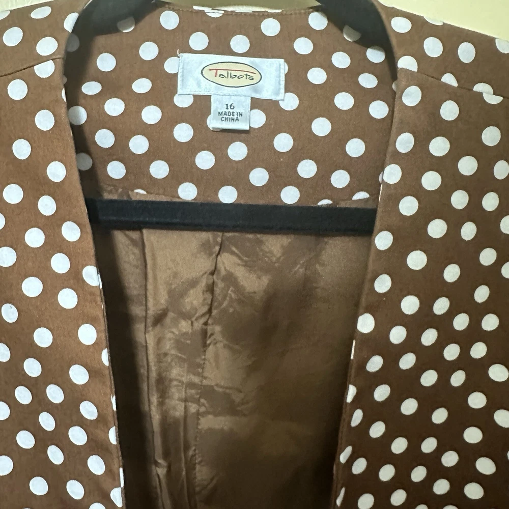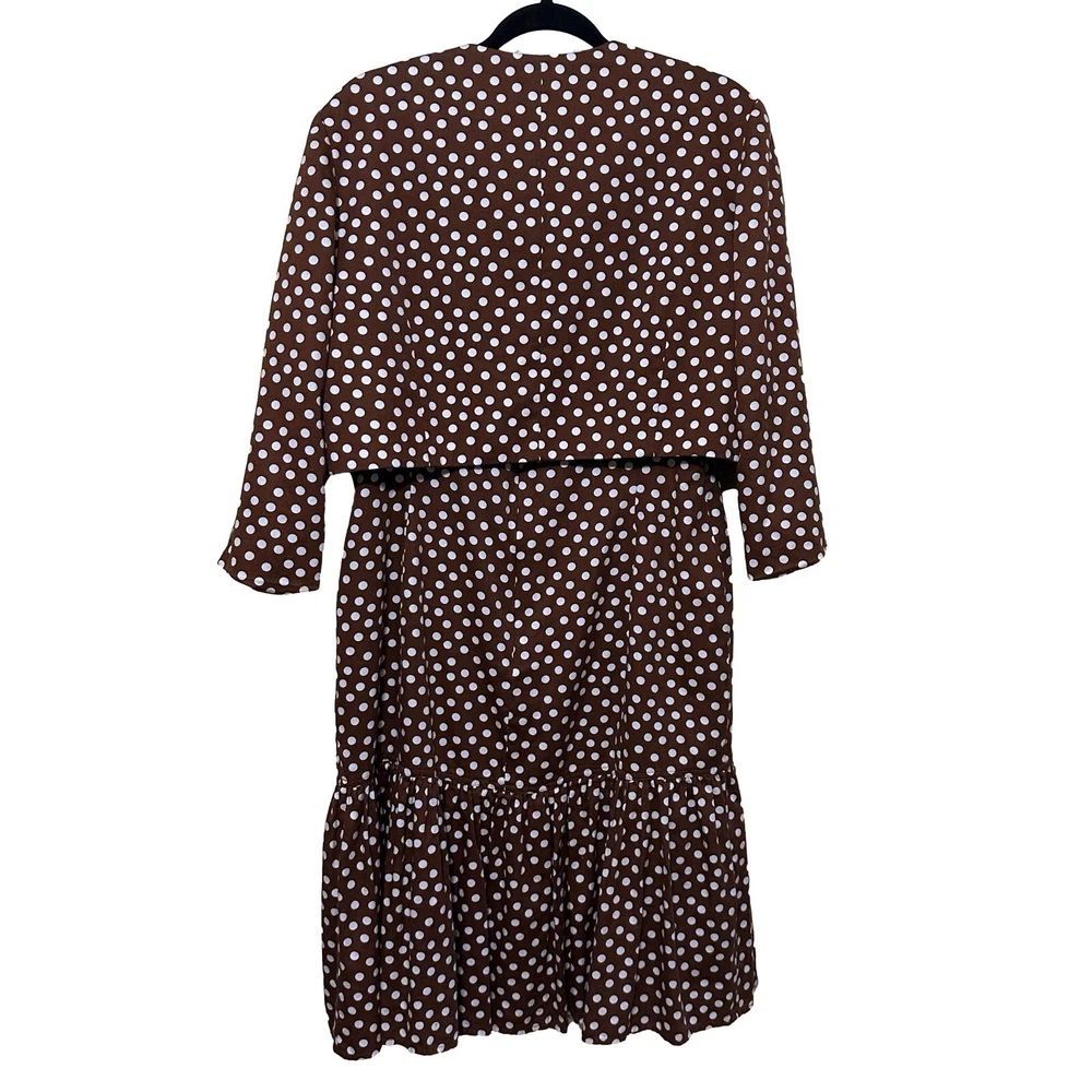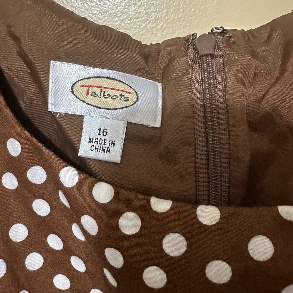 Talbots Women’s 16 Brown Polka Dot Peplum Dress Shrug Set 50s Pinup Retro Modest Good pre-owned condition, pale pink marks on one shoulder of dress. Approximate flat lay measurements: Dress length-41” Bust-19.5” Hip-18.5” Shrug length-17” Bust-18” Sleeve-18” This gorgeous Talbots dress is a must-have for any fashion-conscious woman. The brown polka dot pattern adds a touch of retro charm, while the 3/4 raglan sleeves and peplum detail give it a modern twist. The round neckline and zip closure make it easy to wear, and the knee-length fit and flare style is perfect for any occasion, from casual outings to formal events. Made from 100% cotton knit fabric, this dress is both comfortable and stylish. It comes in size 16 and is suitable for women of all ages. With its versatile style and high-quality construction, this Talbots dress is sure to become a favorite in your wardrobe. Whether you're dressing up for a wedding or holy communion, or keeping it casual for a party or cocktail event, this dress has got you covered. So why wait? Add this stunning piece to your collection today!