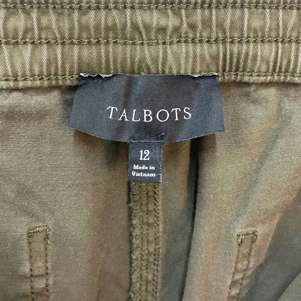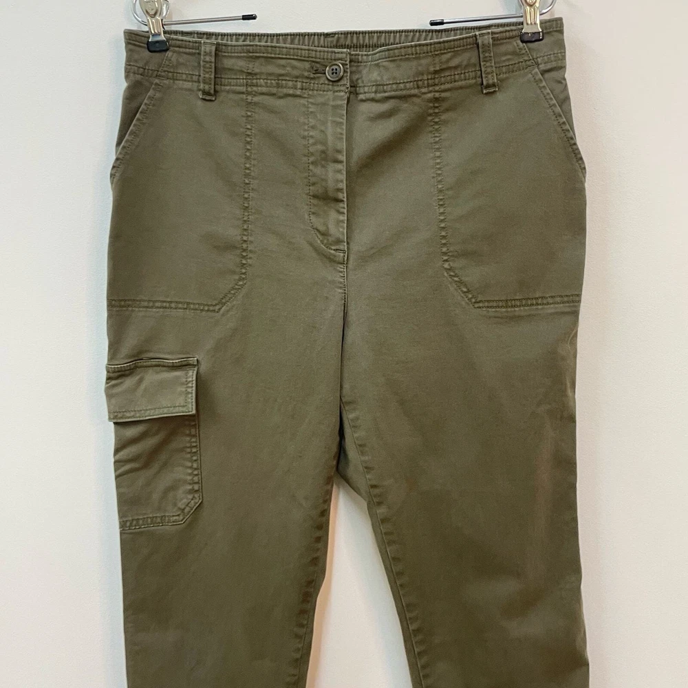 Talbots Women's Olive Green Cotton Stretch High Rise Slim Leg Cargo Pants Olive/Army green Front and back pockets One side cargo pocket Flat front Elastic waist in back Cotton-spandex blend Waist- 16" across Rise- 11.5" Inseam- 27" *Excellent preowned condition