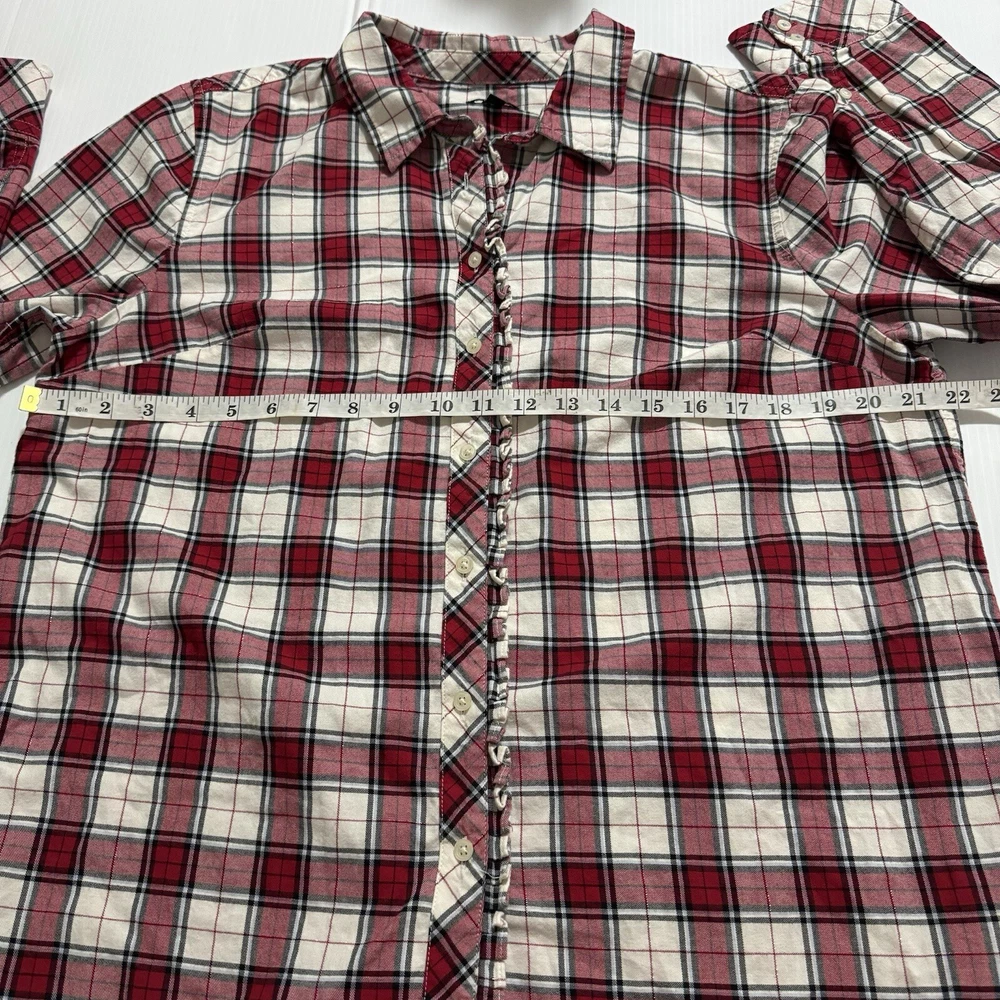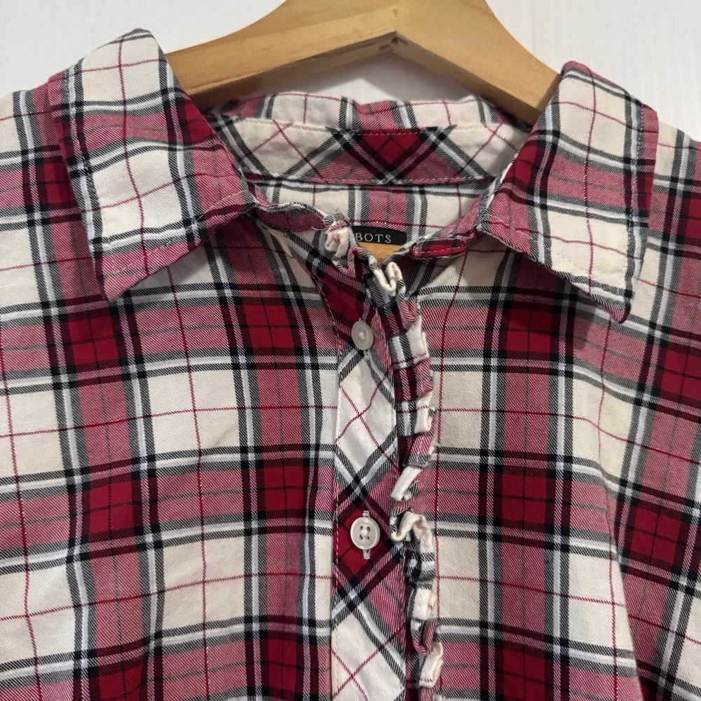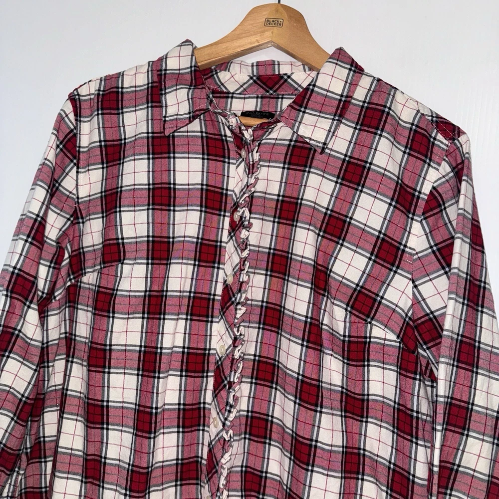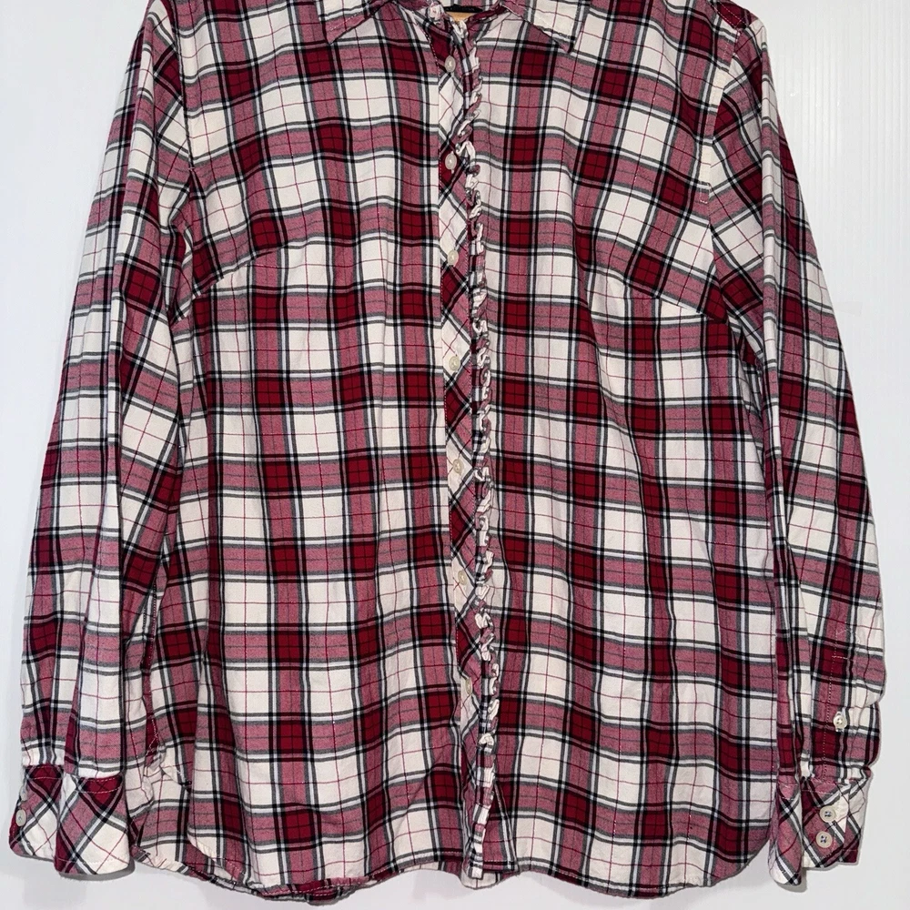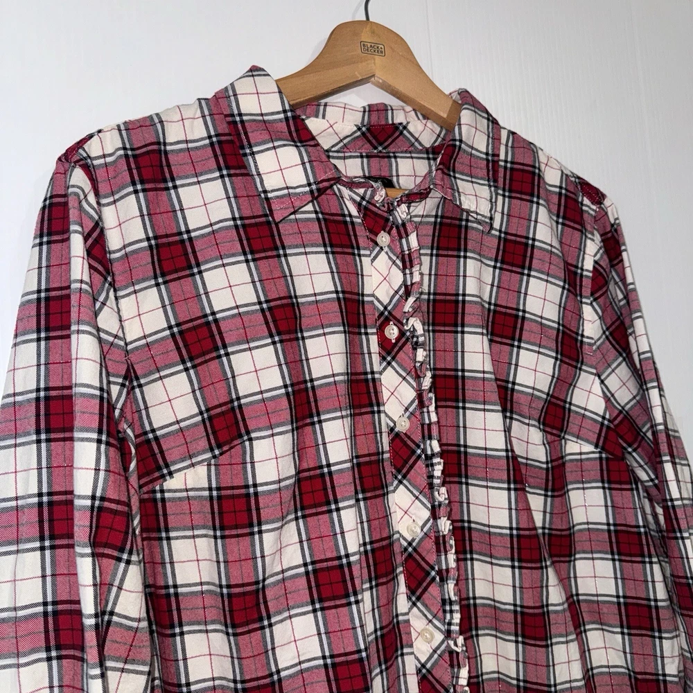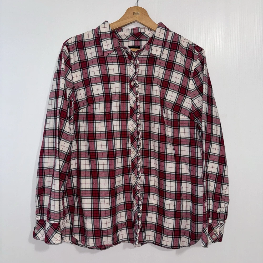 Talbots Women’s Plaid Button Front Flannel Shirt Ruffle Metallic Red White XLp Please see all photos Used good condition, with signs of use Note: Please take into account the measurements in the photos are approximations, you must be sure of your sizes. Please view all photos carefully before making any purchase. Shipments are made the same or next day on business days. Any questions please ask