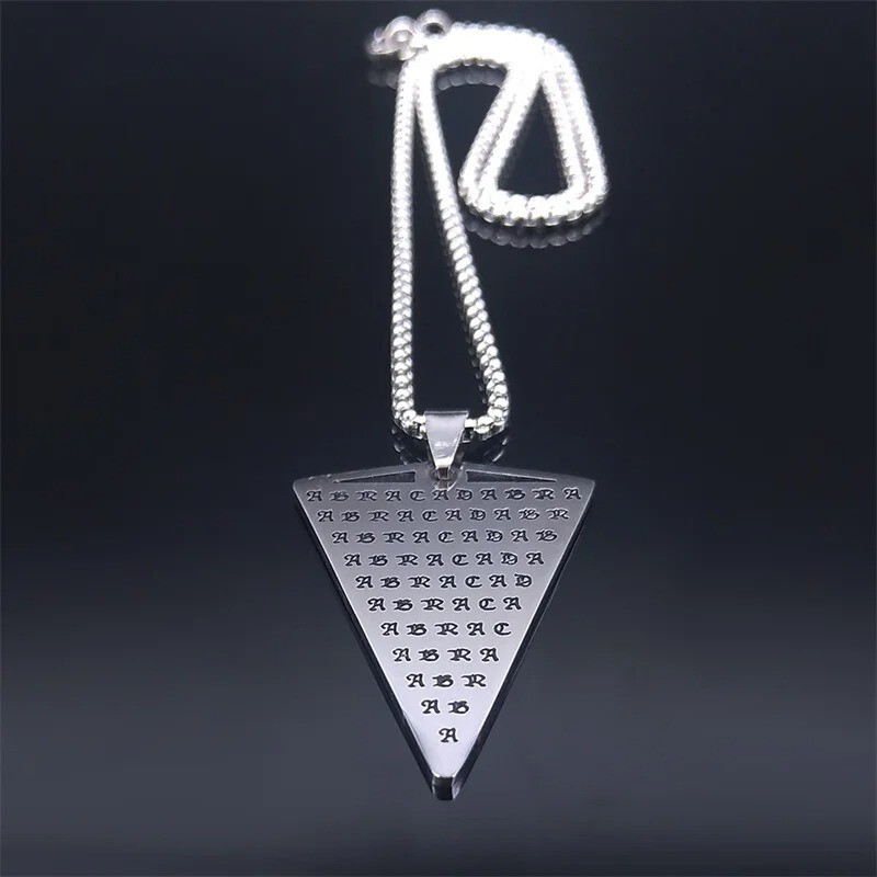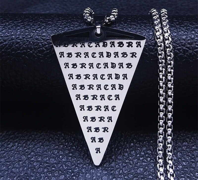Inverted triangle in which is engraved the famous magic formula of Aramaic origin : ABRACADABRA from the practical Kabbalah. It consists of the Hebrew words: baraq=lightning and davar=word, incremented by three aleph, at the beginning, in the middle and at the end. Abracadabra is therefore detailed in Hebrew: Aleph Beth Reysh Qof Aleph Daleth Beth Reysh Aleph. A very powerful formula. Pendant width: 29mm Pendant height: 41mm Necklace length:50cm