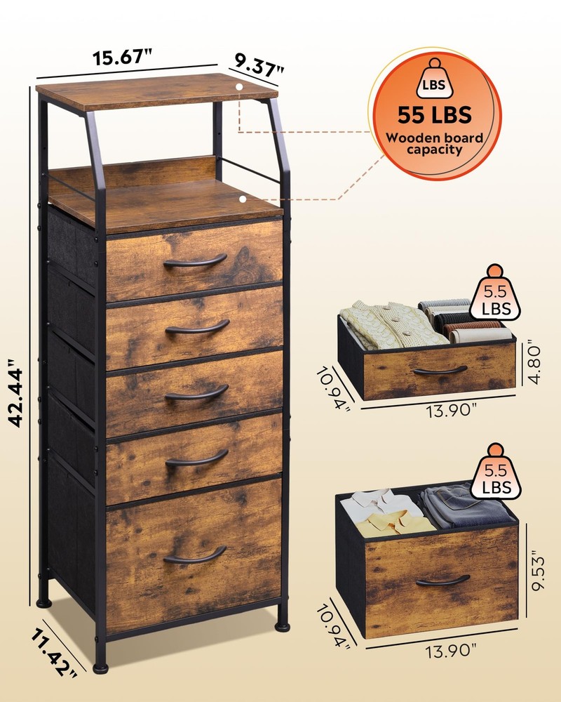 The brown nightstand features 5 fabric drawer and 2 open storage shelves making it suitable for placement in bedroom, living room, and can be used as college dorm essentials for girls. The tall dresser is sturdy and functional. You can use it as clothes organizer or bedroom nightstand. [5 Fabric Drawers for Organized Storage] This tall fabric dresser features 5 drawers, ideal for storing clothes, toys, or essentials. Perfect as a nightstand organizer or tall dresser for bedroom or living room use. [Open Shelf for Display & Storage] With a spacious surface (9.37 x 15.67 inches), this slim nightstand fits lamps, cups, or decor. The open shelf holds baskets or photo frames, adding functionality and charm to your space. [Versatile Design for Any Room] This 5 fabric drawers night stand complements modern or farmhouse decor. Use it as a bedside table, desk organizer, or entryway storage. [Durable & Stable] Built with a sturdy steel frame and X-shaped back support, this fabric dresser ensures stability. Adjustable feet protect floors, and EPA/GCC certifications guarantee safety. [Easy 20-Minute Assembly] Includes all tools and instructions for quick setup. This nightstand table is simple to assemble. For assistance, our customer service team is always available!
