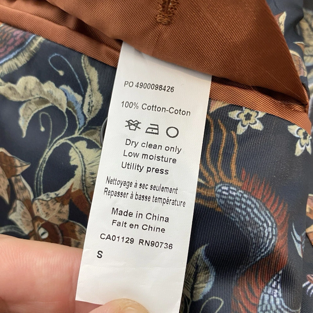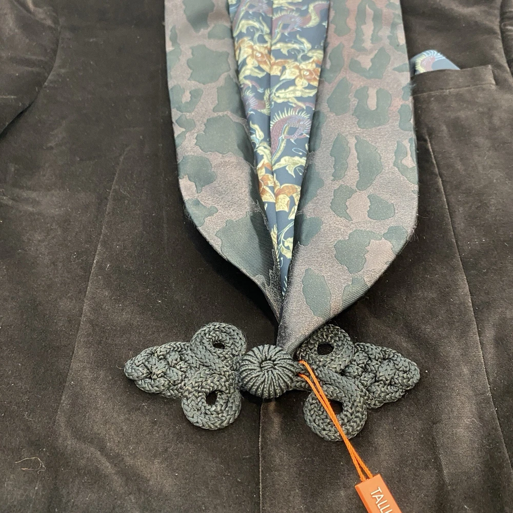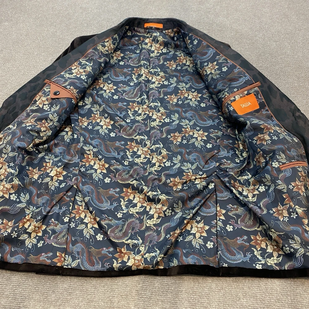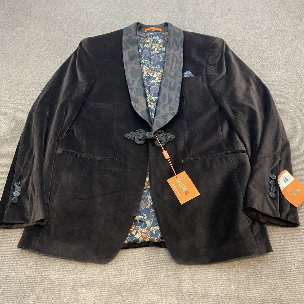 Season: Fall, Spring, Summer, Winter Personalization Instructions: No Department: Men Style: Tuxedo Number of Pieces: 1 Piece Material: Cotton Jacket Front Button Style: One-Button Theme: Modern Features: Inner Pockets Brand: Tallia Color: Brown Vintage: No Personalize: No Garment Care: Dry Clean Only Occasion: Casual Type: Blazer Pattern: Solid Front Type: Flat Front Size Type: Regular Size: S Fabric Type: Velvet Jacket/Coat Length: Regular Handmade: No