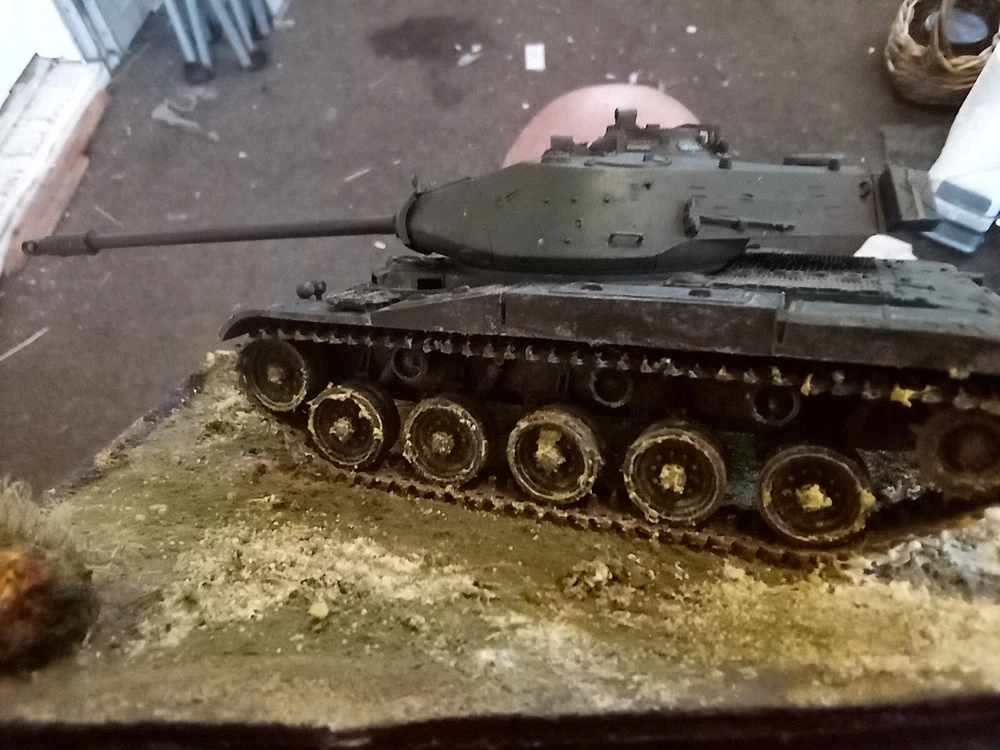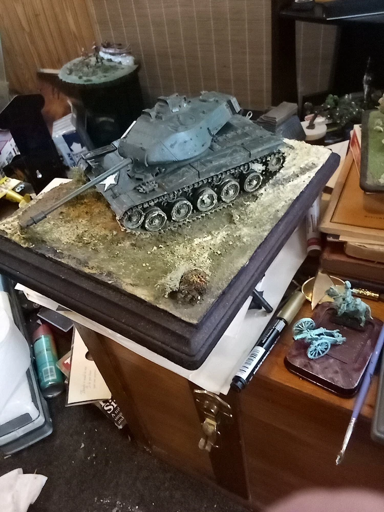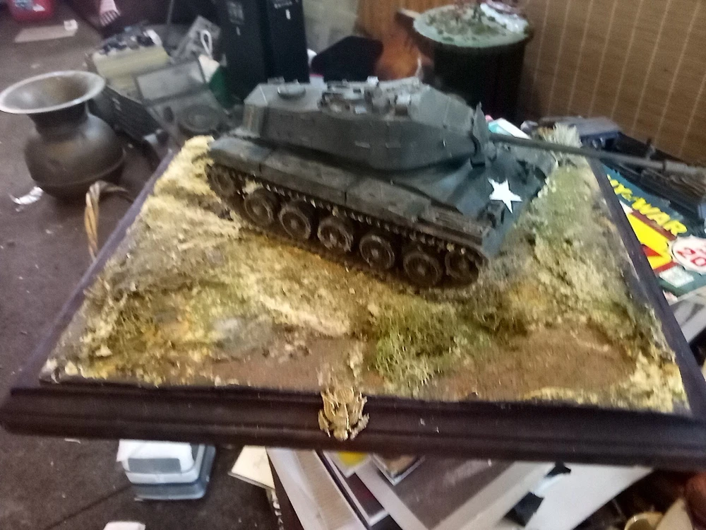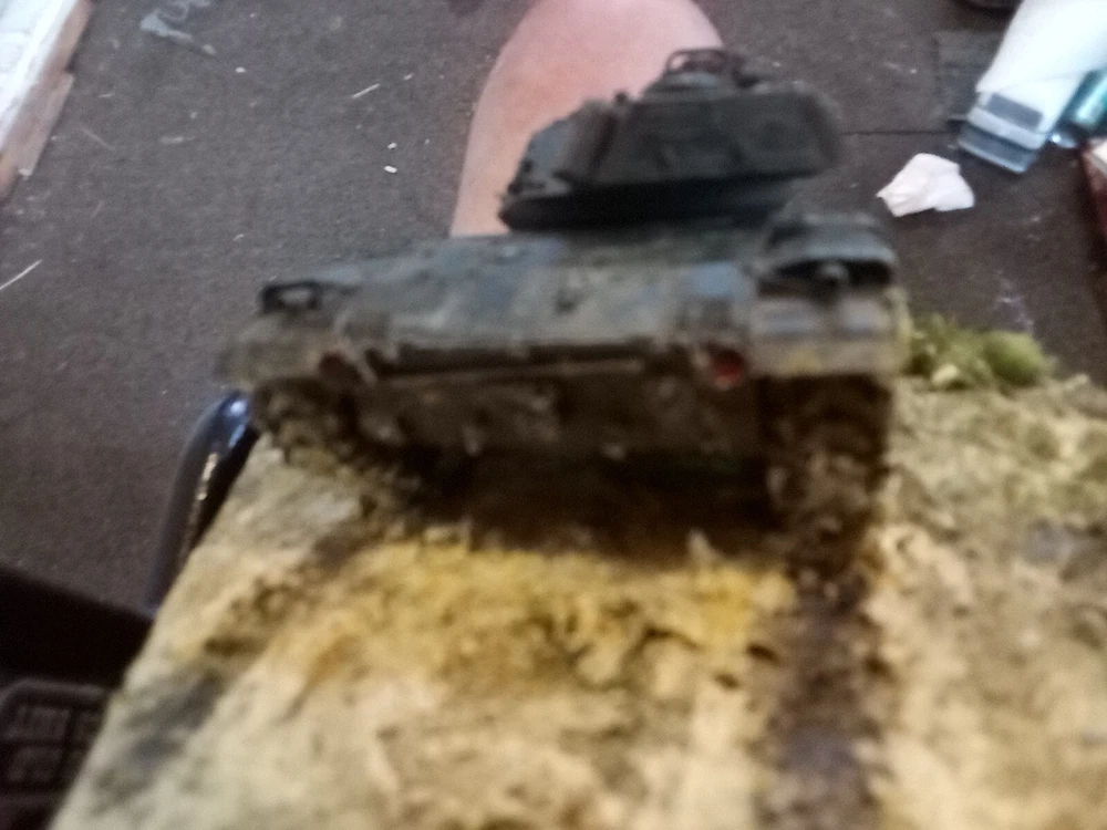 Custom built diaroma. Moveable turret, opening hatch. Weathered and terrian depicts muddy environment and/or setting. Aesthetically pleasing with Army Emblem embellishment affixed to the base.