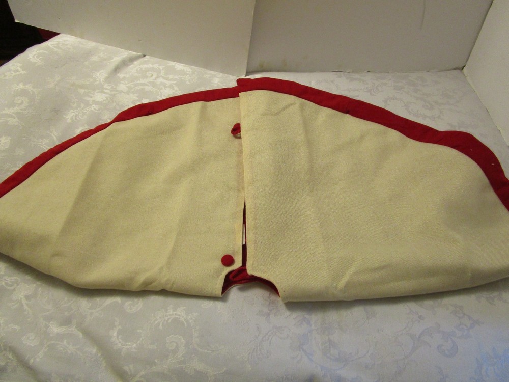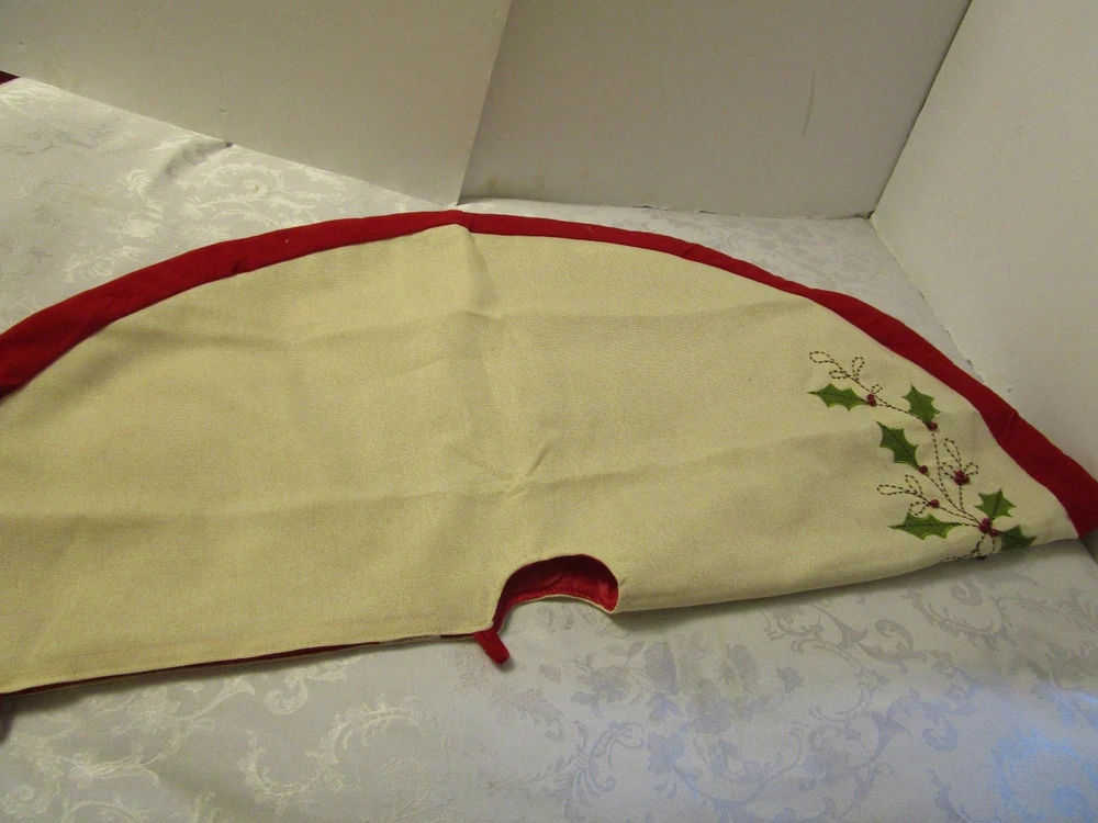 Description:2-20-18-1 Elegant Christmas tree skirt is made out of tan linen, red trim and red satin lined fabric underside. It has an applique of holly leaves & berries that extends into a beautiful scroll design and has a 2 red button and loop closure. It is fully lined. This tree skirt is quality-made and will last for years! •Size: 48" •Shape: Round •Color: Tan Linen (lined) •Trim Color: Red Great pre-owned condition- no rips holes or stains – please view all pictures as they are part of the description I DO MY BEST TO DESCRIBE EVERY LISTING BUT I AM NOT AN EXPERT AND ITEMS ARE SOLD “AS IS”. My idea of great/good may be different than yours, so EXAMINE PHOTOS CAREFULLY since they are binding and a supplement to the word description in case I should miss something. If I fail to mention something, it does not qualify as “item not as described” if it shows in my pictures. EACH PHOTO IS WORTH A THOUSAND WORDS AND THEY ARE OF THE EXACT ITEM YOU WILL RECEIVE. RETURN POLICY: Returns are acceptable ONLY if the item doesn’t match the description, is defective, or grossly misrepresented. THIS MEANS I DO NOT ACCEPT RETURNS for FIT, SIZING, COLOR ISSUES, OR BUYER'S REMORSE. Please zoom and view ALL pictures for more details as they are part of the description. Email me with any questions you may have. Please note: Buyer pays for ALL shipping and fees. If you use an eBay shipping label, it will be deducted from your refund amount. FEEDBACK : If you are satisfied with your purchase, I would love to get positive feedback from you. I will then do the same for you!