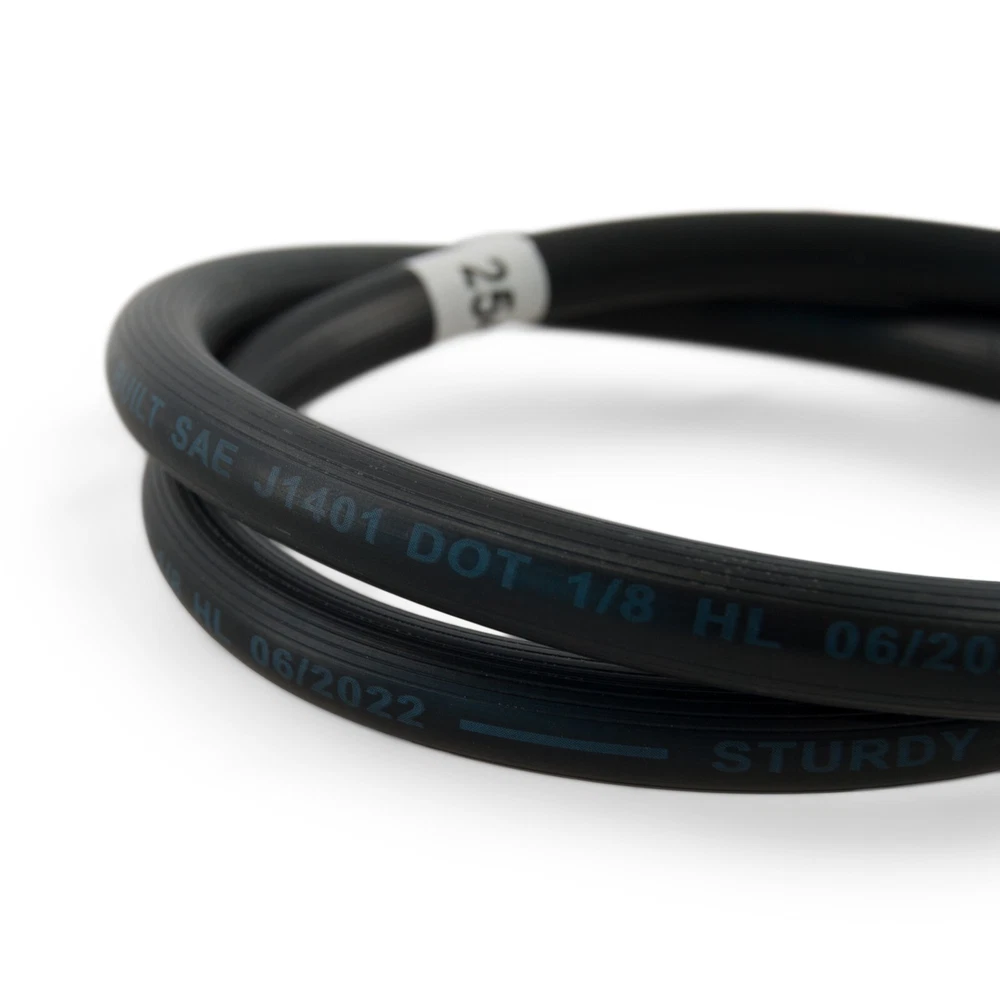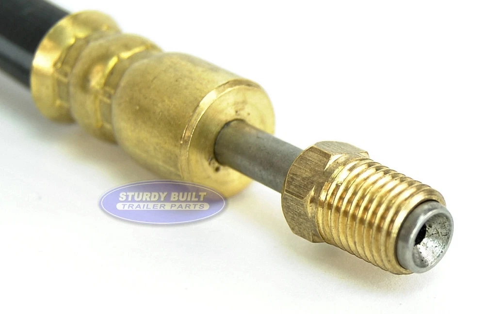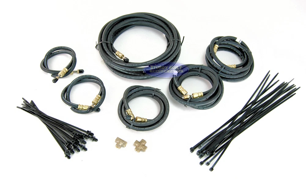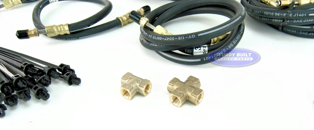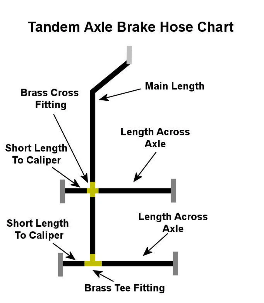 This is a trailer brake line kit put together to outfit a longer than standard tandem axle boat or utility trailer with the appropriate brake lines to install Disc or Drum brakes. This Brake Line kit features longer lengths of brake hoses than the standard kit. This is to outfit a larger tandem axle trailer. This kit simplifies the process of mounting hydraulic brake lines to your trailers frame. Whether you have a leaf spring axle, or torsion axle, this Brake Hose kit will outfit your trailers disc or drum brake system. This kit uses Distributor DOT Flexible Rubber trailer brake hoses for each length needed. Using these hoses ensures that your brake hoses will not crack or wear, which would cause pre-mature failure. These are not steel lines, which will rust. Each brake hose is UV rated to prevent sun damage. In addition, these hoses have two male Brass Inverted 3/16" fittings with stainless steel flares that use 3/8-24 thread, which will fit most trailer disc brake calipers, wheel cylinders, master cylinders, and solenoid valves. The swiveling ends of these brake hoses prevents twisting of the hoses during installation and provides more room for tools. Distributor Brass hose fitting ends also provide 40% more thread contact than other competitive hoses, yielding a more secure connection and leak proof system. Different trailer Manufacturers have used different ways to mount brakes hoses to trailers over the years. If you are starting from scratch, then this is certainly the simplest method to install brake hoses onto your trailer. We have made the routing of the hoses simple and effective. Refer to the Chart Picture above to see the routing system for your brake lines. This style of Brake Line kit eliminates zinc plated and steel hardware which will certainly rust, especially in corrosive environments like saltwater. Regardless of your brand of boat trailer, this brake hose kit is great for your use. When installing your kit, if any length is slightly longer than needed, simply loop the brake hose in the down ward direction. Looping in this way is ideal and does not effect the performance of your brake system. Kit Includes: (1) 24 ft Trailer Brake Hose (1) Brass Cross Fitting (1) Brass T Fitting (2) 24" Trailer Brake Hose (2) 86" Trailer Brake Hose (1) 3 ft Trailer Brake Hose (15) Push Mount Screw In Cable Ties (15) Standard Cable Ties eBay item # 351230155672