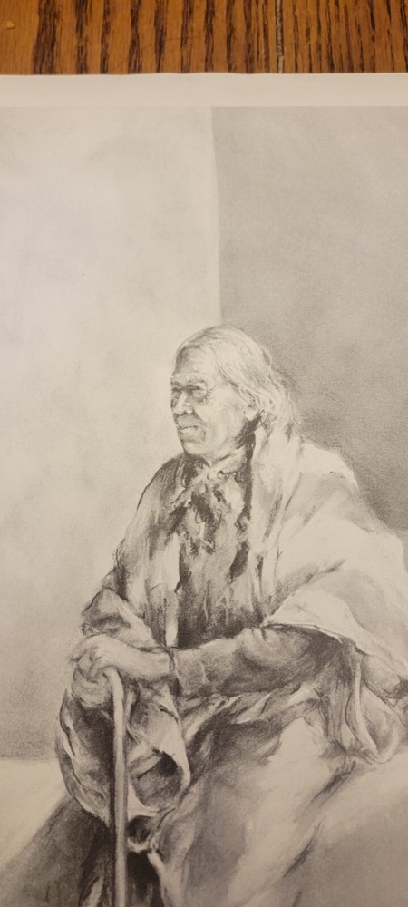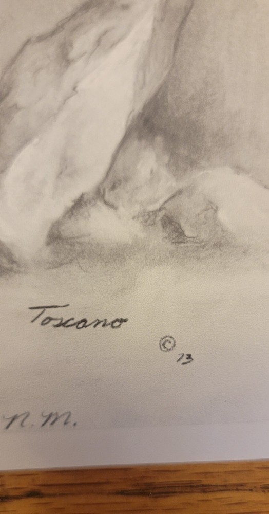 This beautiful print by Dee Toscano depicts a Taos Indian Native American deep in thought. Created in 1973, this charcoal sketch on paper measures 12 inches in height and 18 inches in length. The print is unframed and is a reprint of the original. The piece showcases traditional Taos culture and the beauty of the American Indian. It is a great addition to any art collection and is perfect for those who appreciate contemporary art produced in the 1970s. This print is a medium-sized piece. It is printed on high-quality paper and is a great representation of the Taos people. See pictures for details