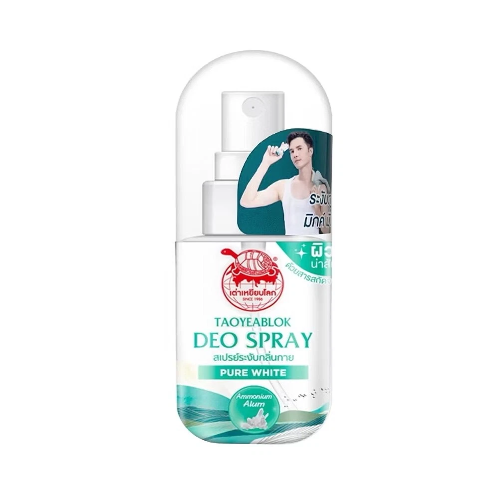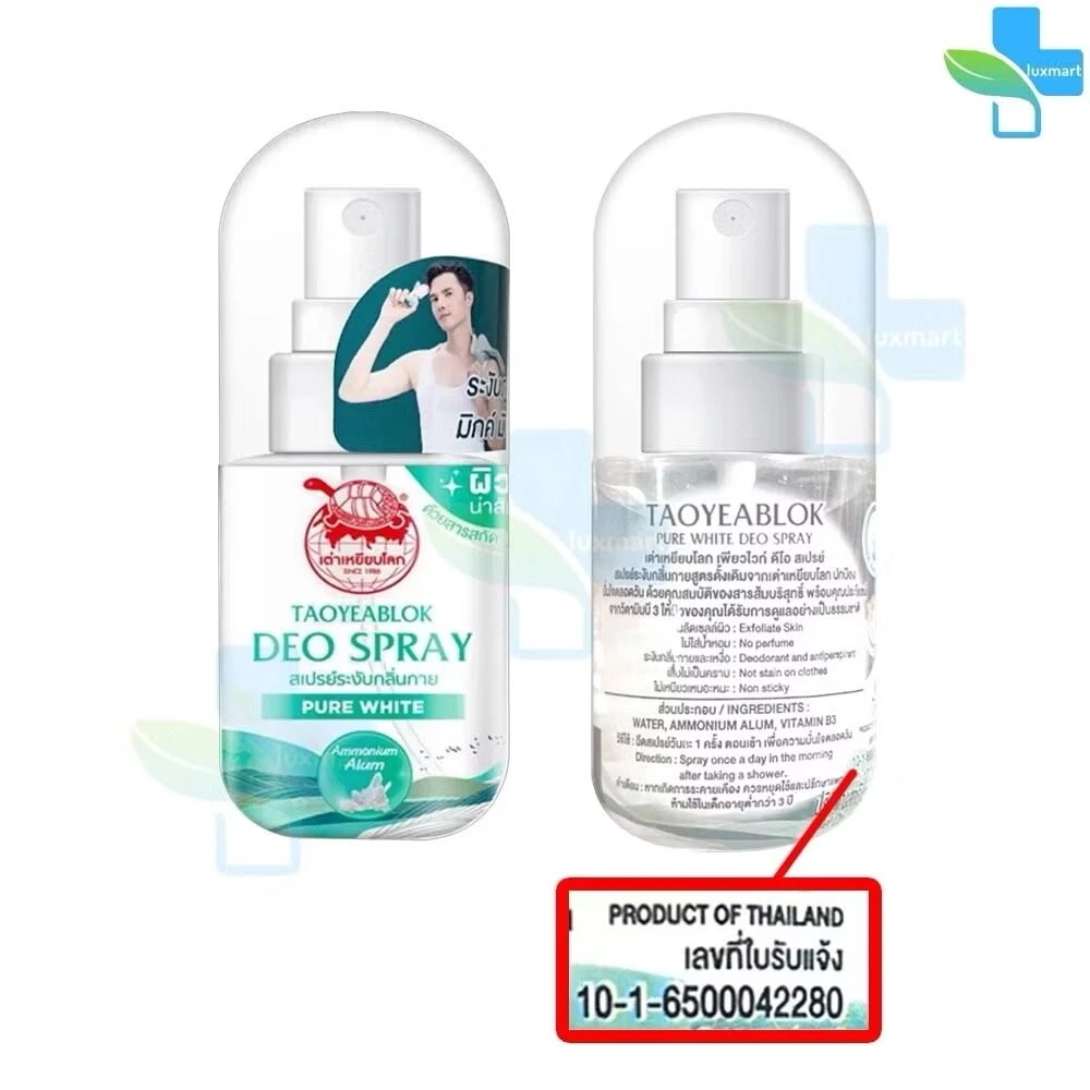 Taoyeablok Pure White Deo Spray 50 ml. Taoyeablok Pure White Deo Spray • Brightening formula, gentle to the touch • Mixed with vitamin B3, gentle on the skin • Made from natural ingredients • No stains on clothes • Skin looks bright and clear • Long-lasting deodorant • Not sticky • 100% alcohol-free Ingredients: 100% alum, vitamin B3 How to eat/use: Spray lightly on the armpits after showering Contraindications/Warnings: If irritation occurs, stop using and consult a doctor. License number Registration number 10-1-6500042280