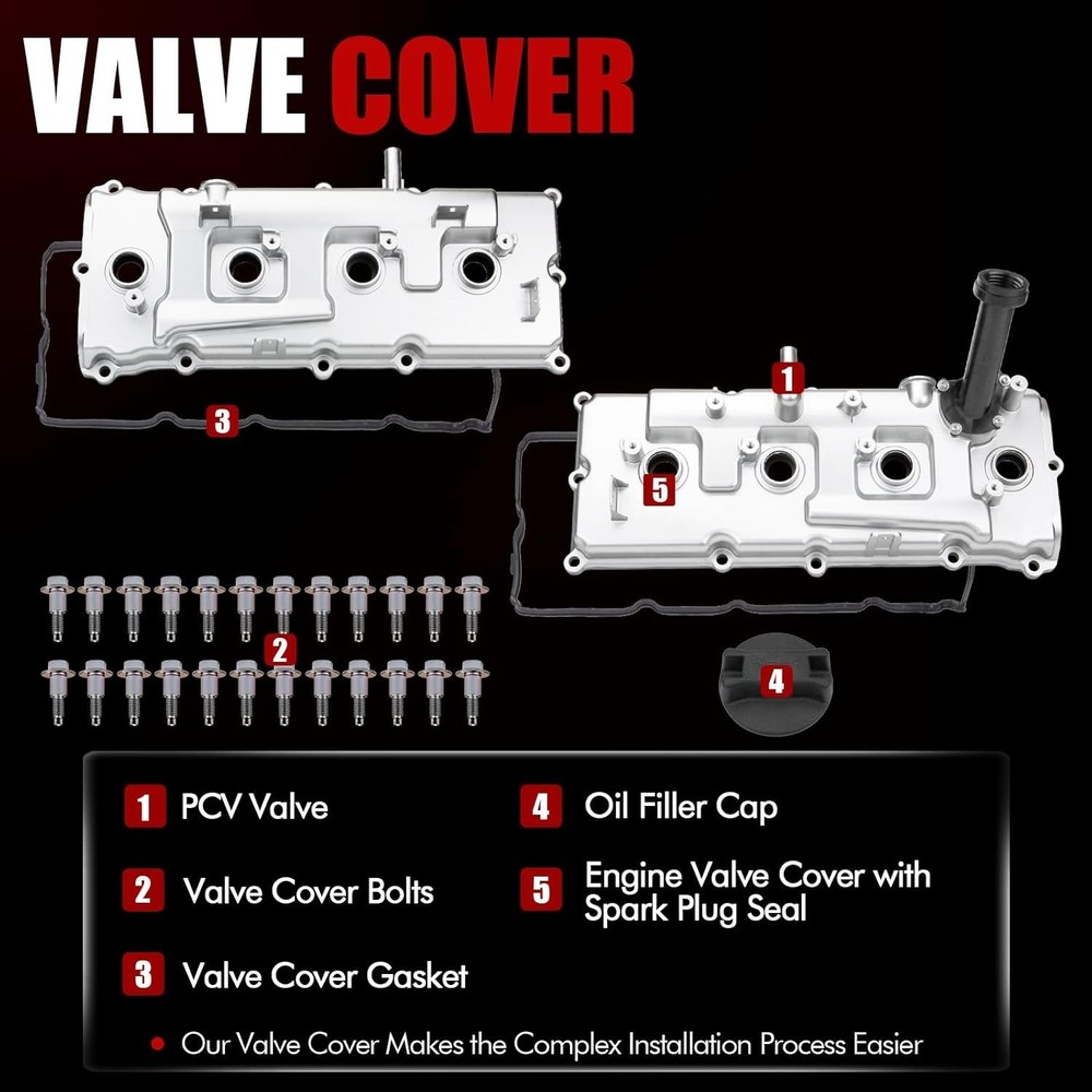Tapa de válvulas de aluminio completa con pernos, tapa de aceite y válvula Pcv US Tapas de válvulas izquierda y derecha para Armada 2005-2015, Pathfinder Armada 2004, Pathfinder 2008-2012, Titan 2004-2015, NV2500 NV3500 2012-2017, QX56 2004-2010 Reemplazo para los números de pieza: 13264-ZE01A 13264-ZE00A Disponible en rojo Juegos completos de tapas de válvulas con pernos, tapón de aceite, juntas de tapa de válvulas, sellos de bujías y válvula PCV. Fáciles de instalar y listos para usar. Para motor Nissan VQ56DE V8 de 5.6L. Este juego de tapas de válvulas es específico para cada año. Por favor, verifique el ajuste cuidadosamente antes de realizar su pedido.