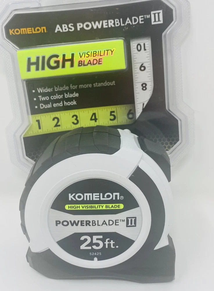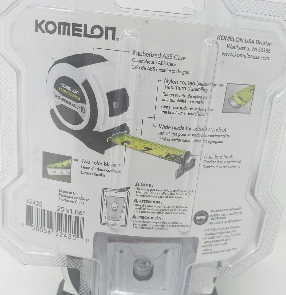 This high-quality tape measure from Komelon USA is a must-have for any DIY or professional project. Measuring 25 ft in length, this Powerblade II model features a wider blade for increased accuracy and visibility. Its durable construction and reliable brand make it a top choice for any job. Made in Vietnam and designed with precision, this tape measure is perfect for home and garden projects, as well as measuring and layout tasks in workshop settings.