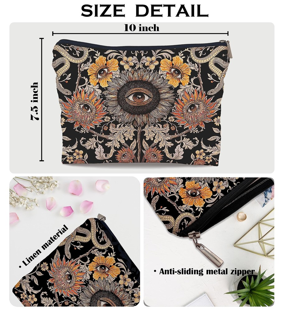 Ayxvt Tarot Evil Eye Sunflower Hippie Snake Vintage Flowers Floral Cosmetic Bag Decorative Women's Makeup Bag Zipper Pouch Travel Toiletry,Gifts for Tarot Lovers Women Teen Girls PERFECT SIZE: The makeup bag is 10 x 7.5 inches which is suitable and enough to carry daily makeup tools such as lipstick, foundation, eye shadow, perfume or other small items.Perfectly for daily use. PREMIUM MATERIAL: Our cosmetic bag is made of high-quality linen fabric with a metal zipper.It is soft and durable, the sturdy zipper can keep your beauty products in place. UNIQUE DESIGN: We have designed a variety of patterns and slogans to fit your individual needs. Every cosmetic bag looks interesting and let your personality be displayed. It is Double-sided printed, adopted Exquisite patterns and script writing. MULTIPLE UASAGES:It is not only a simple makeup bag but also can be a small shopping bag, coin purse, toiletries bag or other sundries bag. It can be used in various scenarios in everyday life for your headphones, cell phone, sunglasses and keys. Extra portable, especially for traveling. IDEAL GIFTS: Our makeup bag can make you stand out from the crowds. This is a perfect gift to Valentine's Day, Mother's Day, birthdays, Christmas,Teachers’ day, Nurses’ day share with your boss lady teacher best friends mom sister teacher wife sister grandmother nana..... SHIPPING Domestic Buyers - We have confidence in our products, but if you are not fully satisfied please contact us within 30 days of purchase and you will get full refund. - We ship within 3 business days of payment, usually sooner - We offer FREE shipping on all orders! - We only ship to the lower 48 states, no APO/FPO addresses or PO Boxes allowed International buyers – please note: Import duties, taxes, and charges aren't included in the item price or postage cost. These charges are the buyer's responsibility. - Please check with your country's customs office to determine what these additional costs will be prior to bidding or buying. * Order Cancellation Policy ** You can return a product for up to 30 days from the date you purchased it. 1. The seller reserves the right to cancel the special case only due to eBay cancellation fee. 2. The decision of seller is the final. 3. The seller will respond to the cancellation request within 2 business days. Please wait for the result of cancellation. 4. In case the cancellation is not completed by some reasons, the buyer can follow the options below to get the refund. 4.1 The buyer can reject the item when it arrives. 4.2 The buyer can send the item back to the seller within 30 days If the buyer receives item (USA Shipment ONLY). The seller will provide the FREE return label to the buyer when the buyer opens " Return Item" case on eBay by using the reason as "Change my mind" ONLY. 5. When buyer has placed the order. The order will be processed and completed by automatic warehouse system within 5 minutes. In case that buyer sends the cancellation request after 5 minutes of placing the order, the request will be rejected. **Sending direct message to cancel the order is not allowed for every case.* Return Policy For the return case - If buyer would like to return the items for refund or replacement, please CONTACT SELLER to receive the free return label from seller. The refund or replacement will be processed with the tracking number of return label which is provided by seller only. The other ways of return which are not approved by seller will not be processed for the refund or replacement.